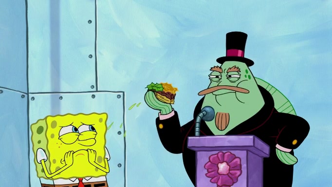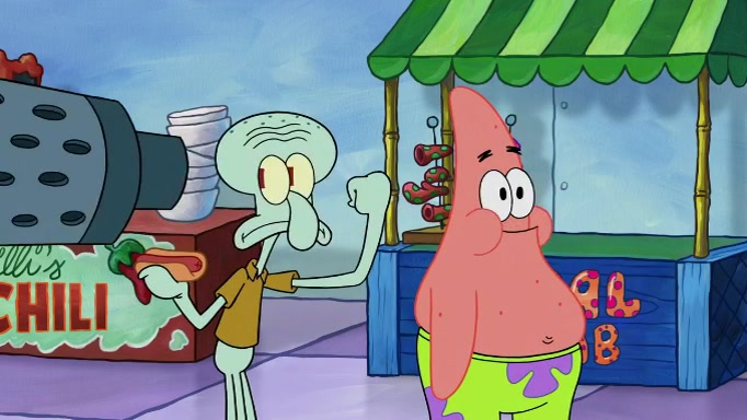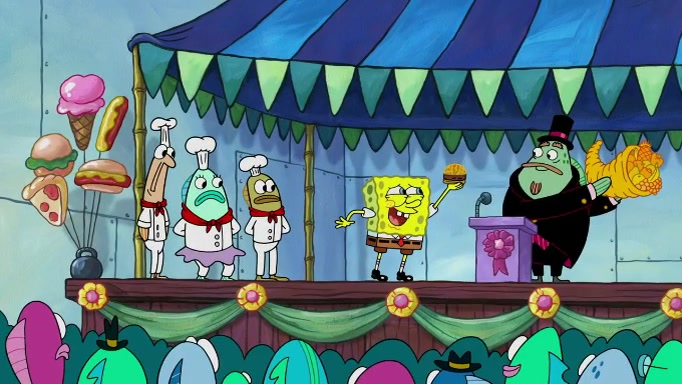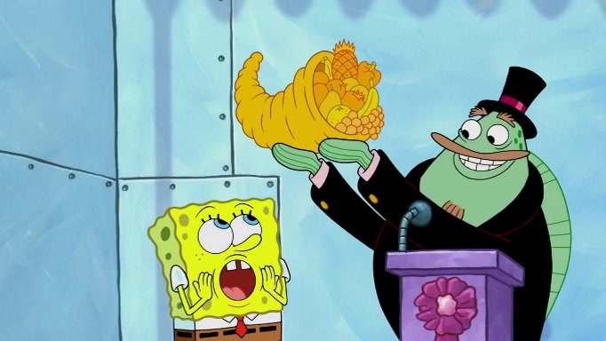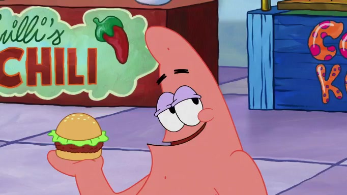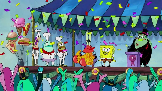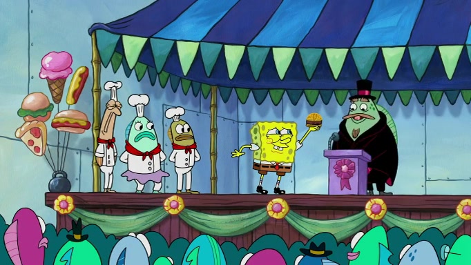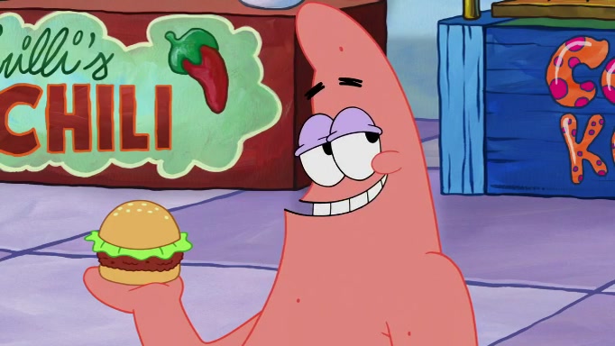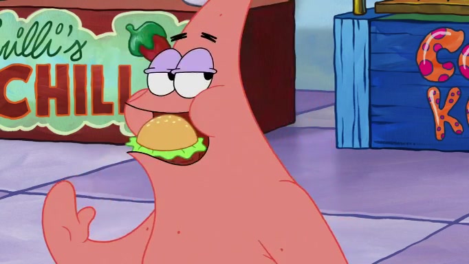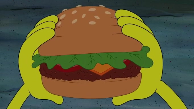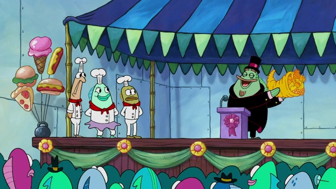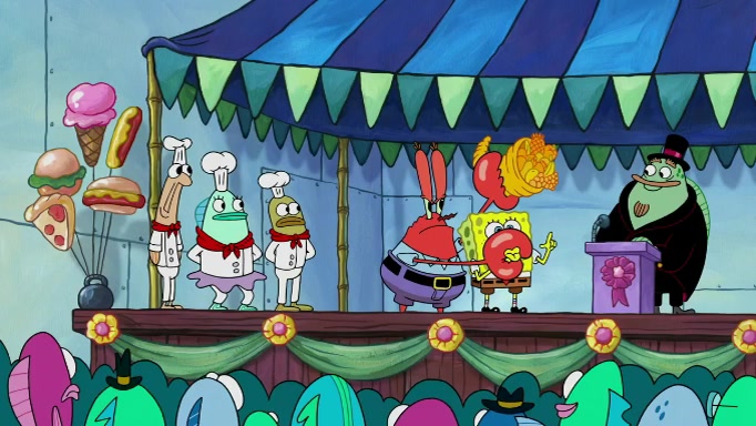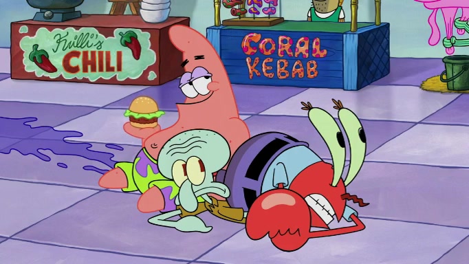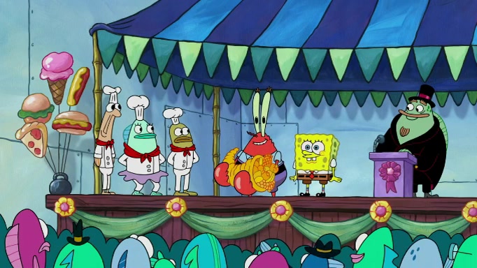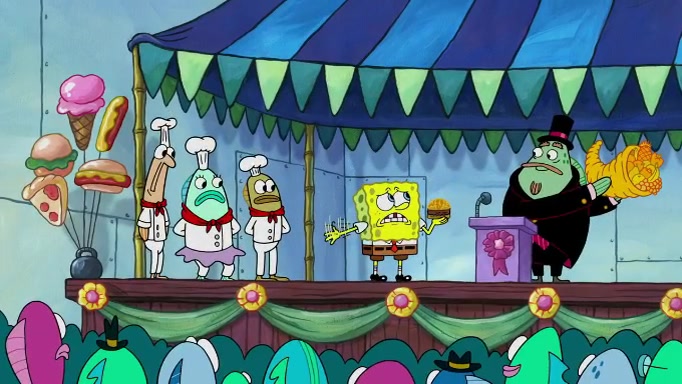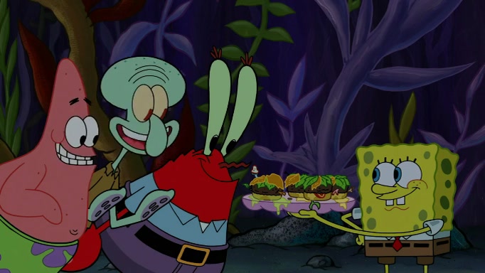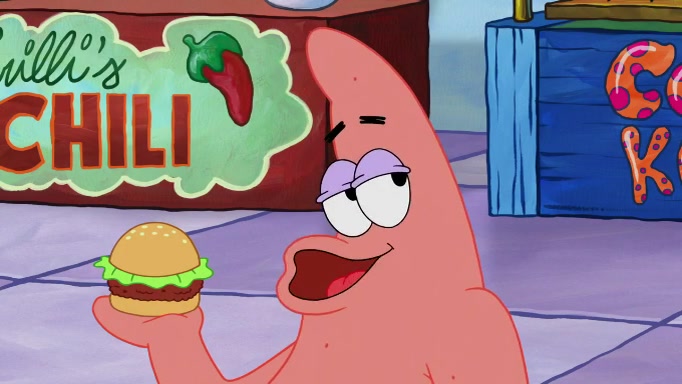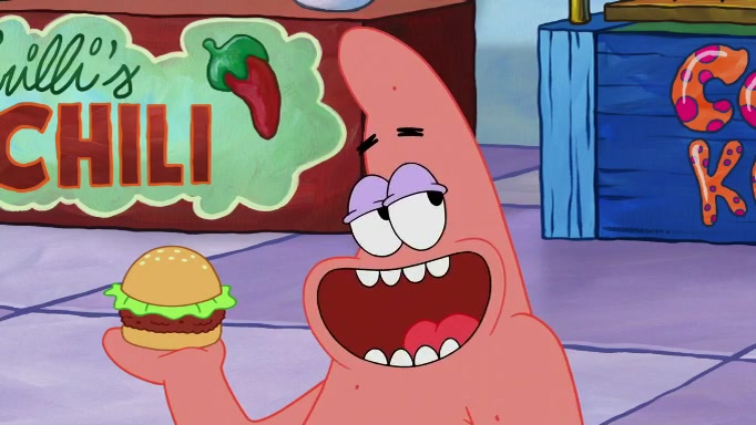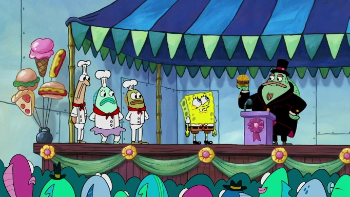 SpongeBob manages to outrun them and fight his own urges to eat it and makes it to Food Con. However, Mr. Krabs, Squidward, and Patrick are still chasing him for the Krabby Patty and SpongeBob makes it inside. SpongeBob hands over the Krabby Patty to the Mayor, but upon closer inspection, it's actually one of the Nature Patties from before. Patrick somehow switched the real Krabby Patty with the fake one and eats it. Fortunately, the Mayor ends up enjoying the Nature Patty and rewards the Golden Corncupia to the Krusty Krab. Everyone cheers, but Squidward gets more exhaust blown in his face. Then the episode ends.