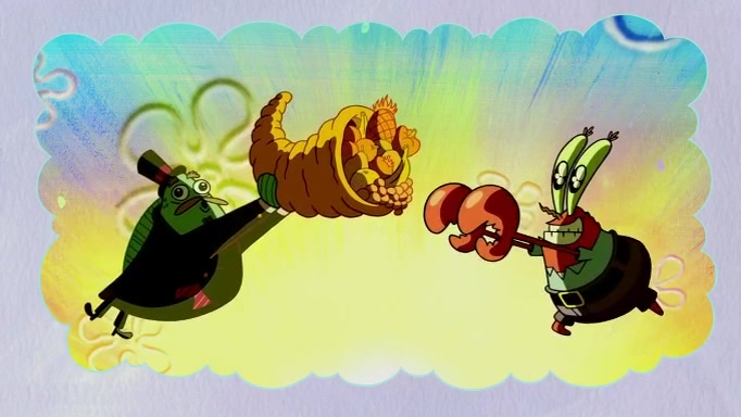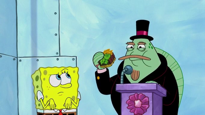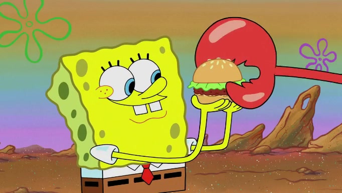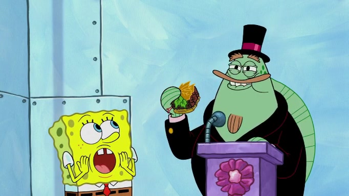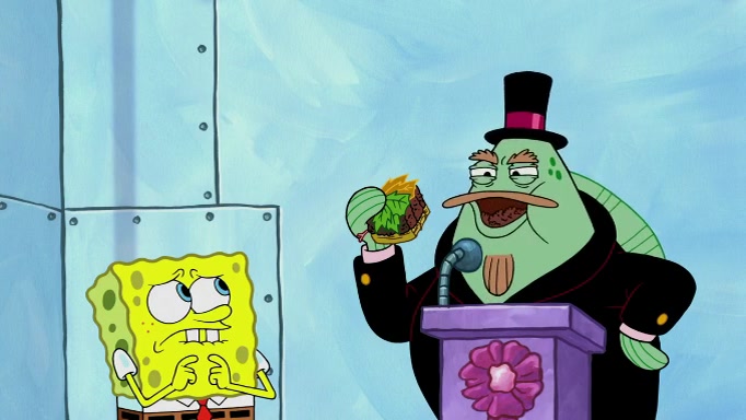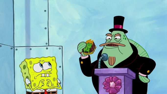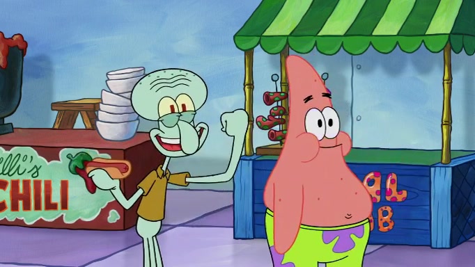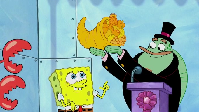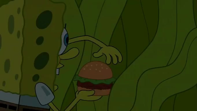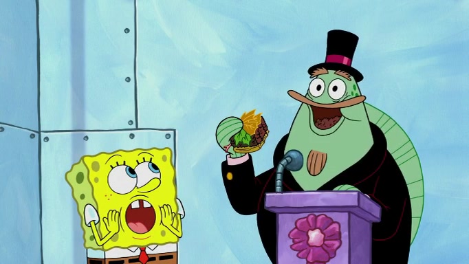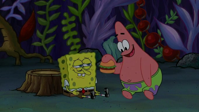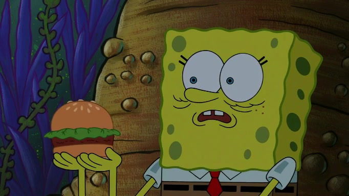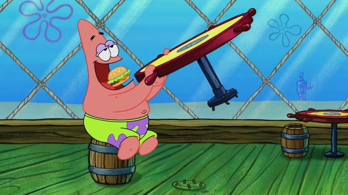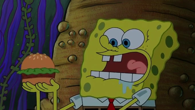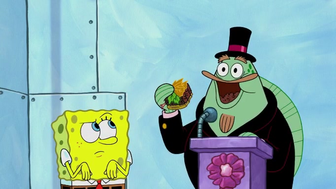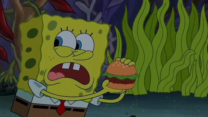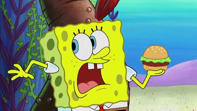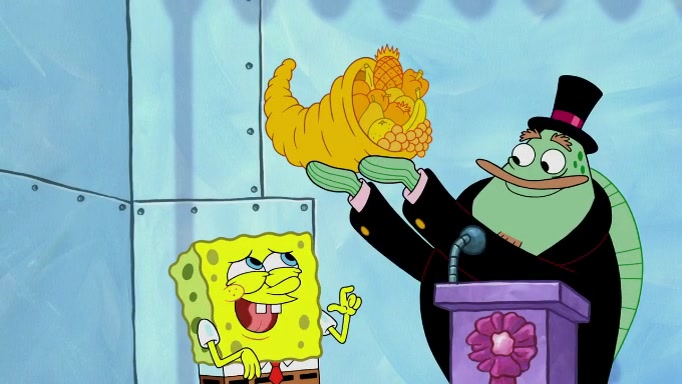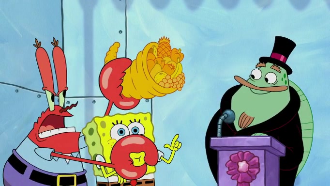 SpongeBob manages to outrun them and fight his own urges to eat it and makes it to Food Con. However, Mr. Krabs, Squidward, and Patrick are still chasing him for the Krabby Patty and SpongeBob makes it inside. SpongeBob hands over the Krabby Patty to the Mayor, but upon closer inspection, it's actually one of the Nature Patties from before. Patrick somehow switched the real Krabby Patty with the fake one and eats it. Fortunately, the Mayor ends up enjoying the Nature Patty and rewards the Golden Corncupia to the Krusty Krab. Everyone cheers, but Squidward gets more exhaust blown in his face. Then the episode ends.