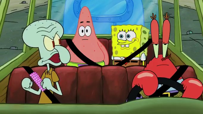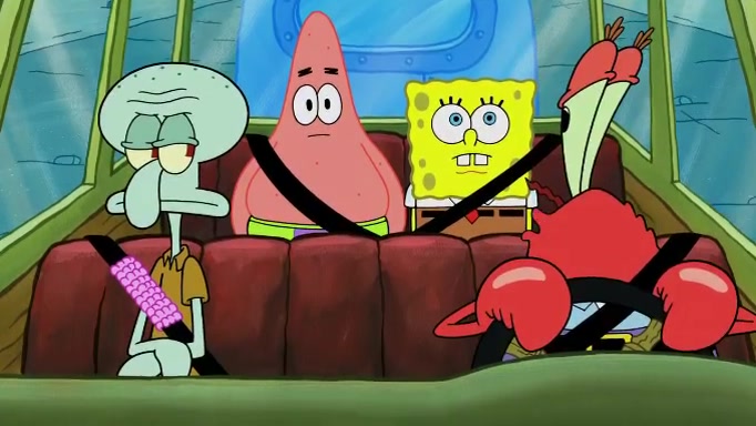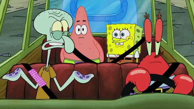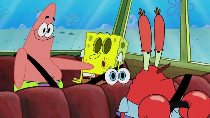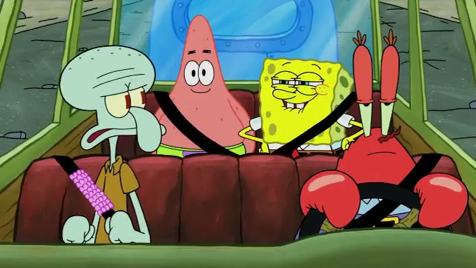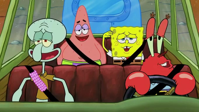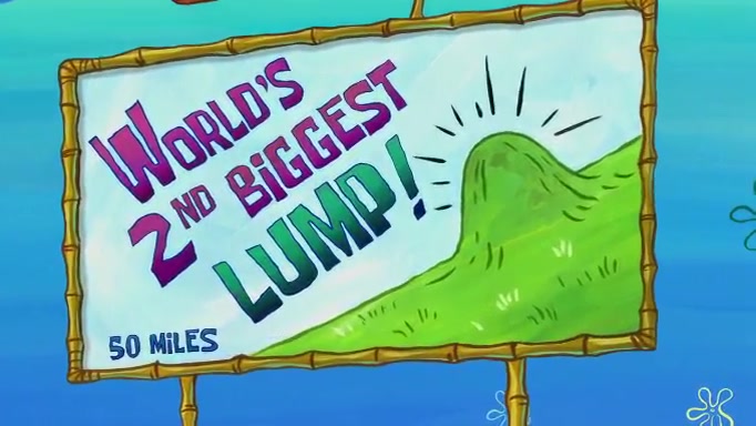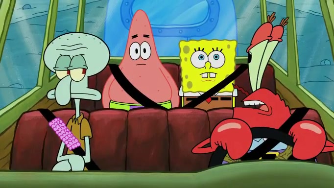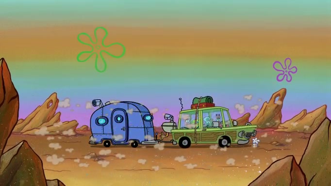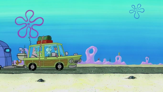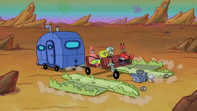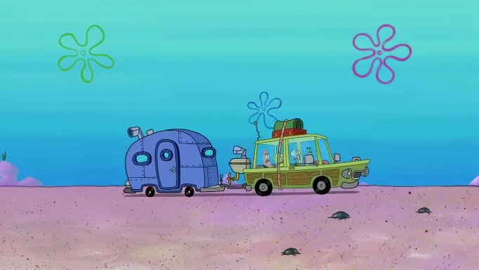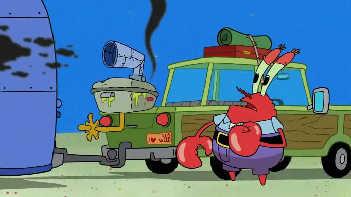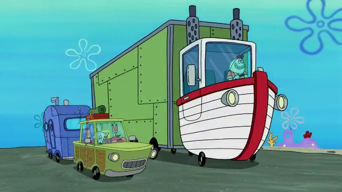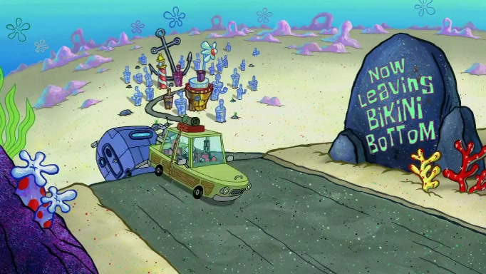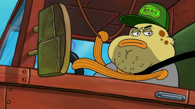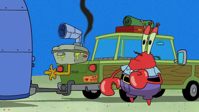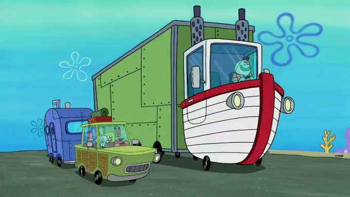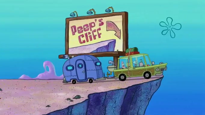 Sometime later, Mr. Krabs drives everyone out of Bikini Bottom and SpongeBob and Patrick are playing "I Spy" where they are constantly "spying" Mr. Krabs. Mr. Krabs quiets them, but then they start to see a bunch of billboards. Mr. Krabs and Squidward both reject stopping to see what the billboards were advertising with Mr. Krabs saying they're not stopping until Food Con. Later, SpongeBob and Patrick are signaling to truck drivers to blow their horns which wakes Squidward at both times. SpongeBob asks Squidward to do it and when Squidward does, he gets exhaust blown on his face. Patrick tells Squidward he did it wrong but Squidward says he did the exact same thing he and SpongeBob did. An annoyed Mr. Krabs tells everyone to be quiet until they make it to Food Con and doesn't want to hear another peep. SpongeBob suddenly starts saying "Peep" which he was trying to warn Mr. Krabs of Peep's Cliff. Mr. Krabs drives down the cliff and everyone ends up going through a dam and a tornado until they end up in a desert. The boat breaks apart and Patrick ends up eating nearly every Krabby Patty except one. Mr. Krabs is still determined to make it to Food Con and has SpongeBob and Patrick haul the trailer.