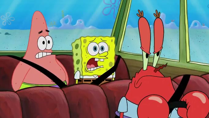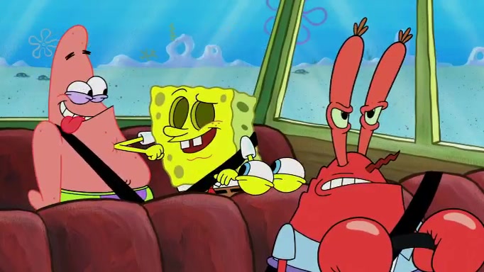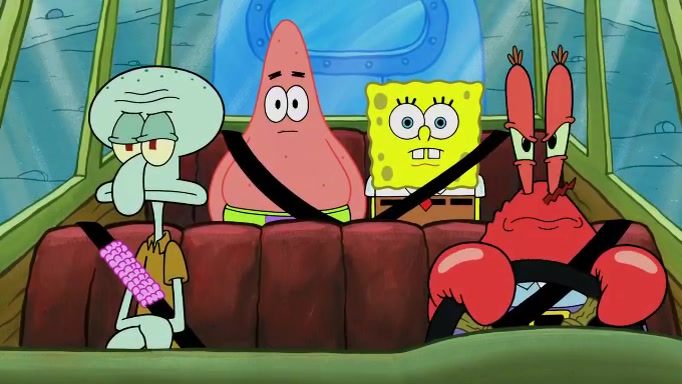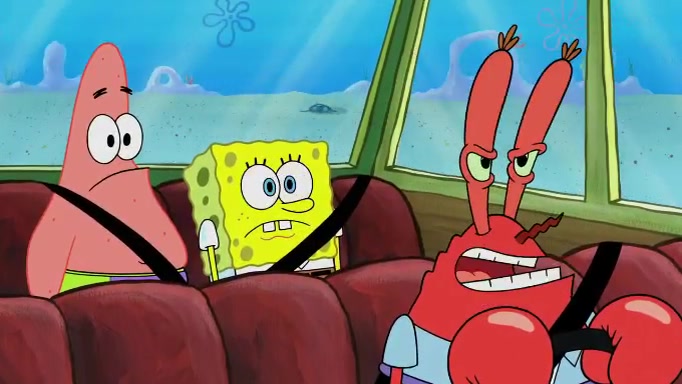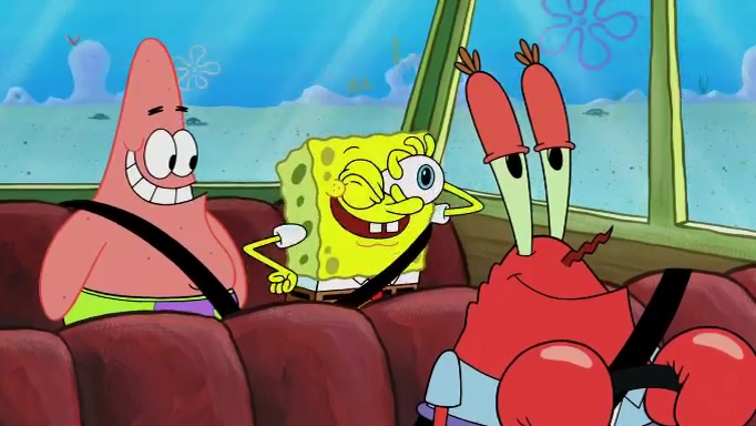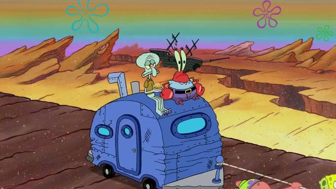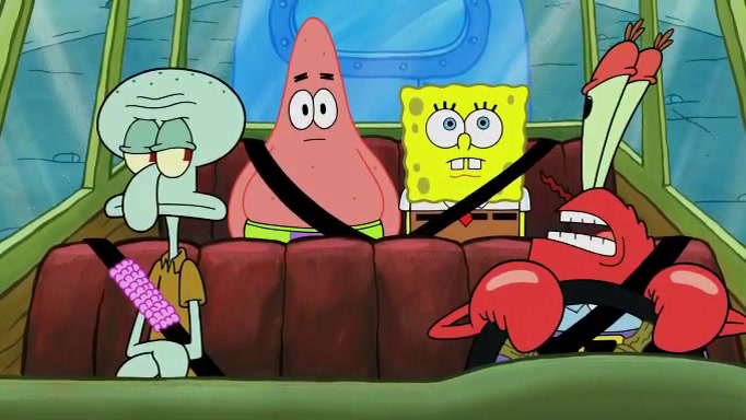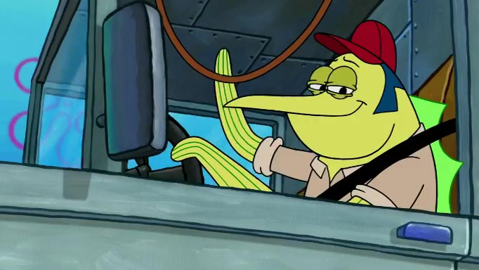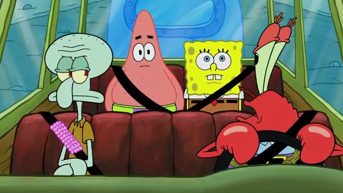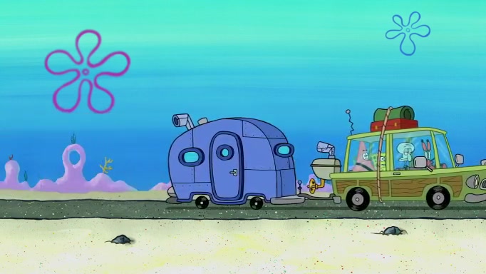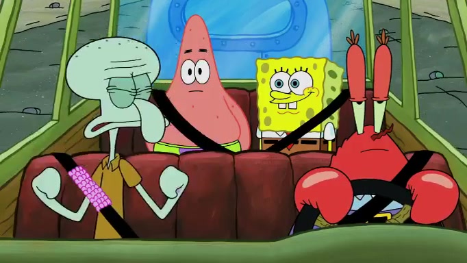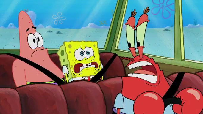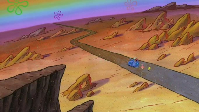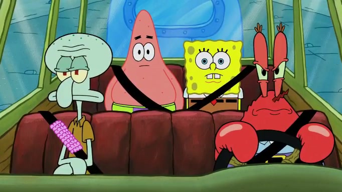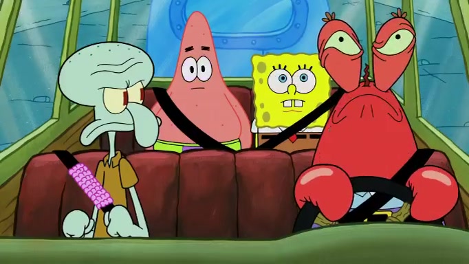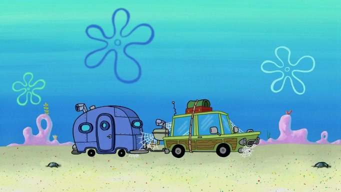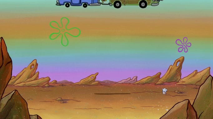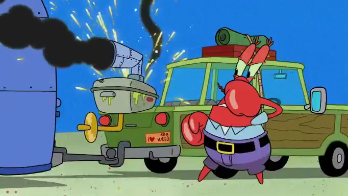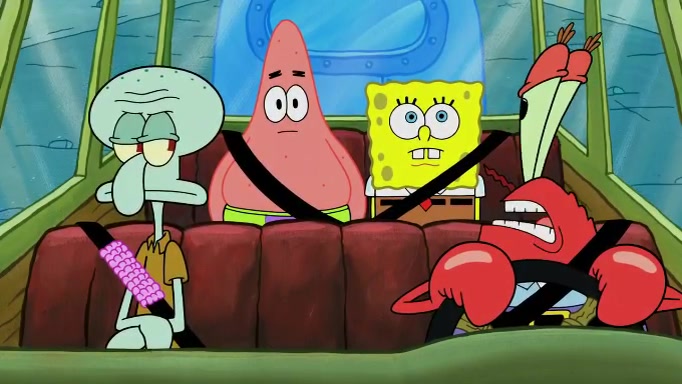 Sometime later, Mr. Krabs drives everyone out of Bikini Bottom and SpongeBob and Patrick are playing "I Spy" where they are constantly "spying" Mr. Krabs. Mr. Krabs quiets them, but then they start to see a bunch of billboards. Mr. Krabs and Squidward both reject stopping to see what the billboards were advertising with Mr. Krabs saying they're not stopping until Food Con. Later, SpongeBob and Patrick are signaling to truck drivers to blow their horns which wakes Squidward at both times. SpongeBob asks Squidward to do it and when Squidward does, he gets exhaust blown on his face. Patrick tells Squidward he did it wrong but Squidward says he did the exact same thing he and SpongeBob did. An annoyed Mr. Krabs tells everyone to be quiet until they make it to Food Con and doesn't want to hear another peep. SpongeBob suddenly starts saying "Peep" which he was trying to warn Mr. Krabs of Peep's Cliff. Mr. Krabs drives down the cliff and everyone ends up going through a dam and a tornado until they end up in a desert. The boat breaks apart and Patrick ends up eating nearly every Krabby Patty except one. Mr. Krabs is still determined to make it to Food Con and has SpongeBob and Patrick haul the trailer.