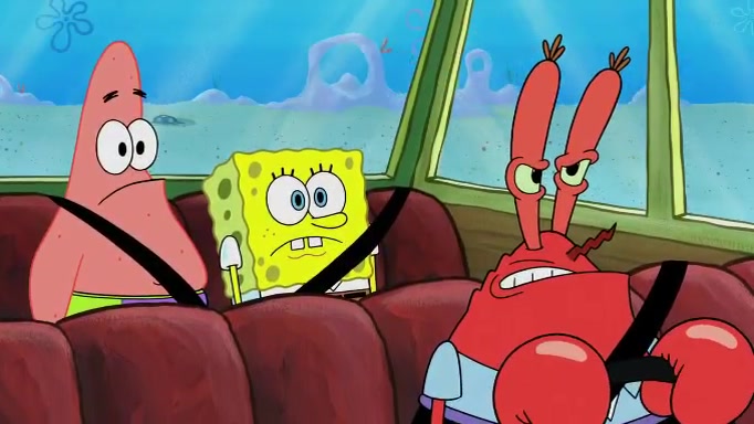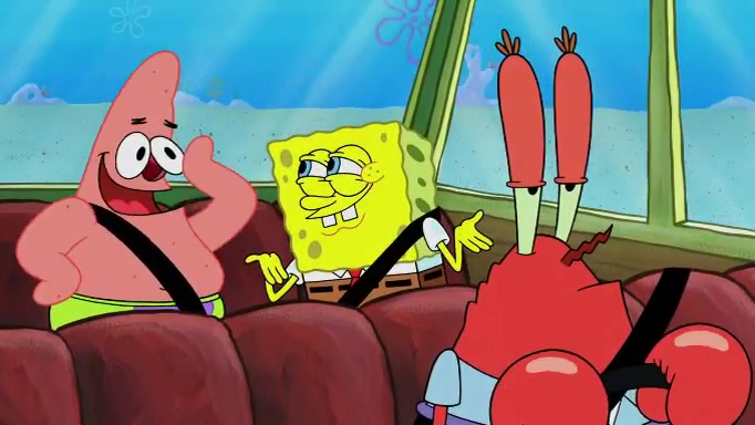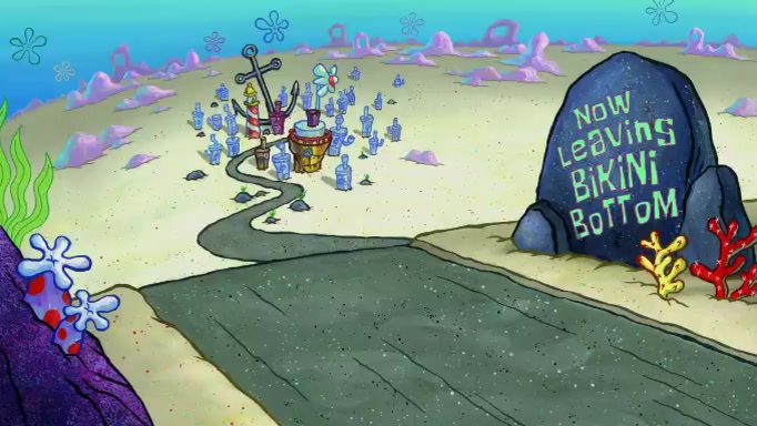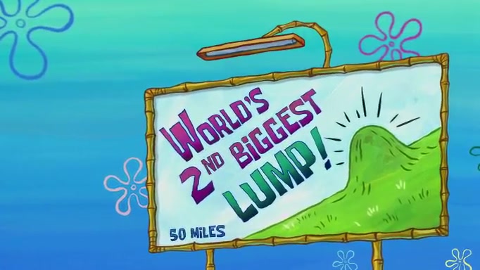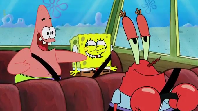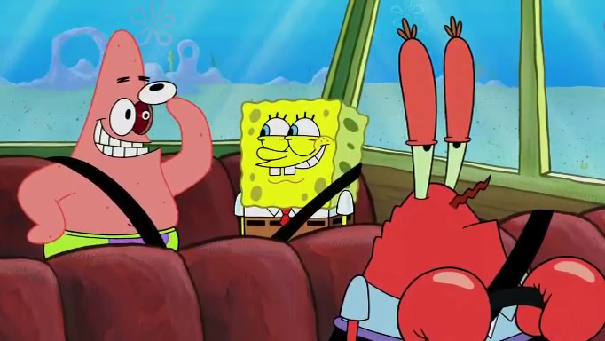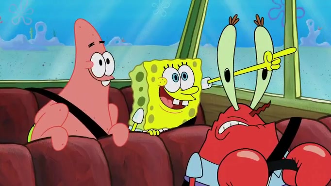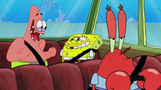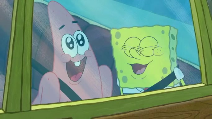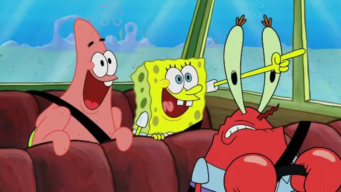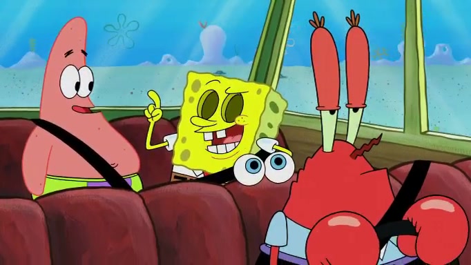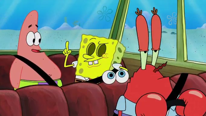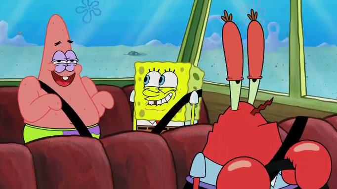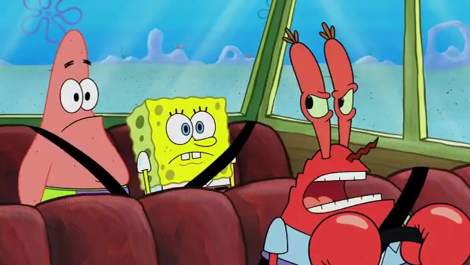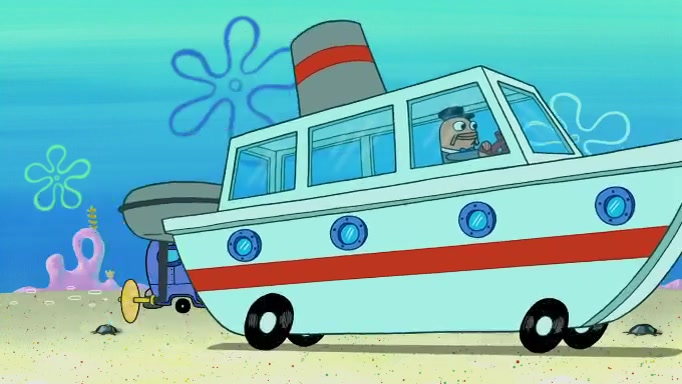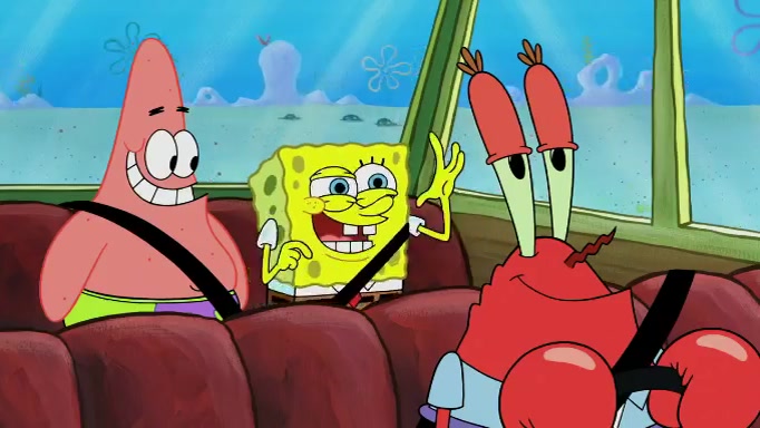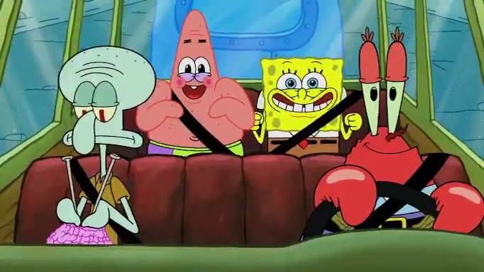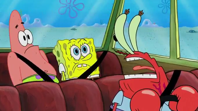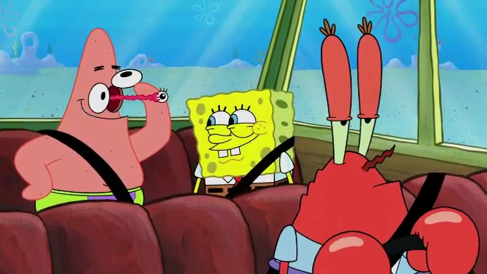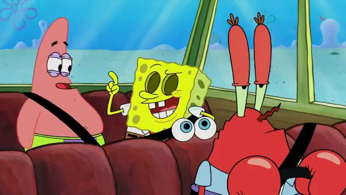 Sometime later, Mr. Krabs drives everyone out of Bikini Bottom and SpongeBob and Patrick are playing "I Spy" where they are constantly "spying" Mr. Krabs. Mr. Krabs quiets them, but then they start to see a bunch of billboards. Mr. Krabs and Squidward both reject stopping to see what the billboards were advertising with Mr. Krabs saying they're not stopping until Food Con. Later, SpongeBob and Patrick are signaling to truck drivers to blow their horns which wakes Squidward at both times. SpongeBob asks Squidward to do it and when Squidward does, he gets exhaust blown on his face. Patrick tells Squidward he did it wrong but Squidward says he did the exact same thing he and SpongeBob did. An annoyed Mr. Krabs tells everyone to be quiet until they make it to Food Con and doesn't want to hear another peep. SpongeBob suddenly starts saying "Peep" which he was trying to warn Mr. Krabs of Peep's Cliff. Mr. Krabs drives down the cliff and everyone ends up going through a dam and a tornado until they end up in a desert. The boat breaks apart and Patrick ends up eating nearly every Krabby Patty except one. Mr. Krabs is still determined to make it to Food Con and has SpongeBob and Patrick haul the trailer.