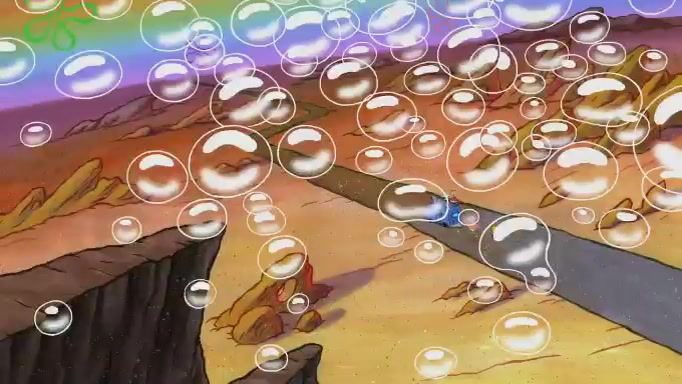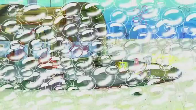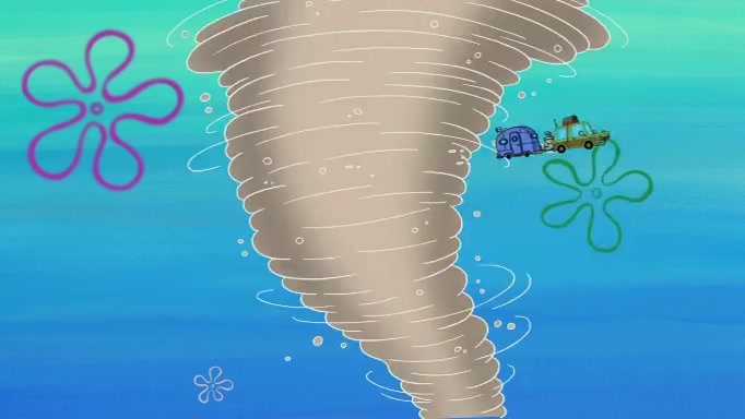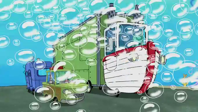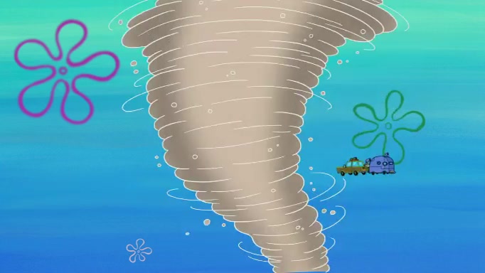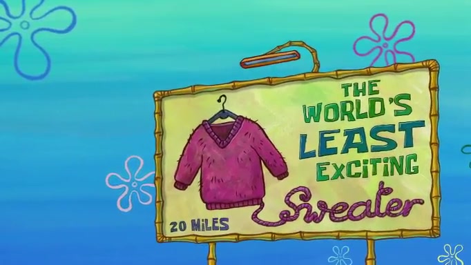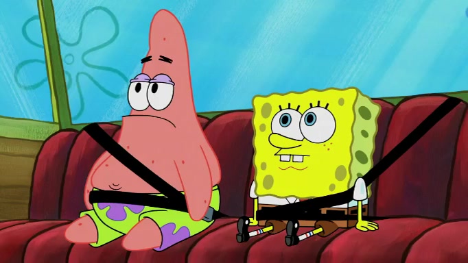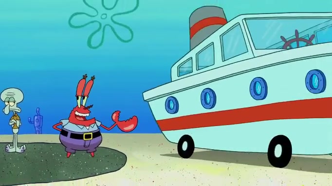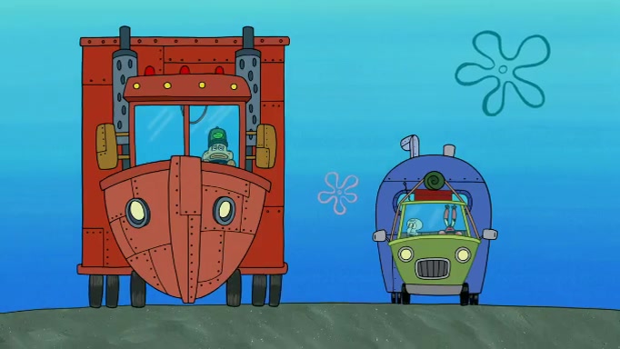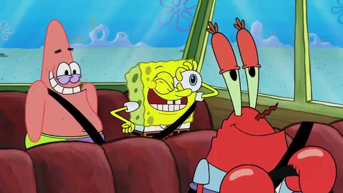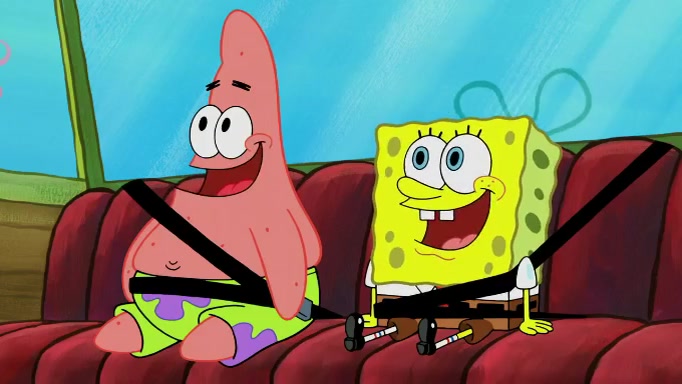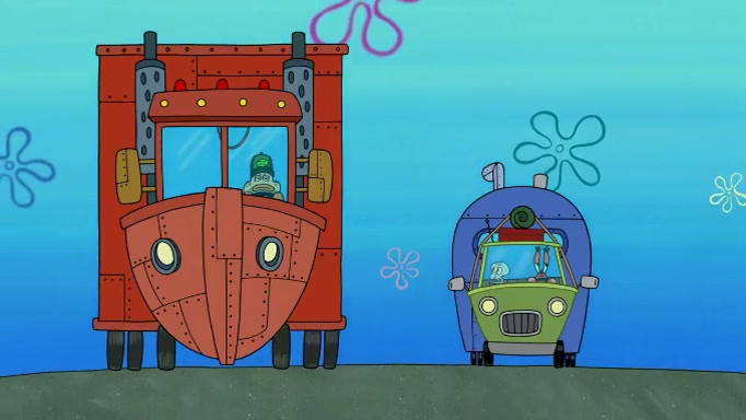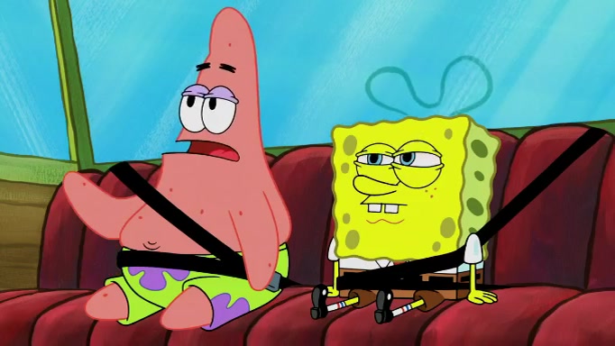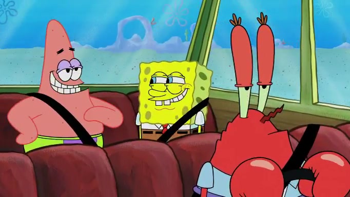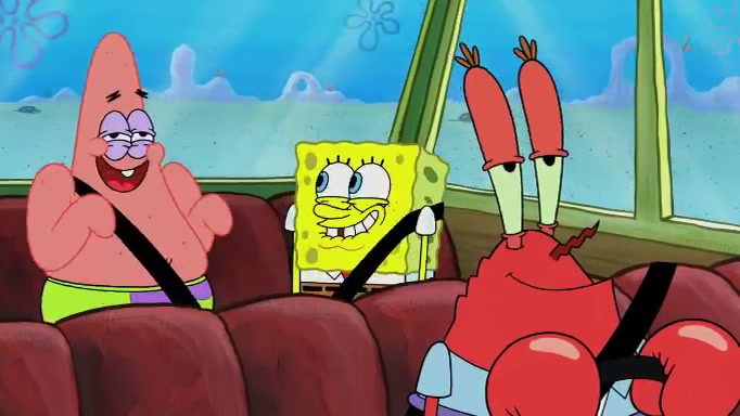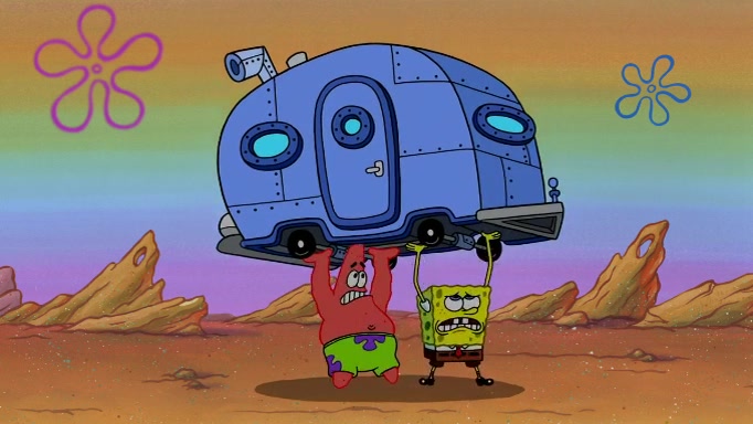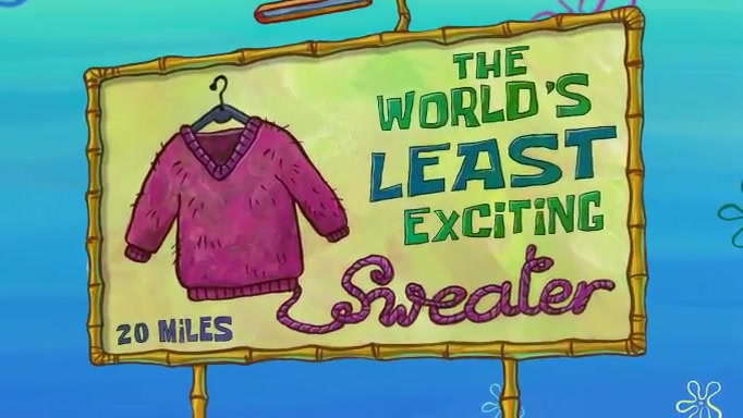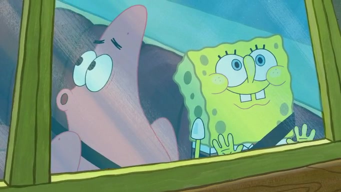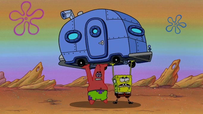 Sometime later, Mr. Krabs drives everyone out of Bikini Bottom and SpongeBob and Patrick are playing "I Spy" where they are constantly "spying" Mr. Krabs. Mr. Krabs quiets them, but then they start to see a bunch of billboards. Mr. Krabs and Squidward both reject stopping to see what the billboards were advertising with Mr. Krabs saying they're not stopping until Food Con. Later, SpongeBob and Patrick are signaling to truck drivers to blow their horns which wakes Squidward at both times. SpongeBob asks Squidward to do it and when Squidward does, he gets exhaust blown on his face. Patrick tells Squidward he did it wrong but Squidward says he did the exact same thing he and SpongeBob did. An annoyed Mr. Krabs tells everyone to be quiet until they make it to Food Con and doesn't want to hear another peep. SpongeBob suddenly starts saying "Peep" which he was trying to warn Mr. Krabs of Peep's Cliff. Mr. Krabs drives down the cliff and everyone ends up going through a dam and a tornado until they end up in a desert. The boat breaks apart and Patrick ends up eating nearly every Krabby Patty except one. Mr. Krabs is still determined to make it to Food Con and has SpongeBob and Patrick haul the trailer.