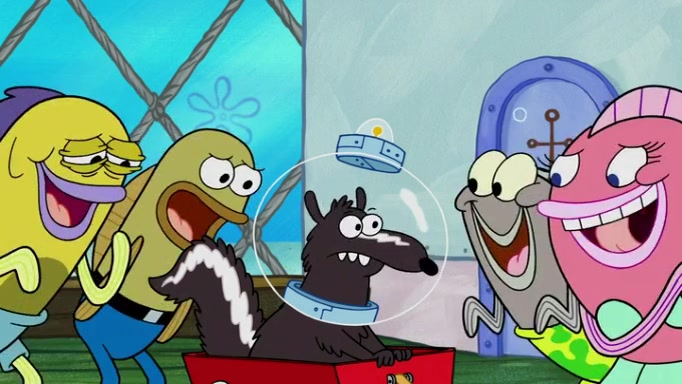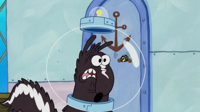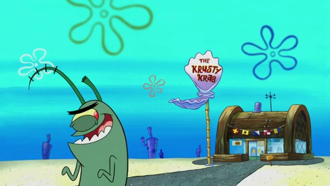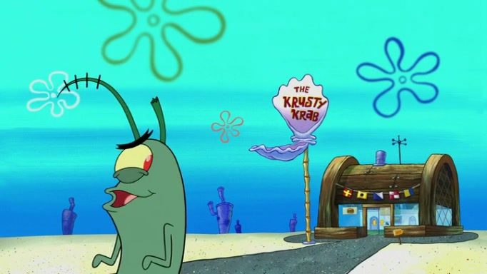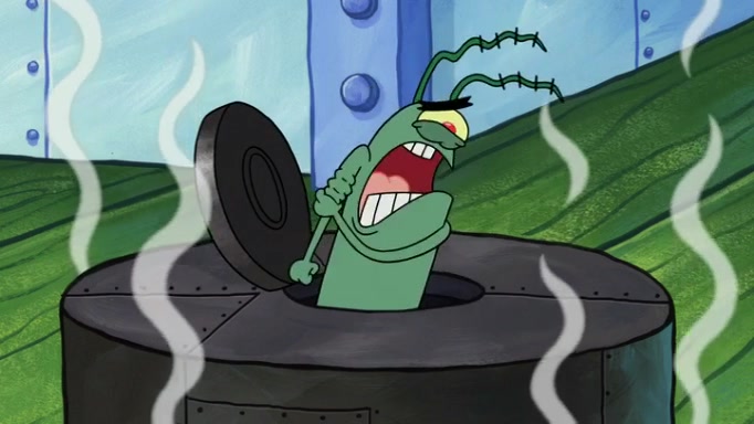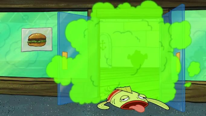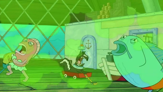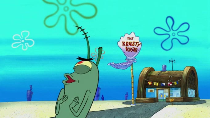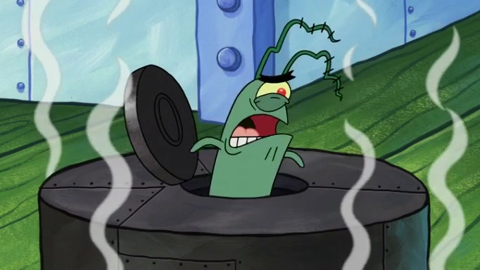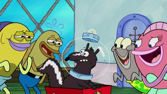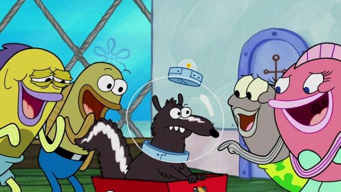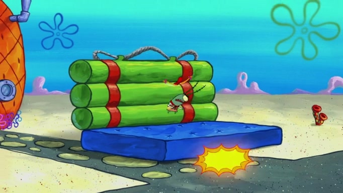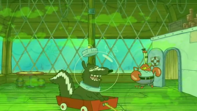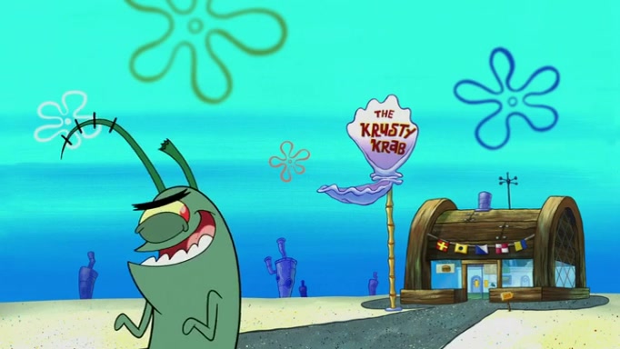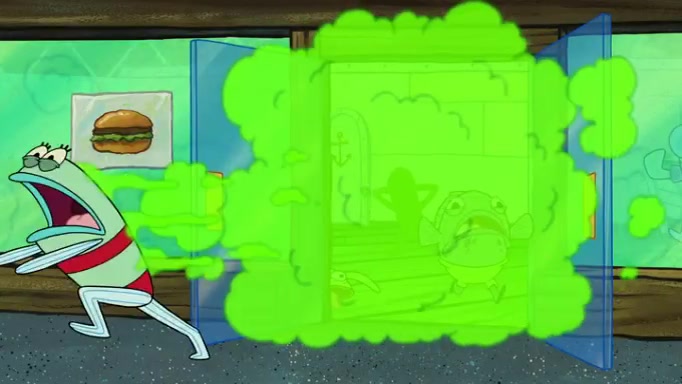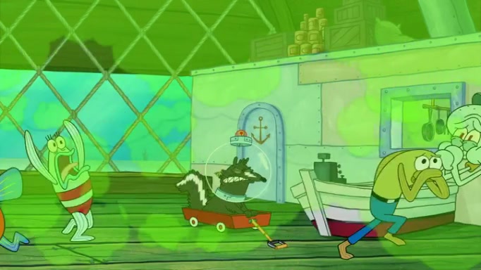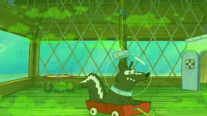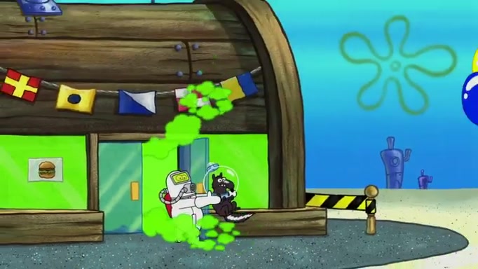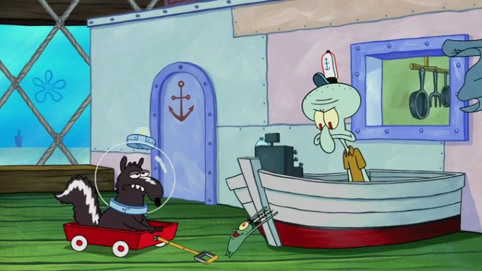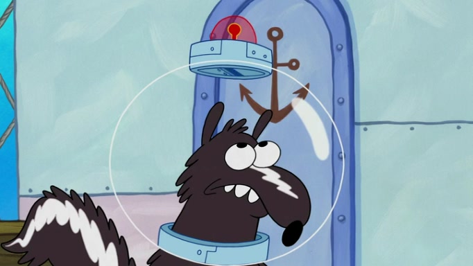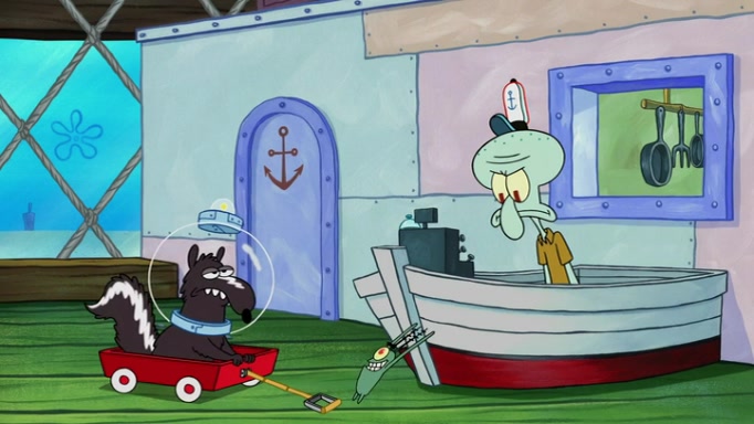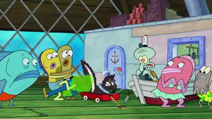 At the Chum Bucket, Plankton is on a wagon preparing for another attempt to steal the Krabby Patty Secret Formula. Plankton is pushed into the Krusty Krab and reveals to everyone there that he has a skunk (which he named Mr. Stinky). The customers think it's just a cat but Plankton sets the skunk off by scaring it with a bee. All of the customers, Squidward, SpongeBob, and Mr. Krabs frantically leave the Krusty Krab due to the stink. Mr. Krabs knows that Plankton is in the Krusty Krab alone and takes one of SpongeBob's arms to use as a nose plug and heads inside. Mr. Krabs heads into his office to find Plankton surrounded the safe with dynamite. Unfortunately for Plankton, the safe has another safe inside and Mr. Krabs crushes Plankton with his fist and is tossed out of the window by SpongeBob. The skunk is sent away toward Bikini Bottom causing the people to run away. Mr. Krabs, worried something like that will happen again, wants SpongeBob to take the secret formula home with him while he makes adjustments to his safe. However, the two of them didn't know Plankton was listening to everything with is severed antenna.