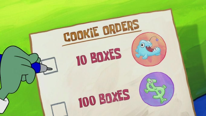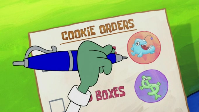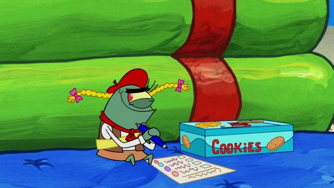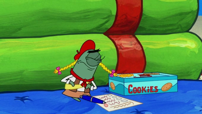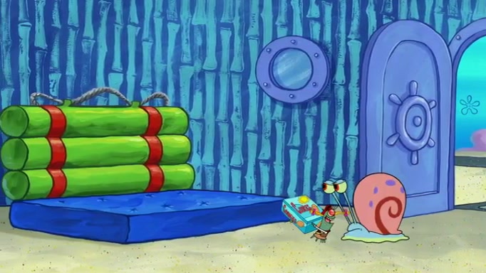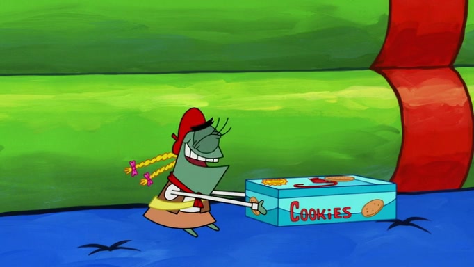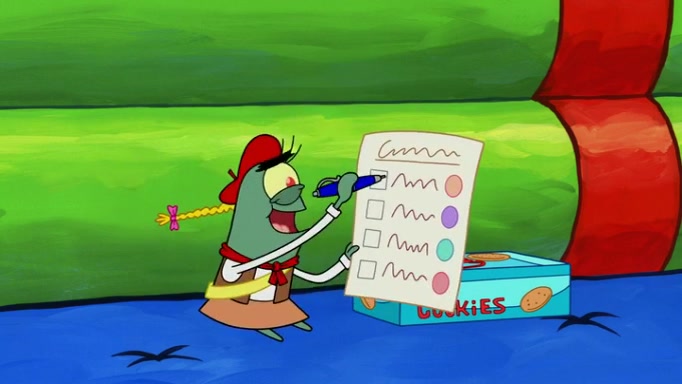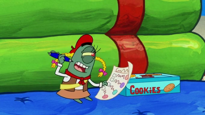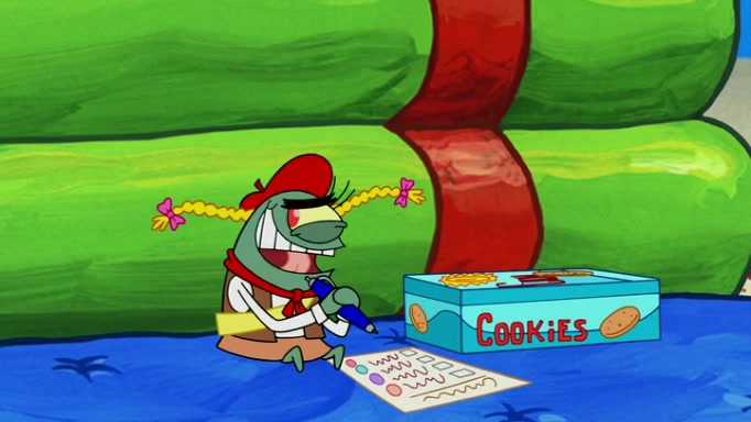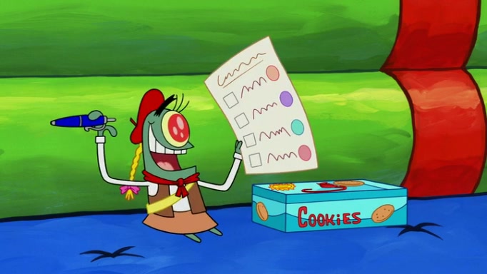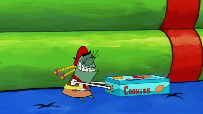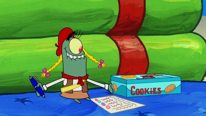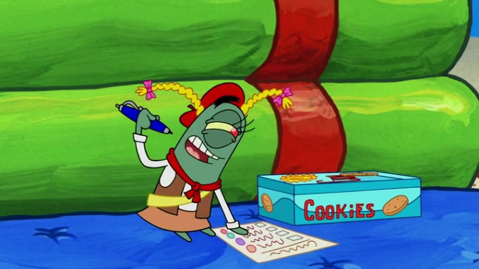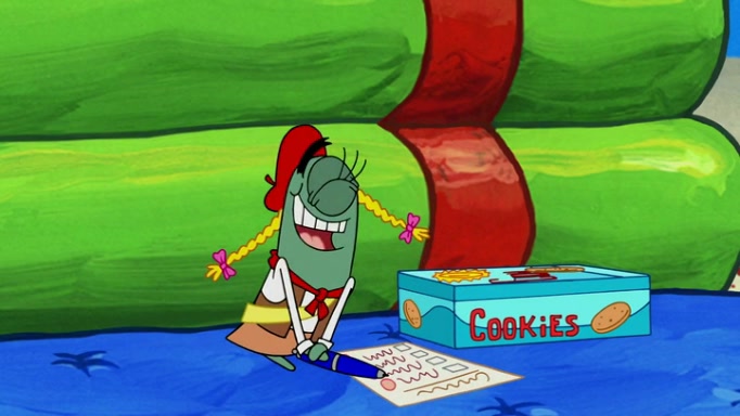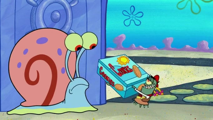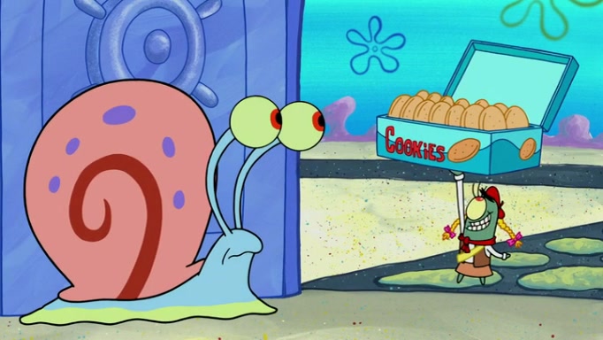 Later at closing time, SpongeBob tries to sneak home with the formula but is greeted by Plankton. The two of them talk for a little bit until SpongeBob excuses himself to go home. The next morning, SpongeBob is seen talking to Gary entrusting the safety of the secret formula to him. Plankton is spying on them and watches as SpongeBob leaves. Plankton then disguises himself as a door-to-door salesman selling snail products. However, Gary closes the door on him and Plankton angrily walks off. Moments later, Plankton is disguised as a Sweetie Patrol Girl and tries to sell cookies to Gary, but Gary ends up putting the sofa with Plankton on it outside. Plankton throws down the cookies in a fit of anger and gets blown up as a result, making a mental note that nitroglycerin is not a good substitute for vanilla extract.