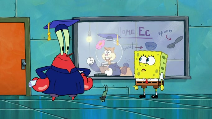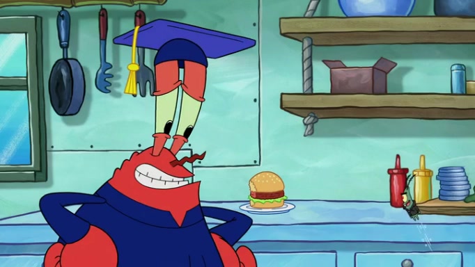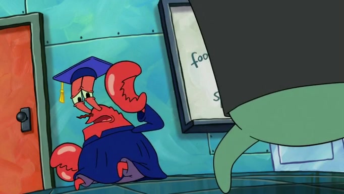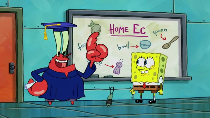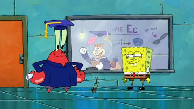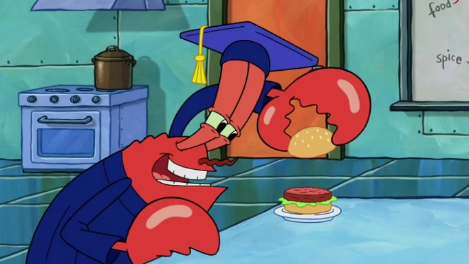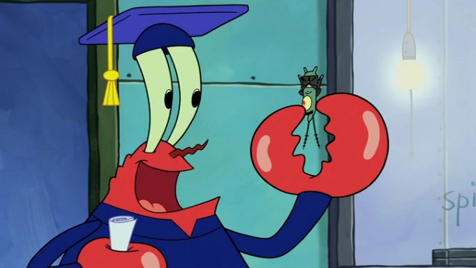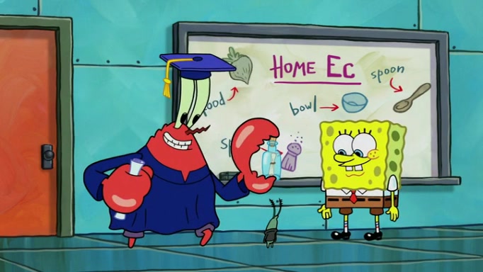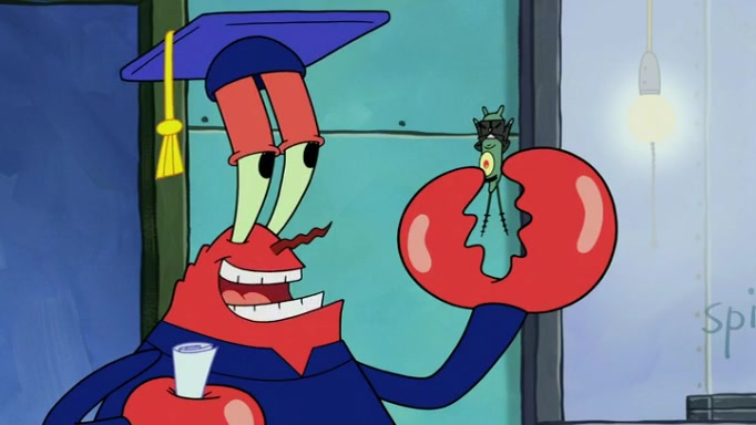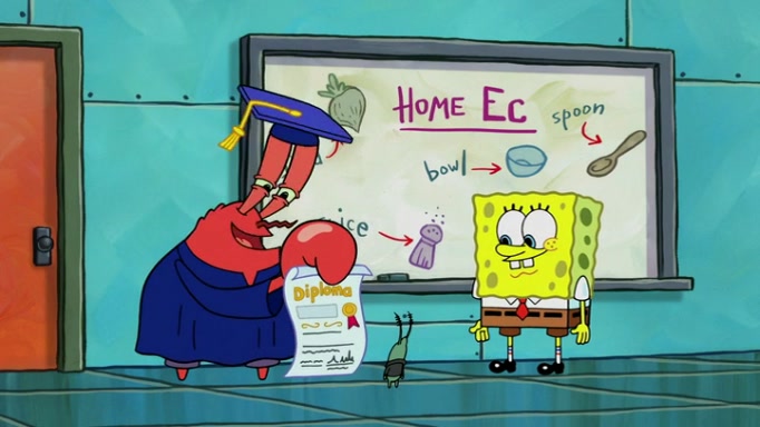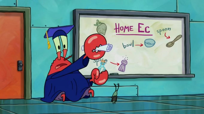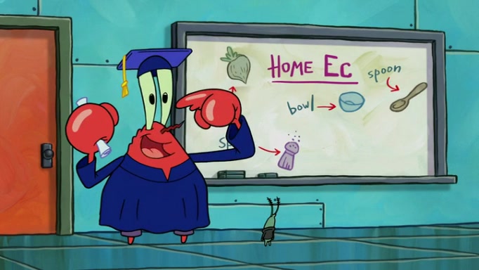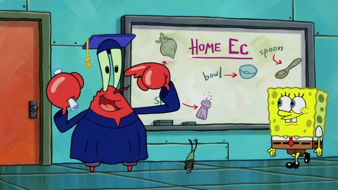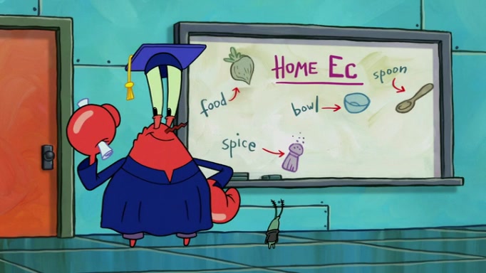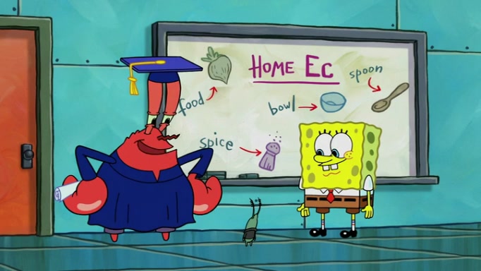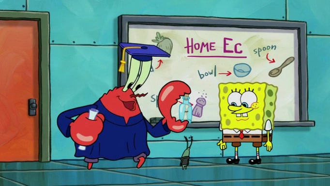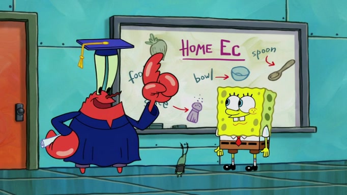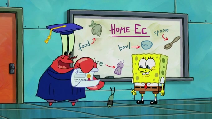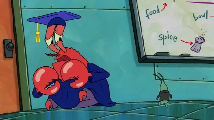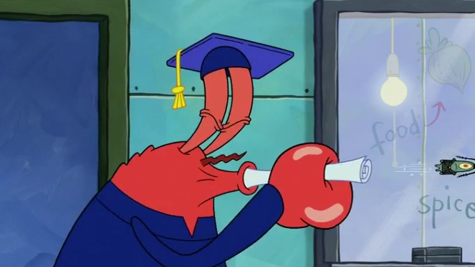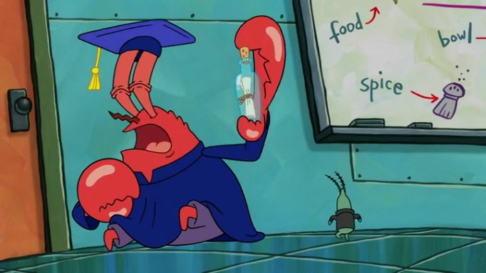 Plankton, on the other hand, was unable to learn anything because he continued to act dumb and became a school bully to Mr. Krabs. On the day of graduation, Mr. Krabs perfected the Krabby Patty formula in Home EC. However, when Plankton tasted the Krabby Patty, he demanded Mr. Krabs to hand him the formula, but was stopped by SpongeBob who inexplicably showed up to give Mr. Krabs his diploma. Mr. Krabs reveals that he took accelerated classes and graduated months ago. Plankton was confused as to why all this happened, but when Sandy showed up and graded Mr. Krabs an A+ for acting everything out, he realized the Mr. Krabs was only pretending to be scared. Defeated and humiliated, Mr. Krabs threw Plankton outside and made him land on Karen's computer screen. Karen carries Plankton away so he can start his post-college years.