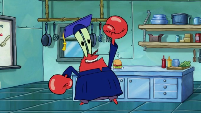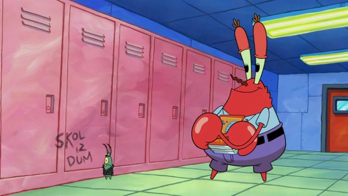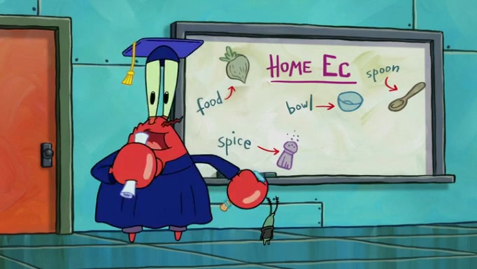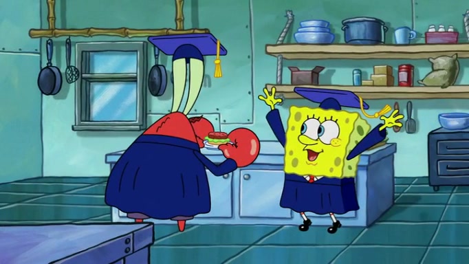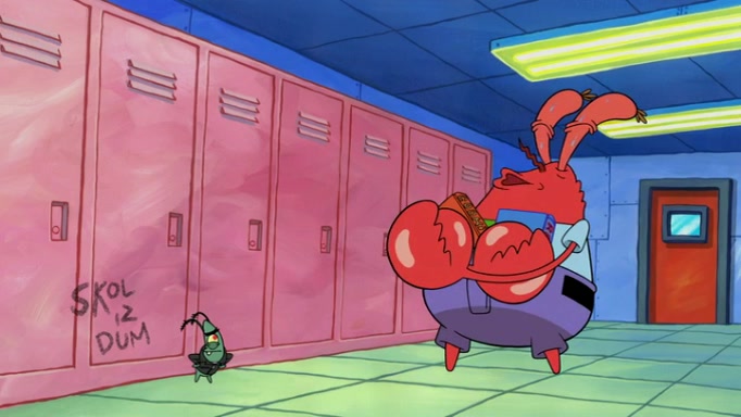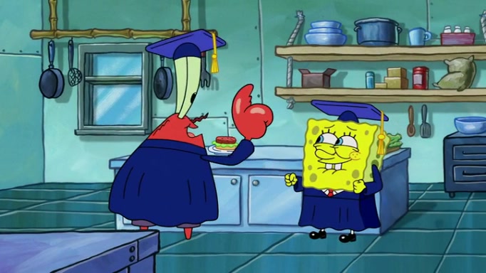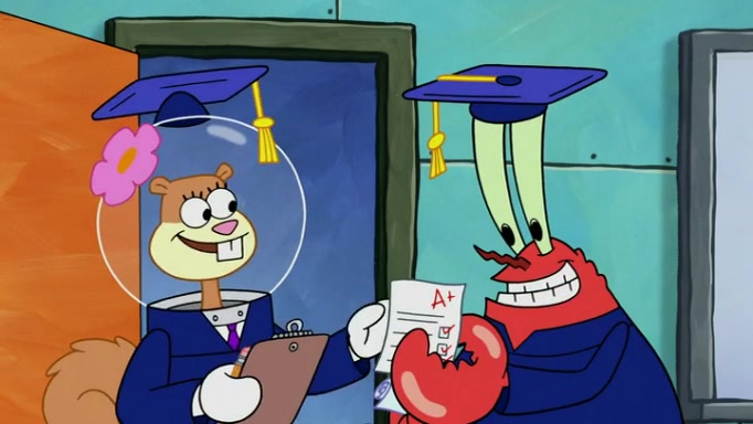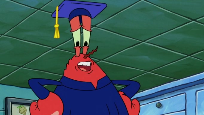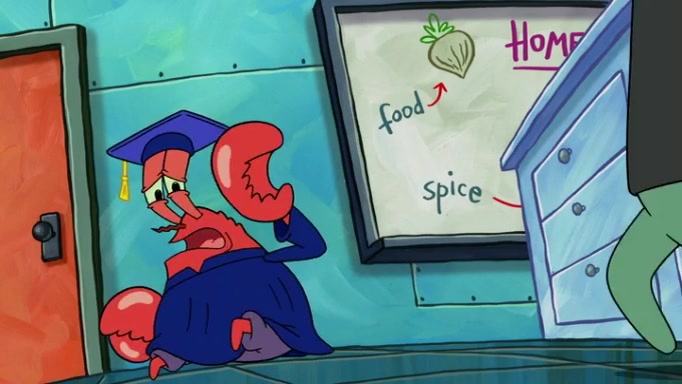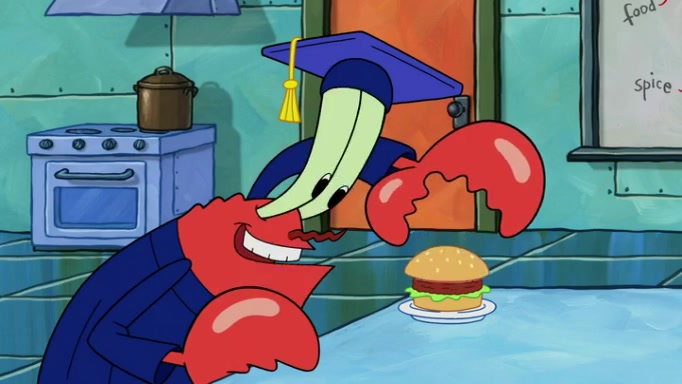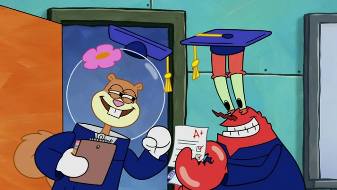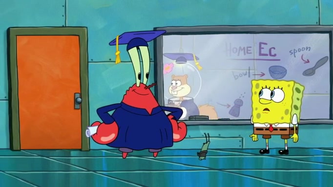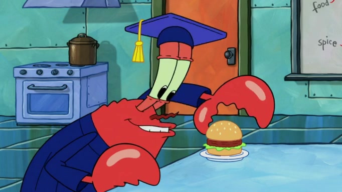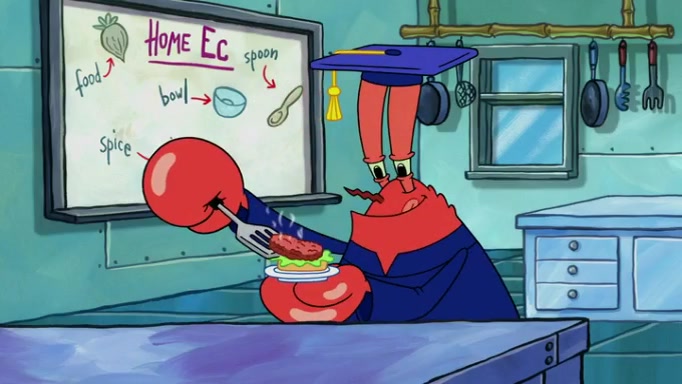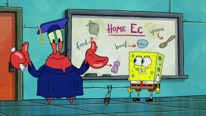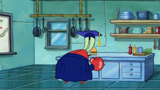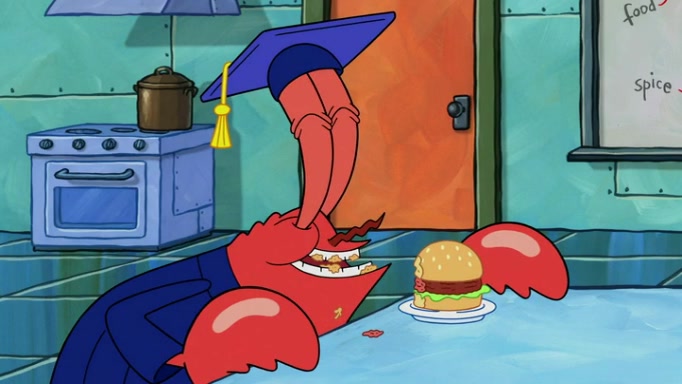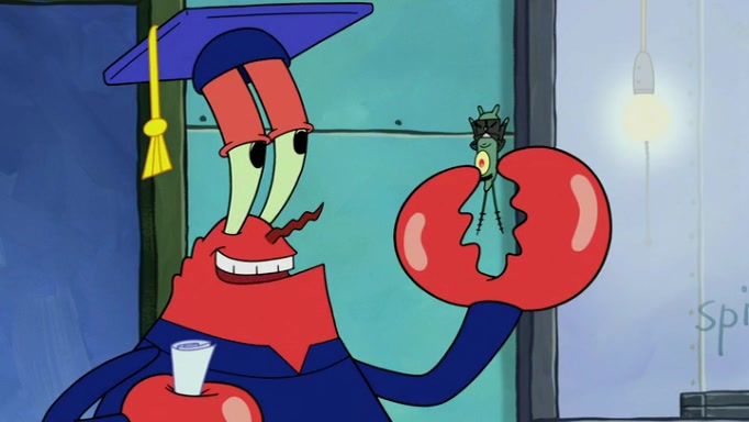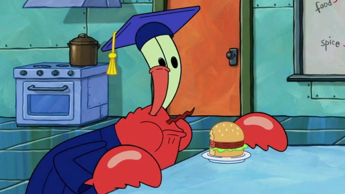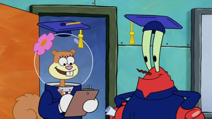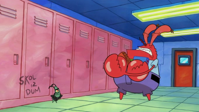 Plankton, on the other hand, was unable to learn anything because he continued to act dumb and became a school bully to Mr. Krabs. On the day of graduation, Mr. Krabs perfected the Krabby Patty formula in Home EC. However, when Plankton tasted the Krabby Patty, he demanded Mr. Krabs to hand him the formula, but was stopped by SpongeBob who inexplicably showed up to give Mr. Krabs his diploma. Mr. Krabs reveals that he took accelerated classes and graduated months ago. Plankton was confused as to why all this happened, but when Sandy showed up and graded Mr. Krabs an A+ for acting everything out, he realized the Mr. Krabs was only pretending to be scared. Defeated and humiliated, Mr. Krabs threw Plankton outside and made him land on Karen's computer screen. Karen carries Plankton away so he can start his post-college years.