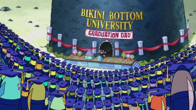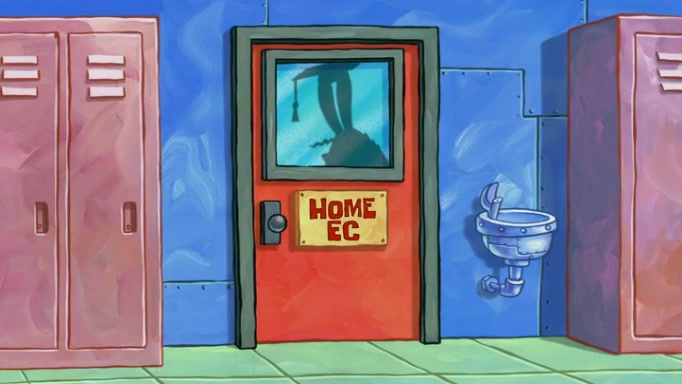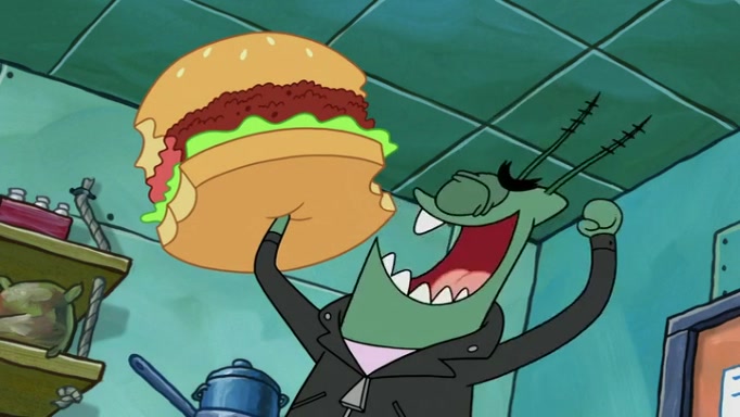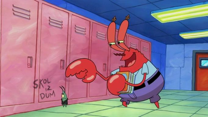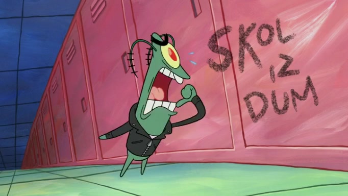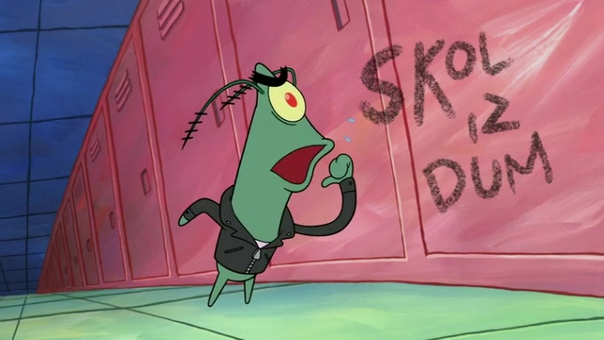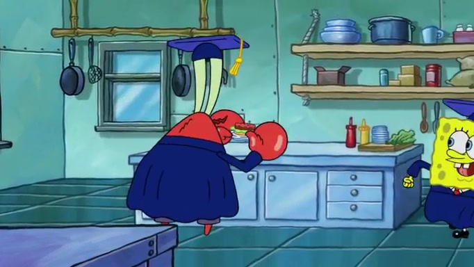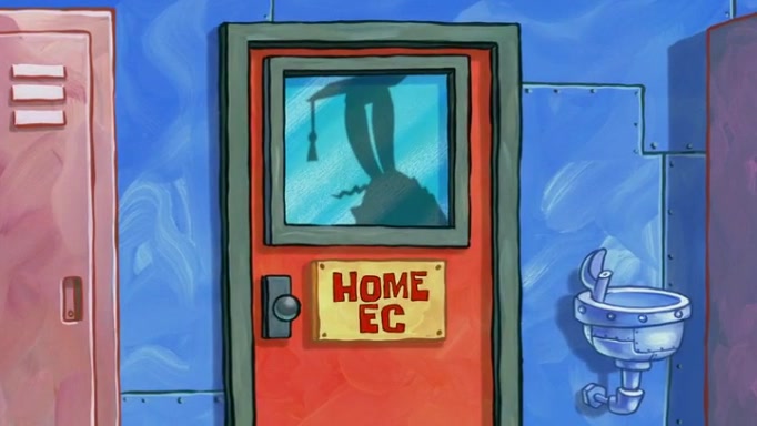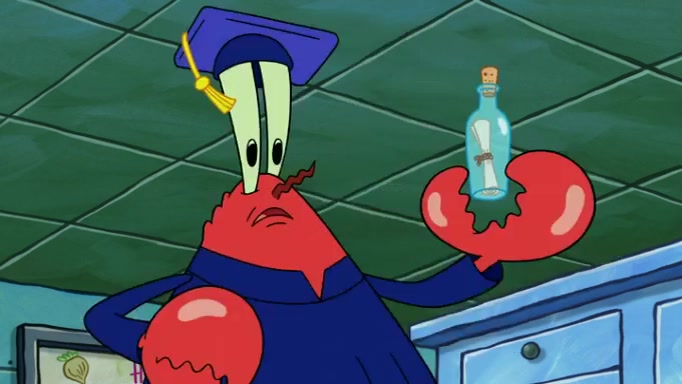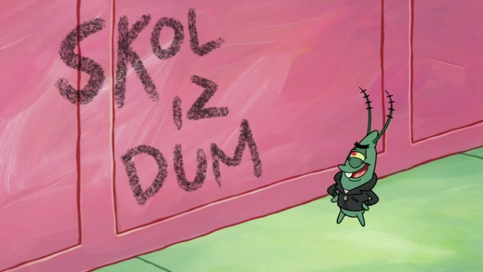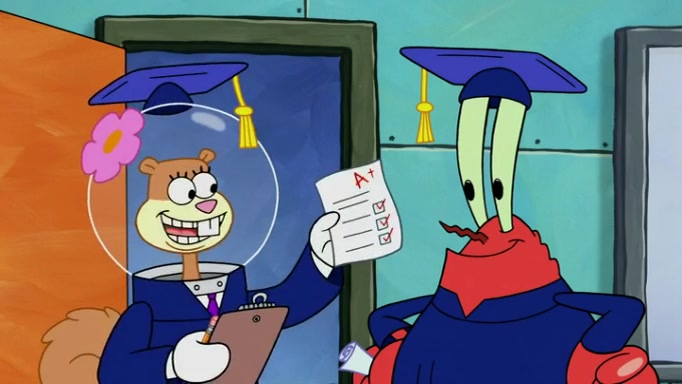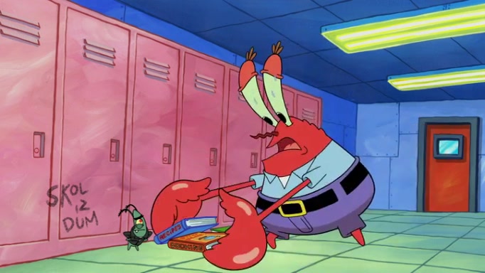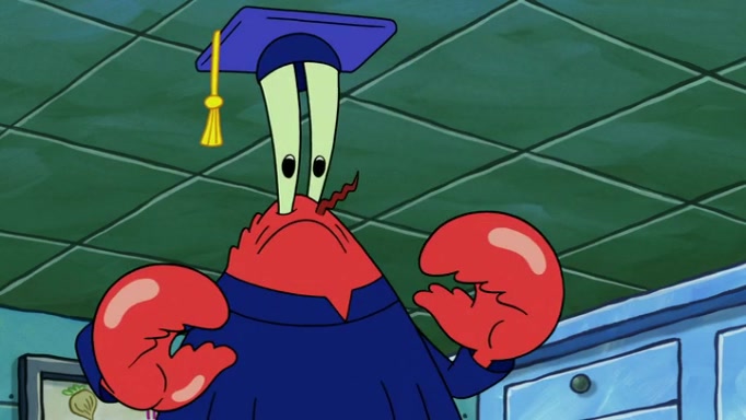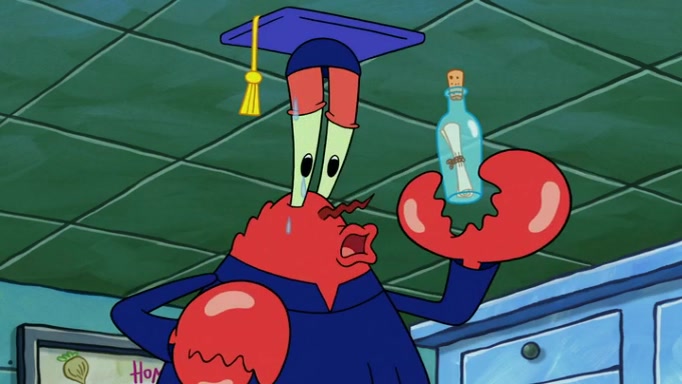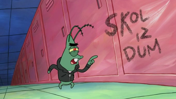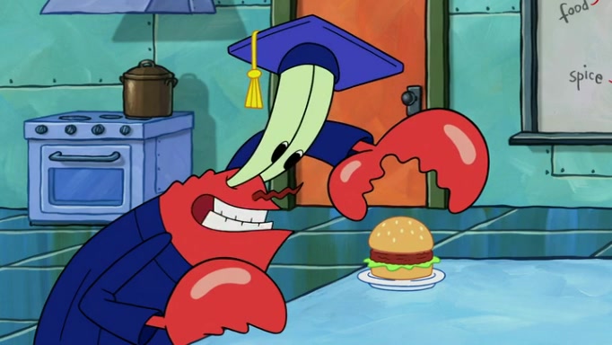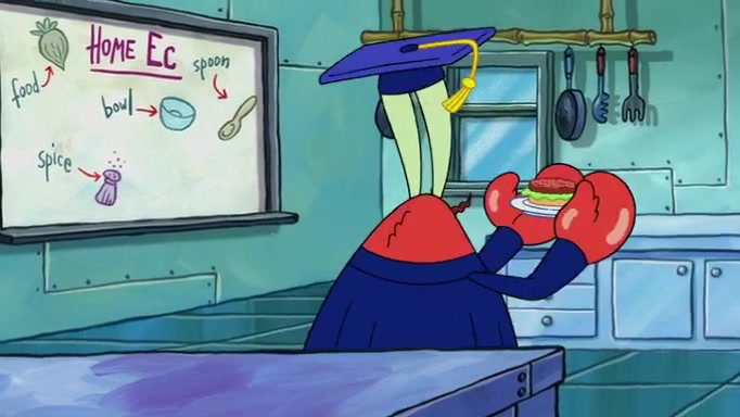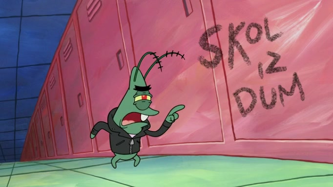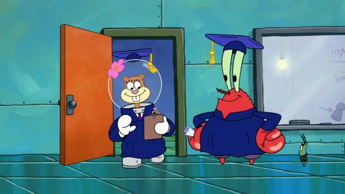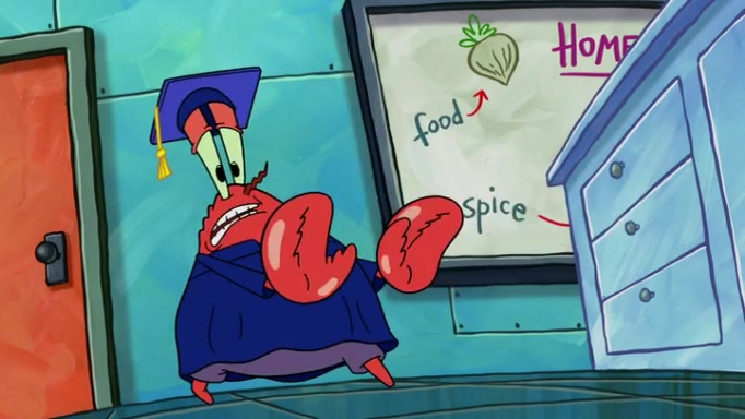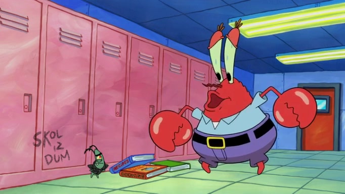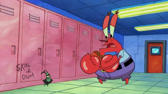 Plankton, on the other hand, was unable to learn anything because he continued to act dumb and became a school bully to Mr. Krabs. On the day of graduation, Mr. Krabs perfected the Krabby Patty formula in Home EC. However, when Plankton tasted the Krabby Patty, he demanded Mr. Krabs to hand him the formula, but was stopped by SpongeBob who inexplicably showed up to give Mr. Krabs his diploma. Mr. Krabs reveals that he took accelerated classes and graduated months ago. Plankton was confused as to why all this happened, but when Sandy showed up and graded Mr. Krabs an A+ for acting everything out, he realized the Mr. Krabs was only pretending to be scared. Defeated and humiliated, Mr. Krabs threw Plankton outside and made him land on Karen's computer screen. Karen carries Plankton away so he can start his post-college years.