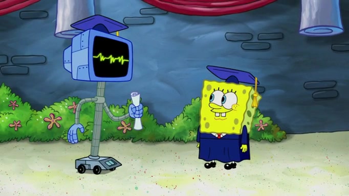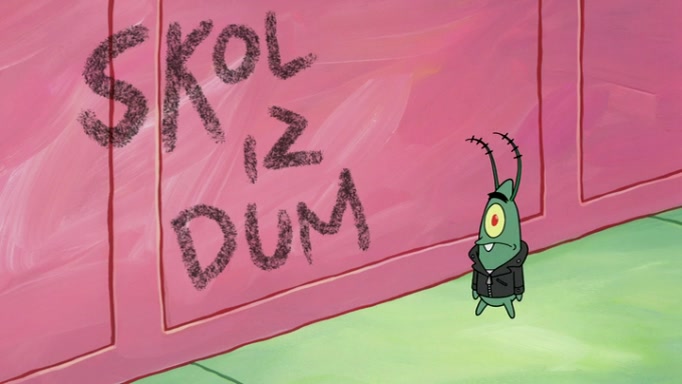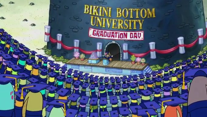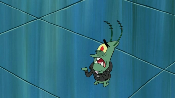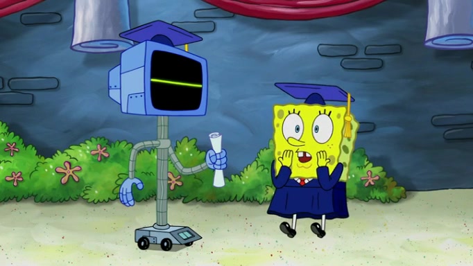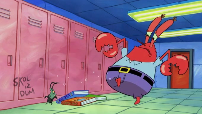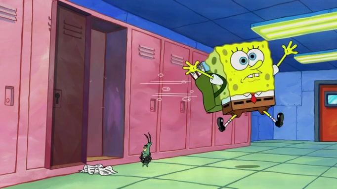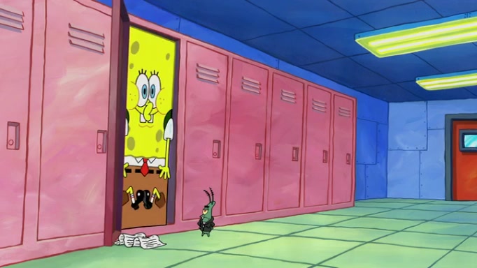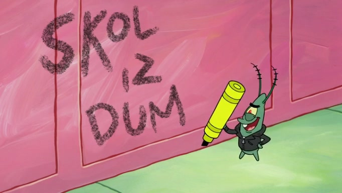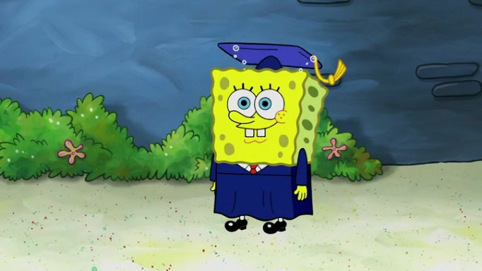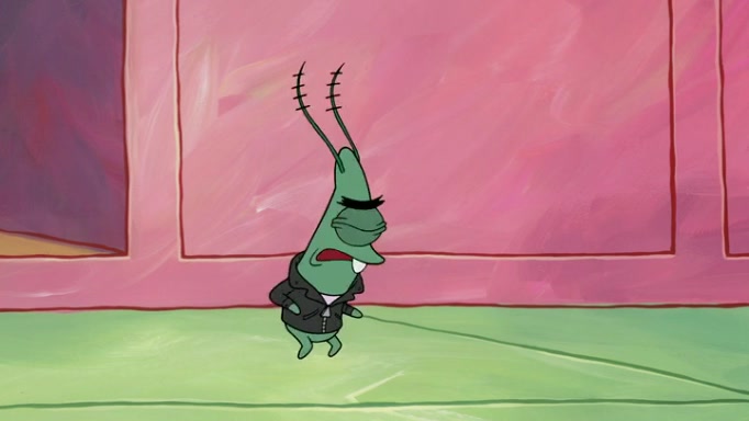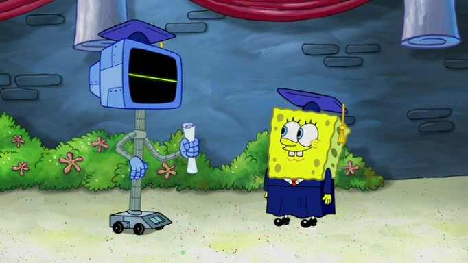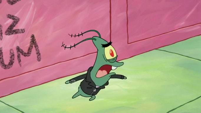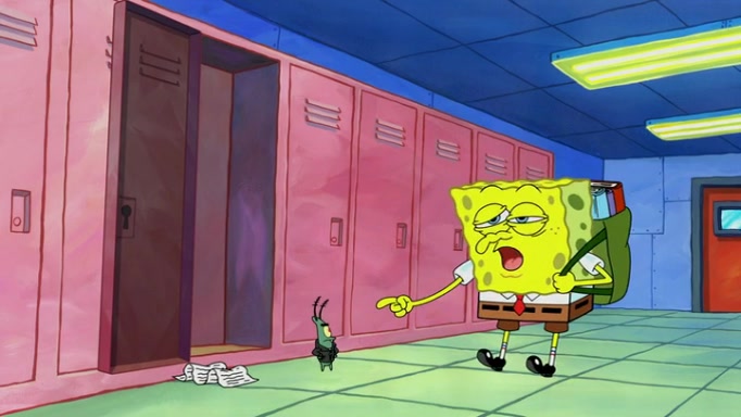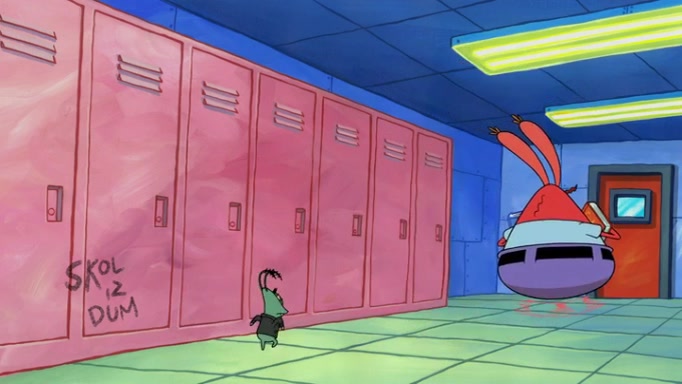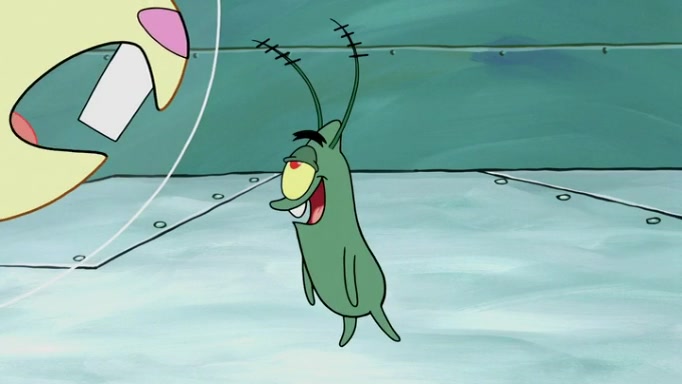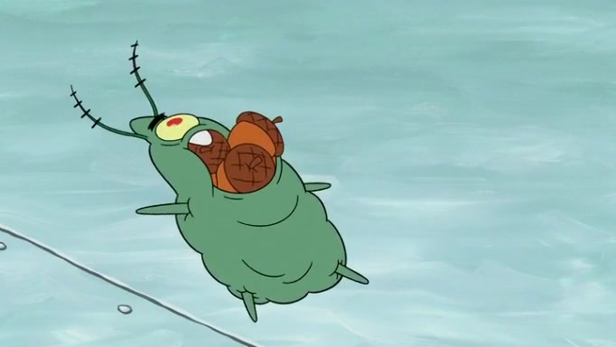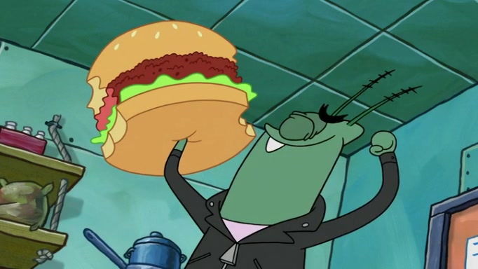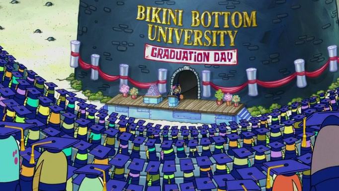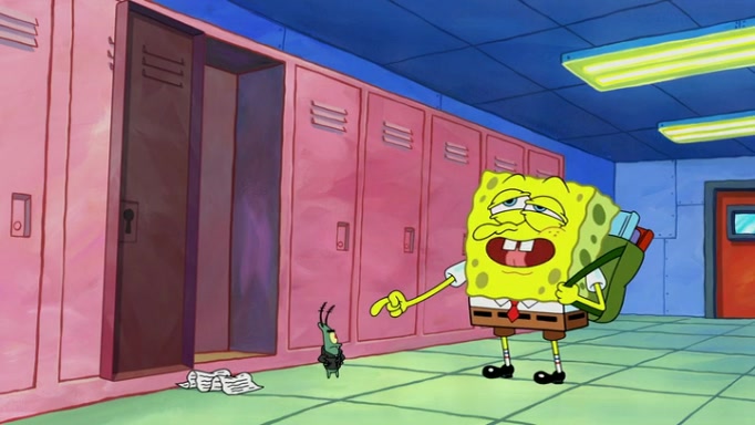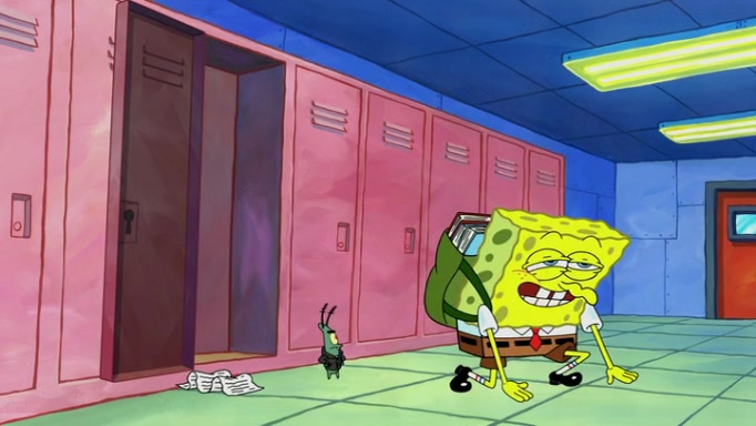Plankton, on the other hand, was unable to learn anything because he continued to act dumb and became a school bully to Mr. Krabs. On the day of graduation, Mr. Krabs perfected the Krabby Patty formula in Home EC. However, when Plankton tasted the Krabby Patty, he demanded Mr. Krabs to hand him the formula, but was stopped by SpongeBob who inexplicably showed up to give Mr. Krabs his diploma. Mr. Krabs reveals that he took accelerated classes and graduated months ago. Plankton was confused as to why all this happened, but when Sandy showed up and graded Mr. Krabs an A+ for acting everything out, he realized the Mr. Krabs was only pretending to be scared. Defeated and humiliated, Mr. Krabs threw Plankton outside and made him land on Karen's computer screen. Karen carries Plankton away so he can start his post-college years.