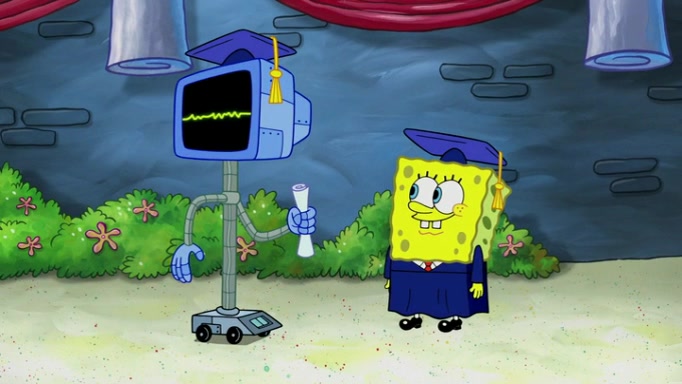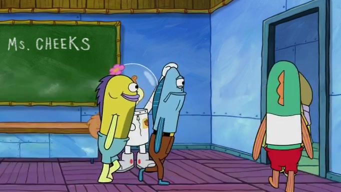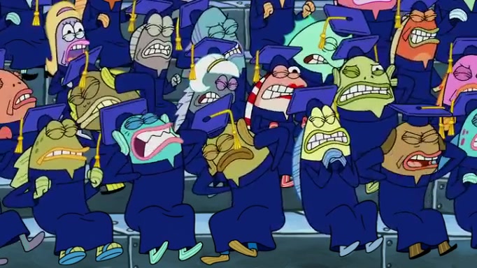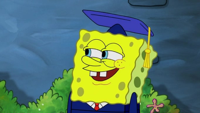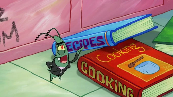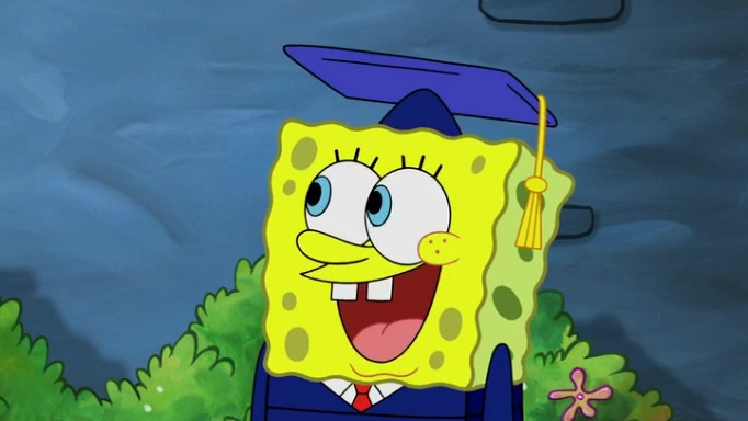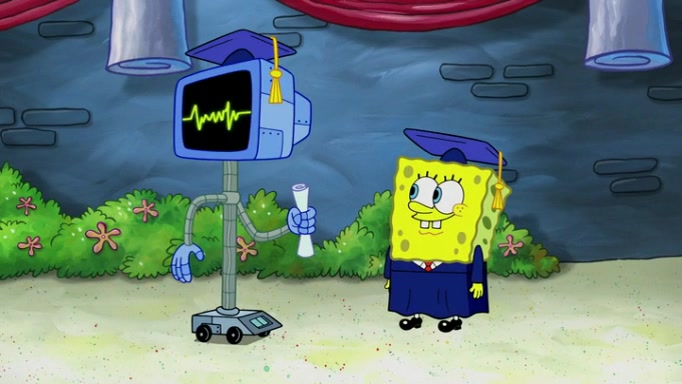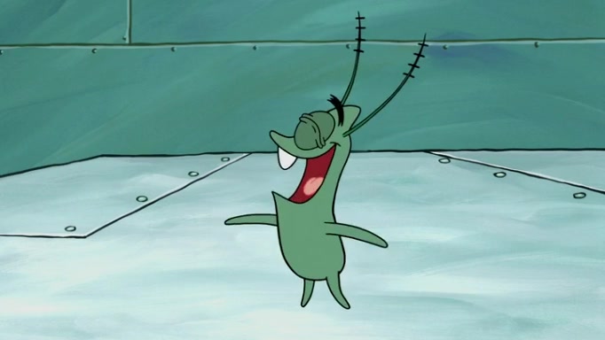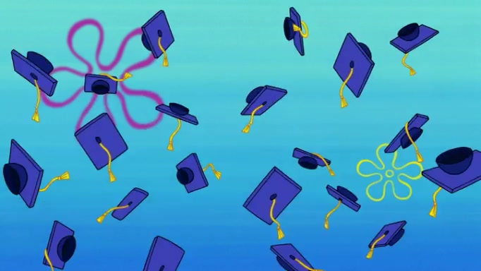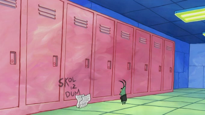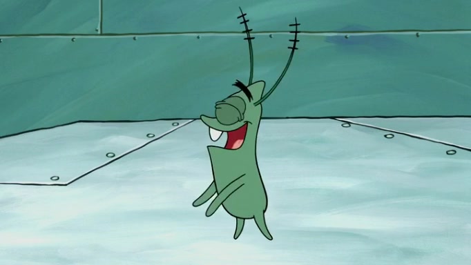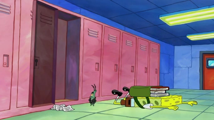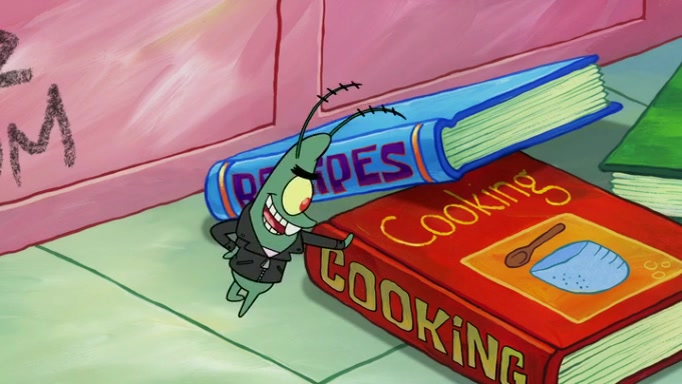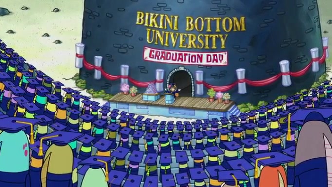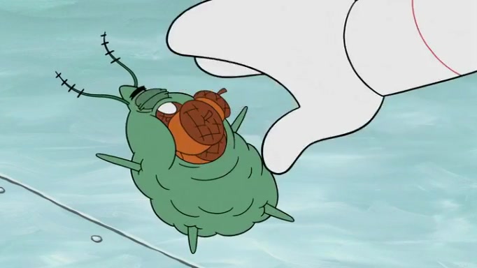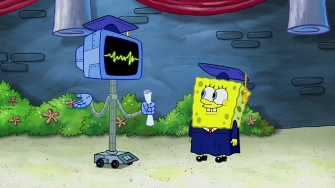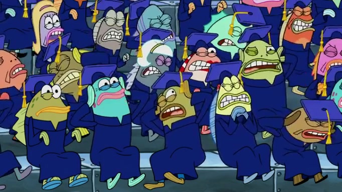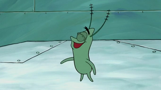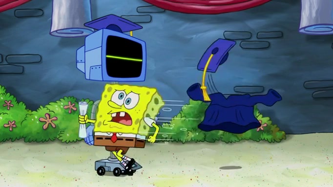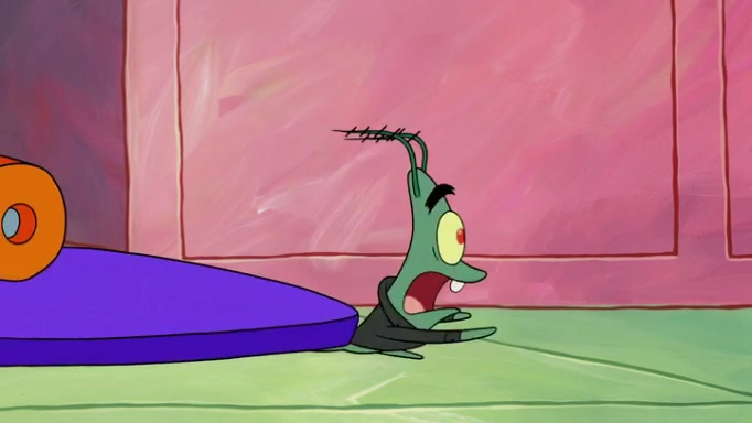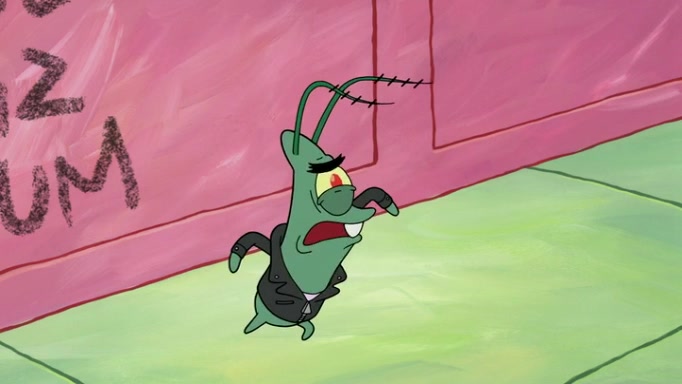 Plankton, on the other hand, was unable to learn anything because he continued to act dumb and became a school bully to Mr. Krabs. On the day of graduation, Mr. Krabs perfected the Krabby Patty formula in Home EC. However, when Plankton tasted the Krabby Patty, he demanded Mr. Krabs to hand him the formula, but was stopped by SpongeBob who inexplicably showed up to give Mr. Krabs his diploma. Mr. Krabs reveals that he took accelerated classes and graduated months ago. Plankton was confused as to why all this happened, but when Sandy showed up and graded Mr. Krabs an A+ for acting everything out, he realized the Mr. Krabs was only pretending to be scared. Defeated and humiliated, Mr. Krabs threw Plankton outside and made him land on Karen's computer screen. Karen carries Plankton away so he can start his post-college years.
