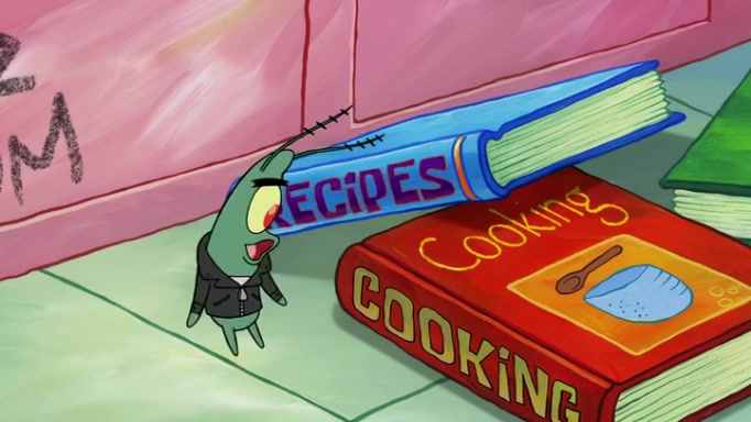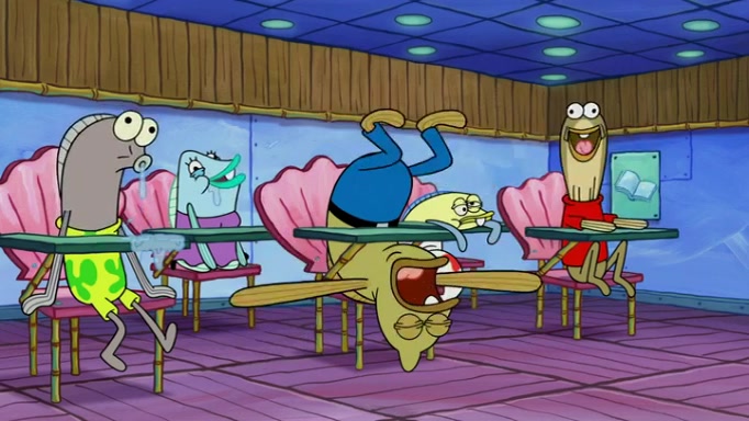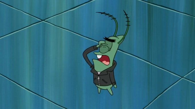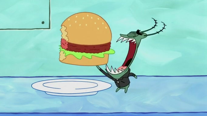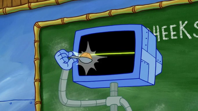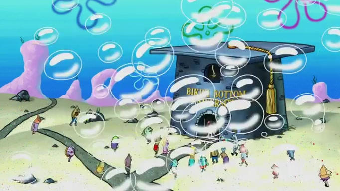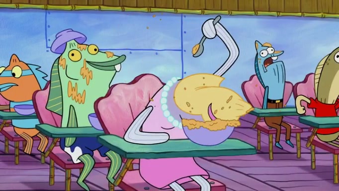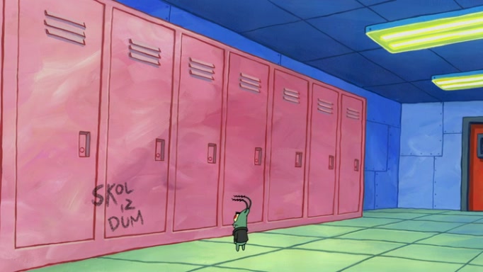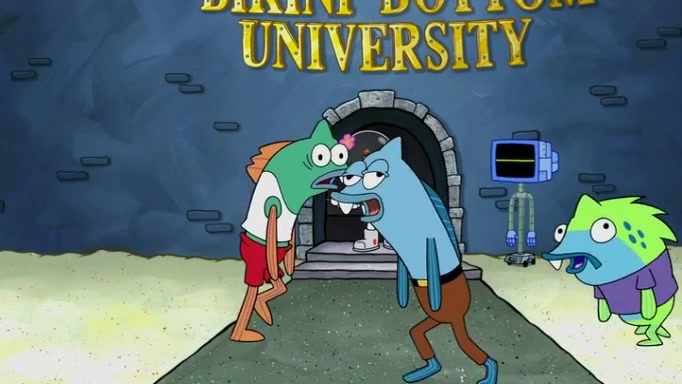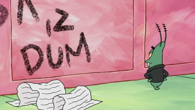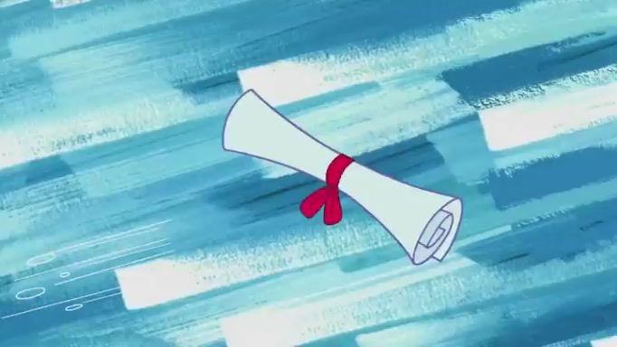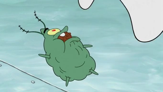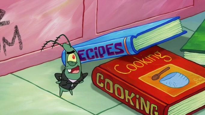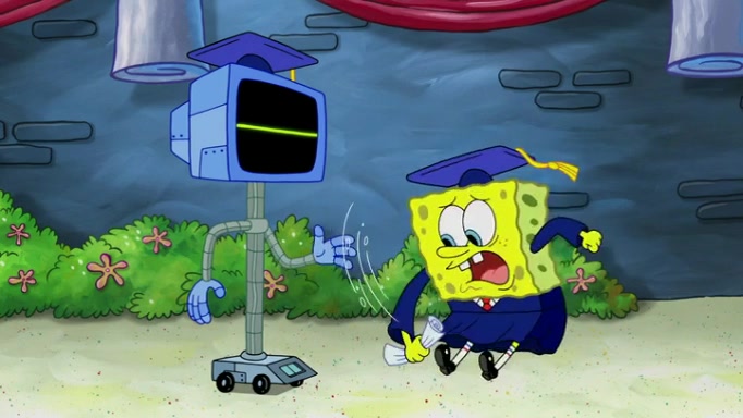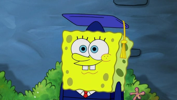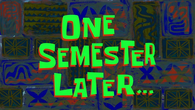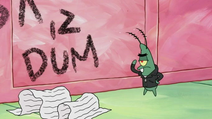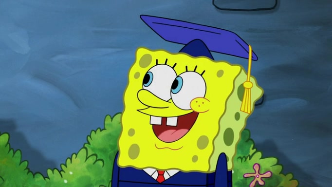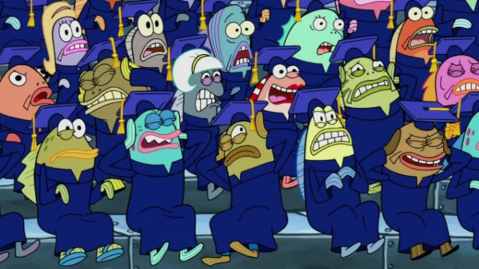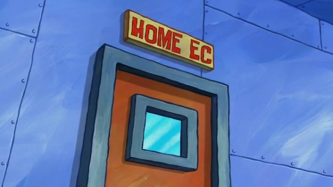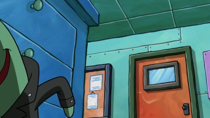 Plankton, on the other hand, was unable to learn anything because he continued to act dumb and became a school bully to Mr. Krabs. On the day of graduation, Mr. Krabs perfected the Krabby Patty formula in Home EC. However, when Plankton tasted the Krabby Patty, he demanded Mr. Krabs to hand him the formula, but was stopped by SpongeBob who inexplicably showed up to give Mr. Krabs his diploma. Mr. Krabs reveals that he took accelerated classes and graduated months ago. Plankton was confused as to why all this happened, but when Sandy showed up and graded Mr. Krabs an A+ for acting everything out, he realized the Mr. Krabs was only pretending to be scared. Defeated and humiliated, Mr. Krabs threw Plankton outside and made him land on Karen's computer screen. Karen carries Plankton away so he can start his post-college years.
