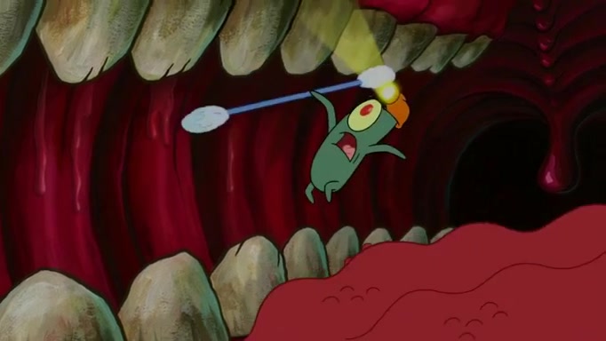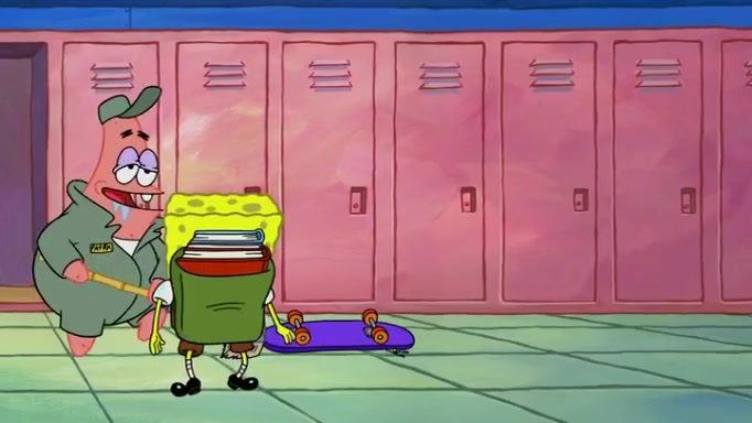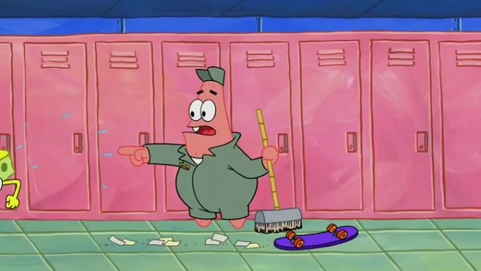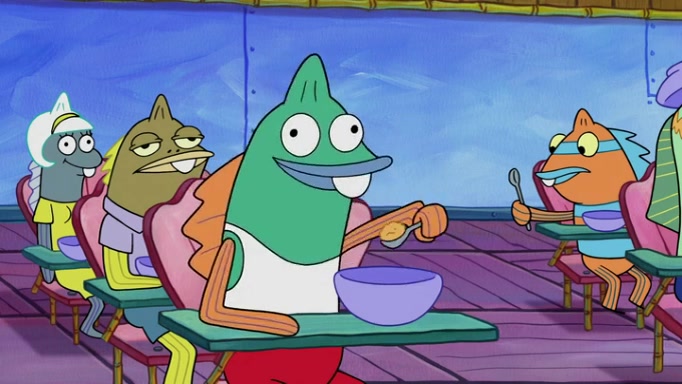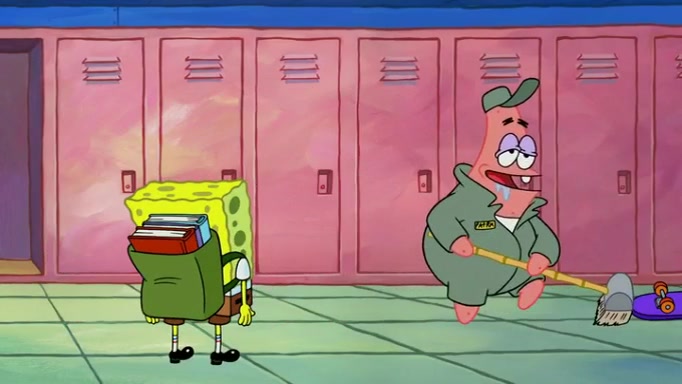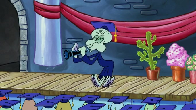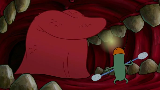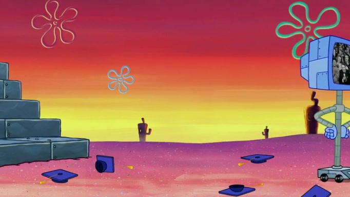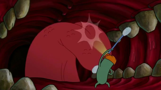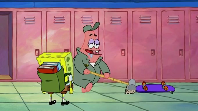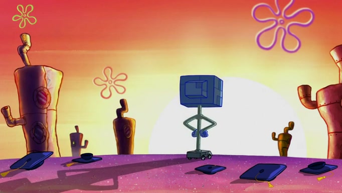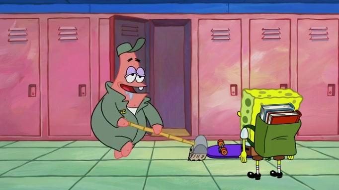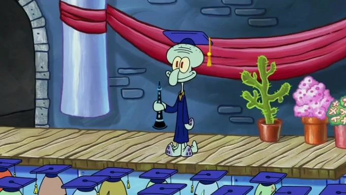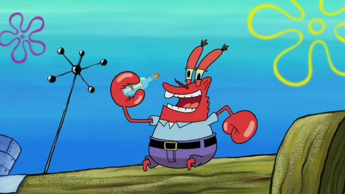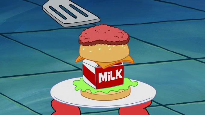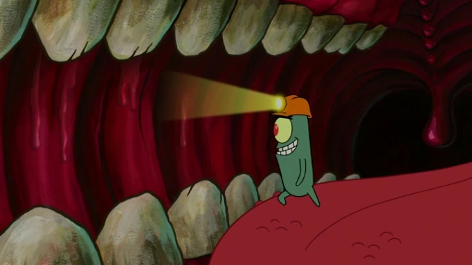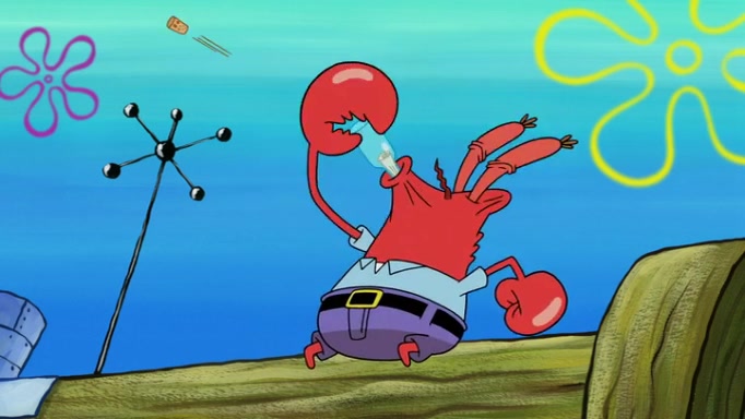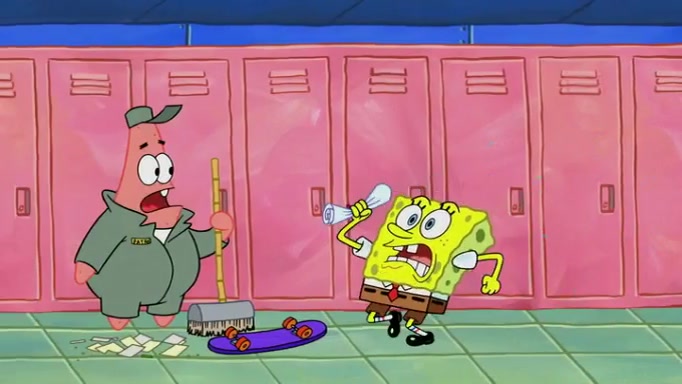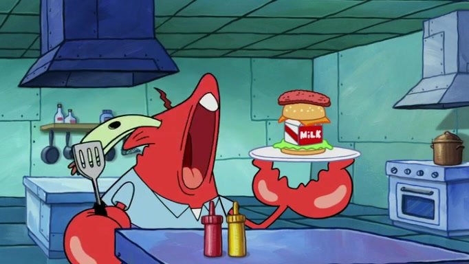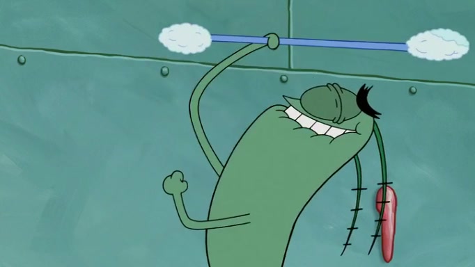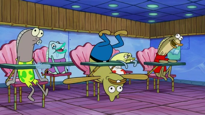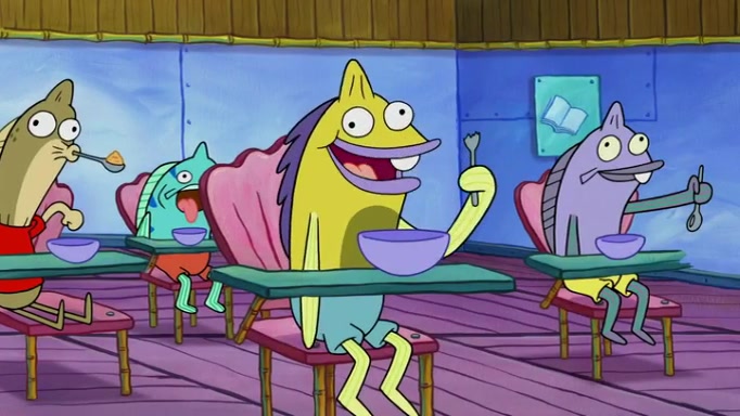 Plankton, on the other hand, was unable to learn anything because he continued to act dumb and became a school bully to Mr. Krabs. On the day of graduation, Mr. Krabs perfected the Krabby Patty formula in Home EC. However, when Plankton tasted the Krabby Patty, he demanded Mr. Krabs to hand him the formula, but was stopped by SpongeBob who inexplicably showed up to give Mr. Krabs his diploma. Mr. Krabs reveals that he took accelerated classes and graduated months ago. Plankton was confused as to why all this happened, but when Sandy showed up and graded Mr. Krabs an A+ for acting everything out, he realized the Mr. Krabs was only pretending to be scared. Defeated and humiliated, Mr. Krabs threw Plankton outside and made him land on Karen's computer screen. Karen carries Plankton away so he can start his post-college years.