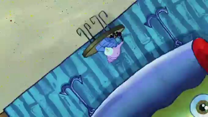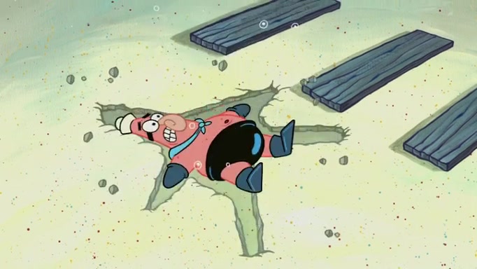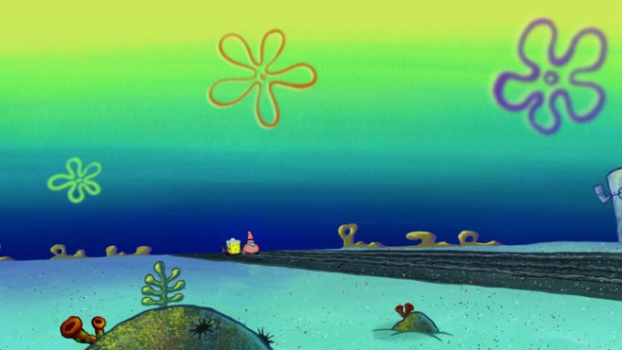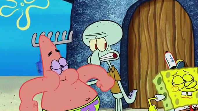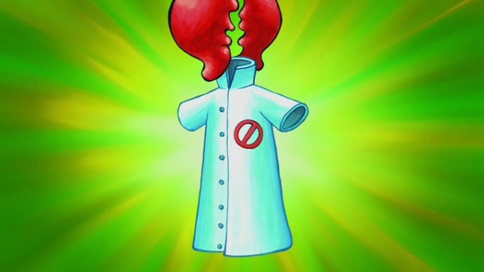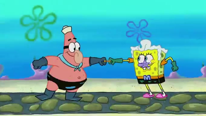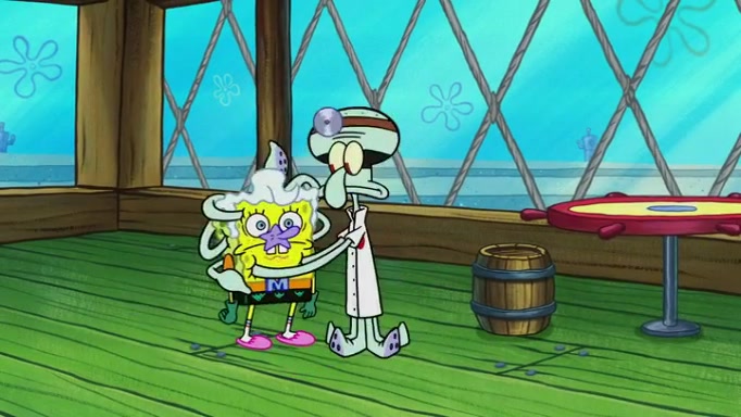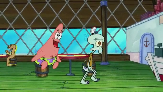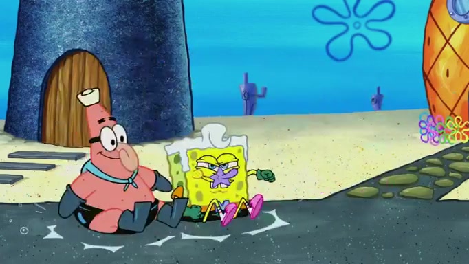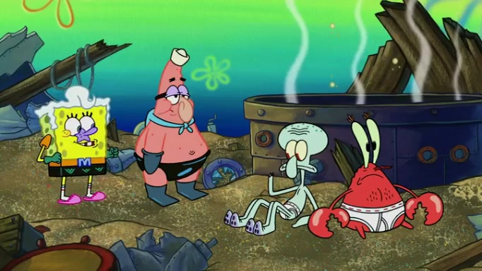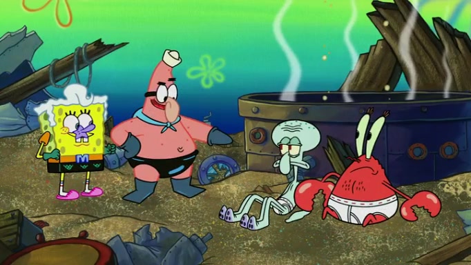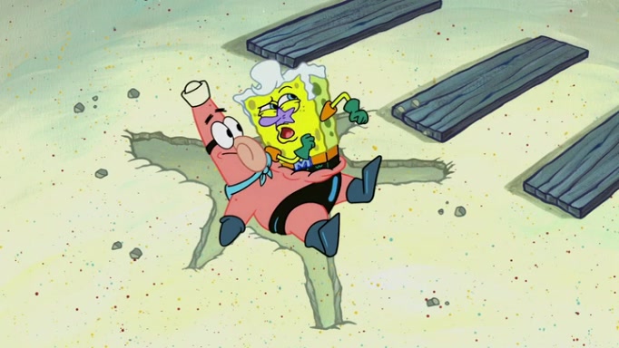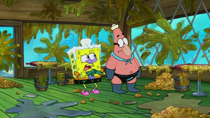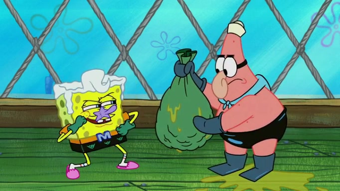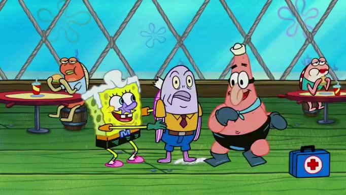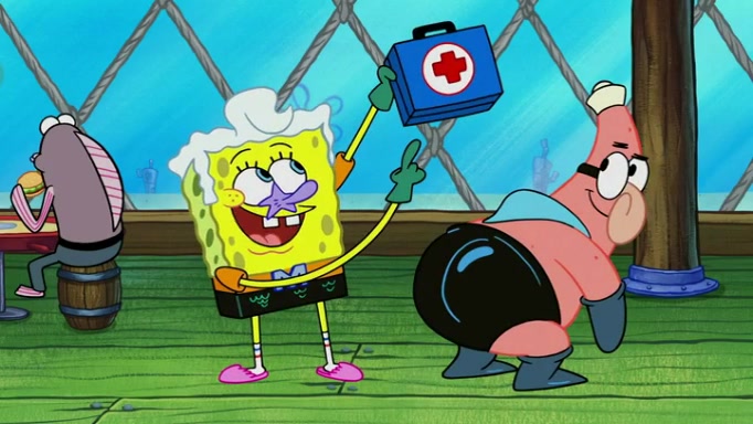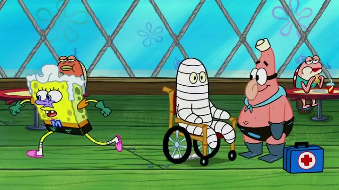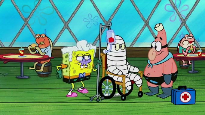 At the Krusty Krab, SpongeBob and Patrick sing the Mermaid Man/Barnacle Boy song, annoying Squidward. He tells them the song is stupid, causing SpongeBob and Patrick to transform into their costumes and call him Dr. Negative again. Patrick thinks that a nearby fish has been injured but really just has toilet paper attached to his foot from the bathroom. Patrick gets out his first aid kit and they mummify the fish and put him in a wheelchair. Patrick then burns the fish's eyes with peroxide. Angered, the fish moves himself away. Squidward then tells them they have to take the trash out.