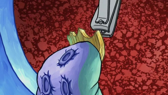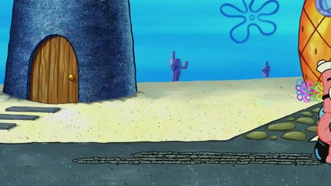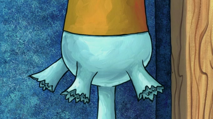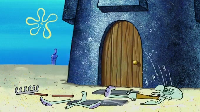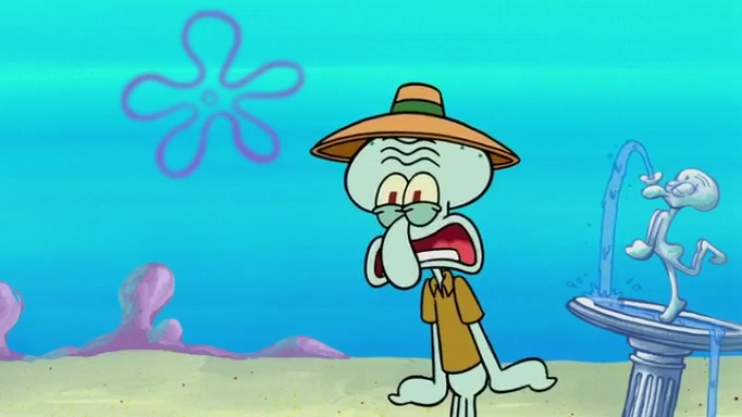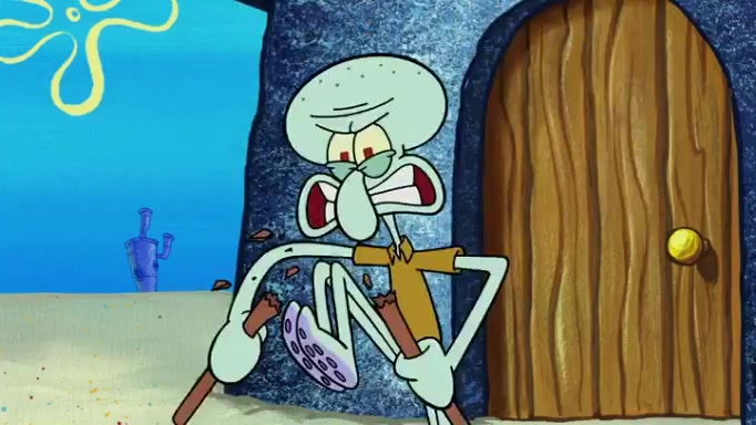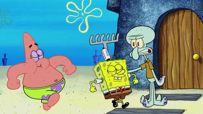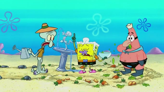 Squidward is then seen watering his garden, who SpongeBob and Patrick think is raising mutant vegetables to attack. While Squidward goes to refill his water, SpongeBob and Patrick destroy Squidward's garden, making salad and eating it, which angers Squidward in the process. He breaks his legs in frustration, but loses balances and falls down.