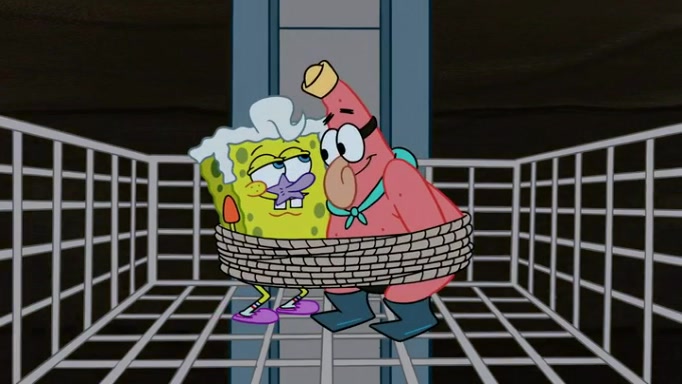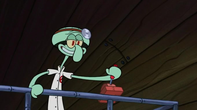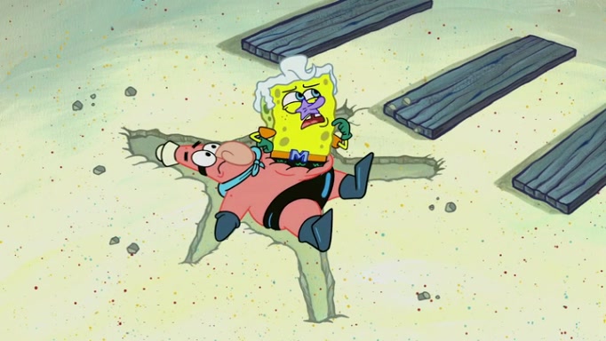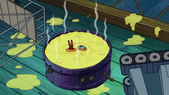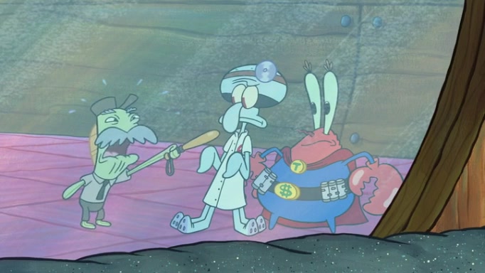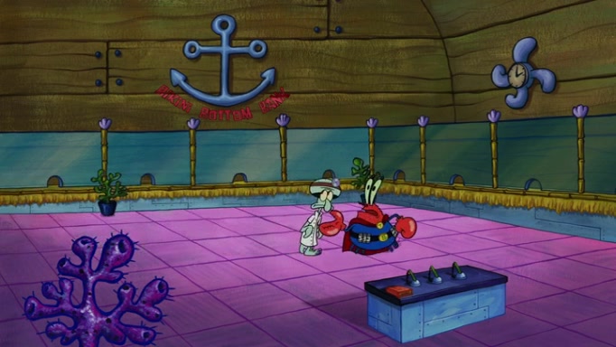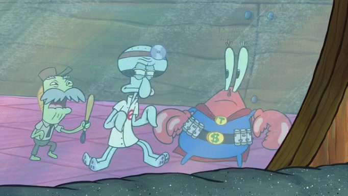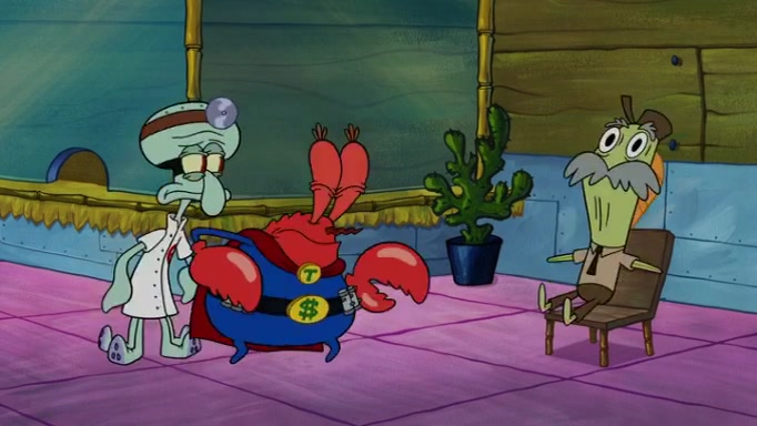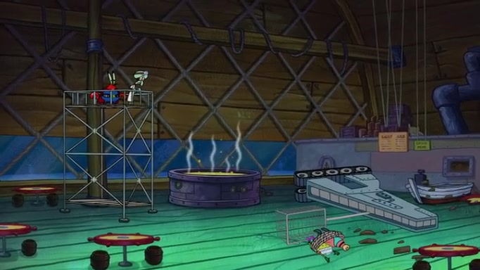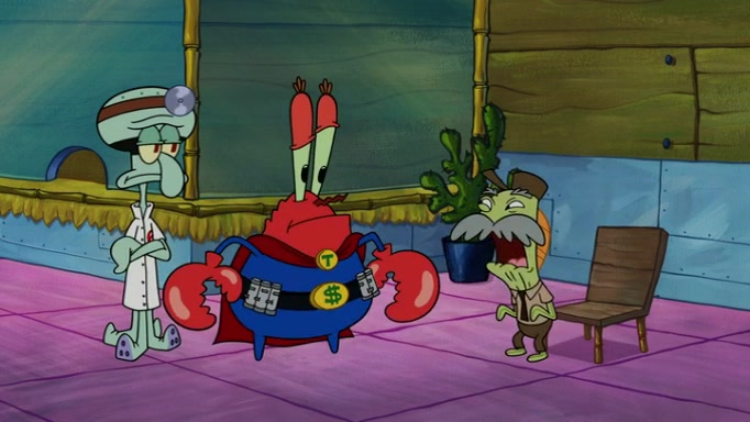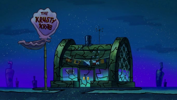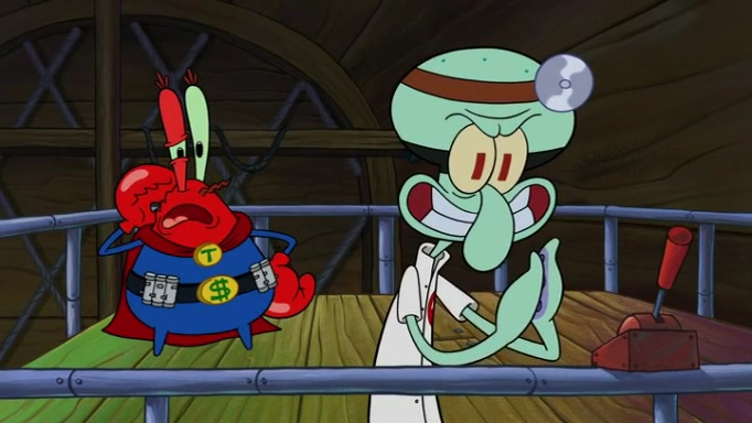 The setting then changes to a bank, where Krabs pretends to rob the bank. An old man tells him that the ATM is outside, but then attacks Squidward and Krabs after they said they were pretending to rob the bank. At night, the Krusty Krab, now called the Lair, has transformed into a scientific evil lab. SpongeBob has a crime scene set so they can play, but Squidward takes it seriously, thinking it's his chance to knock his neighbors out. He actually lowers the lever on the trap sending SpongeBob and Patrick down towards boiling grease. Squidward wants them to fry but Krabs gives up because Squidward is literally playing the bad guy. SpongeBob and Patrick free themselves by tipping the lift, but Squidward and Krabs get fried and the Krusty Krab is now destroyed.
