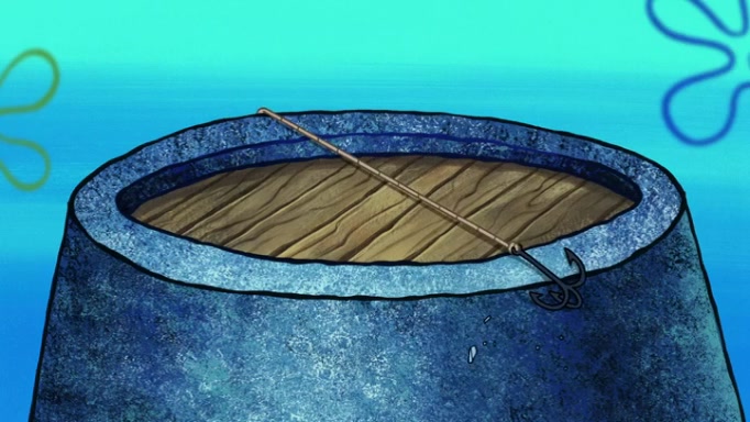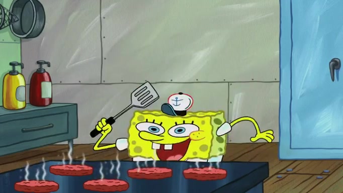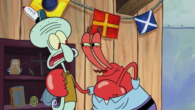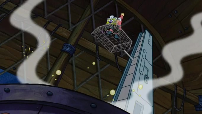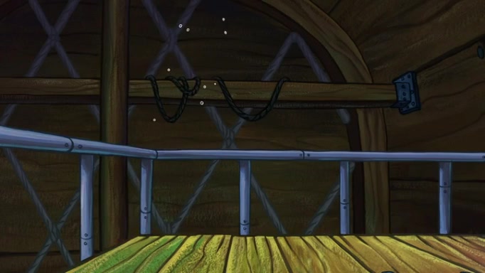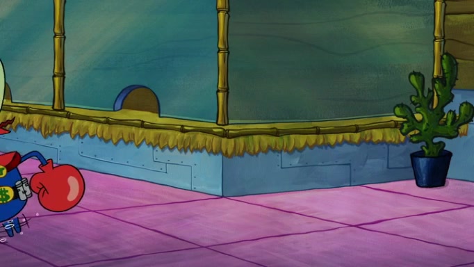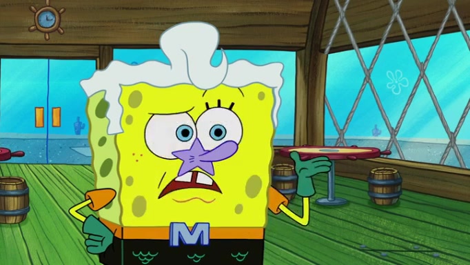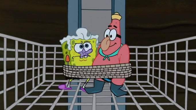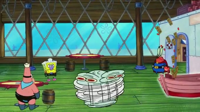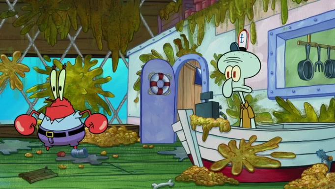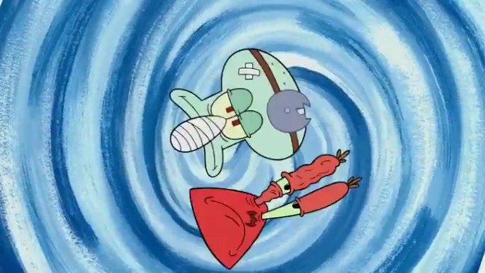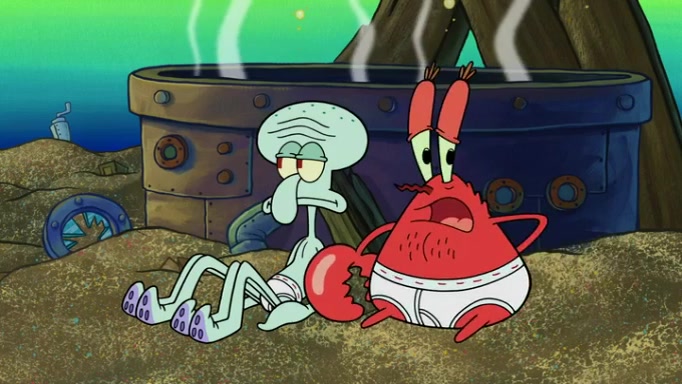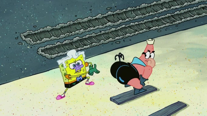 The setting then changes to a bank, where Krabs pretends to rob the bank. An old man tells him that the ATM is outside, but then attacks Squidward and Krabs after they said they were pretending to rob the bank. At night, the Krusty Krab, now called the Lair, has transformed into a scientific evil lab. SpongeBob has a crime scene set so they can play, but Squidward takes it seriously, thinking it's his chance to knock his neighbors out. He actually lowers the lever on the trap sending SpongeBob and Patrick down towards boiling grease. Squidward wants them to fry but Krabs gives up because Squidward is literally playing the bad guy. SpongeBob and Patrick free themselves by tipping the lift, but Squidward and Krabs get fried and the Krusty Krab is now destroyed.
