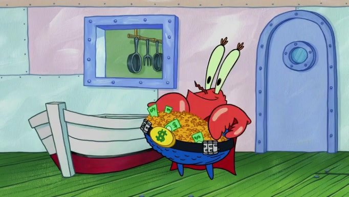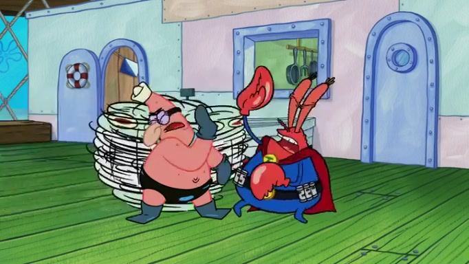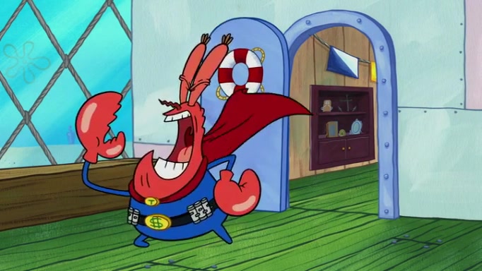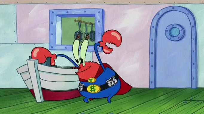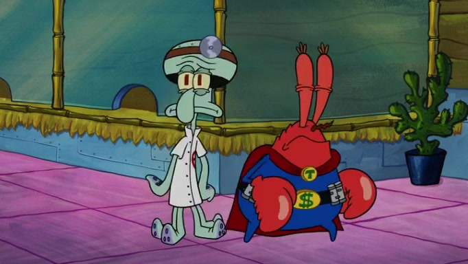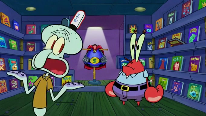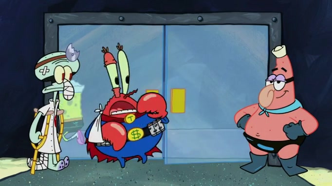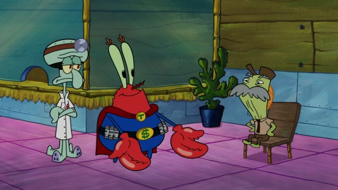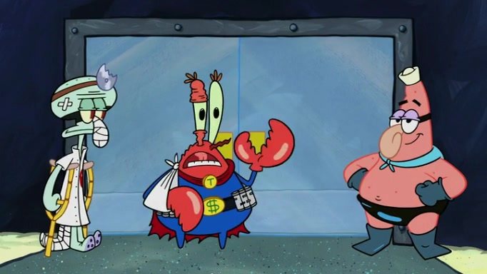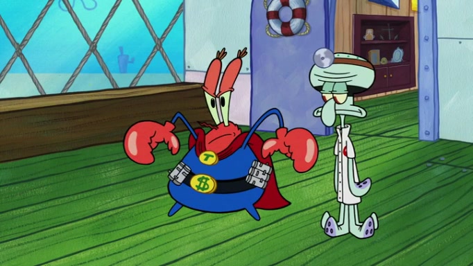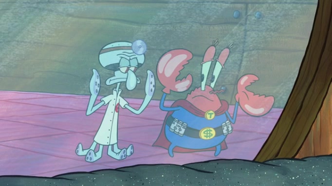 SpongeBob and Patrick punch the trash and it lands on the customers and they leave angered. Mr. Krabs is angry that all his customers are gone and he calls Squidward into his office. He shows his secret room, with comic books, and also with a suit that Krabs sewed up himself. Krabs then puts on the suit, called Captain Tightwad, with Squidward playing the doctor. Krabs sends out lassos to attack SpongeBob and Patrick, but all miss. He then throws Squidward at SpongeBob and he gets stuck. He manages to break free, but spins out and knocks objects, including money. SpongeBob then questions their fighting and opens up his comic book, which states that no superhero should fight a bad guy until the bad guy commits a crime. Mr. Krabs then steals his own money, but SpongeBob isn't stupid to realize that.