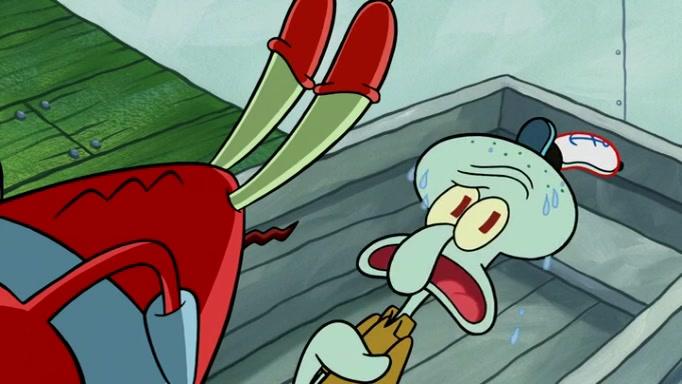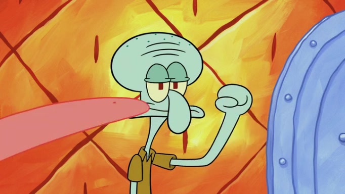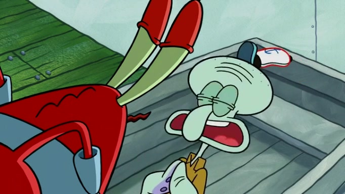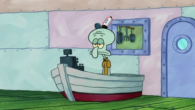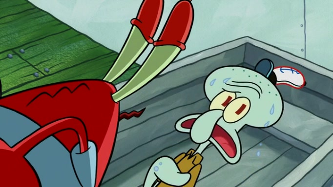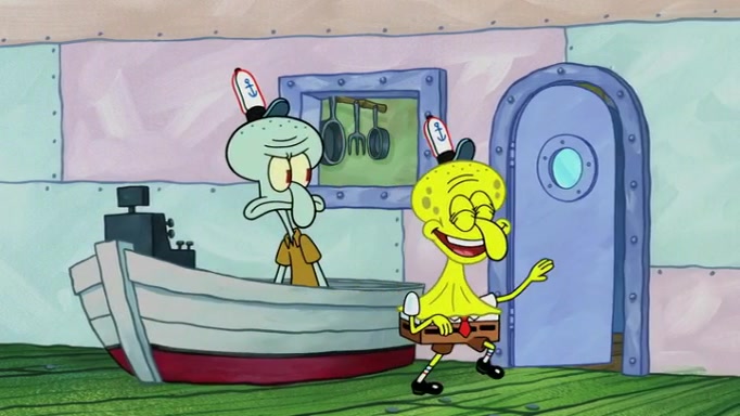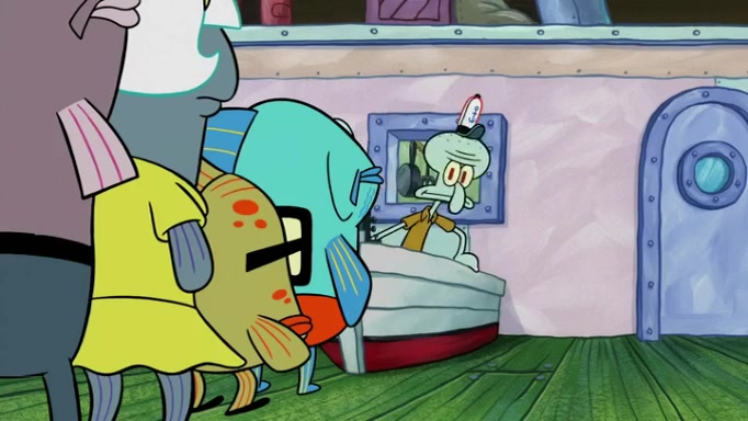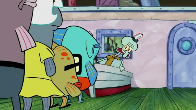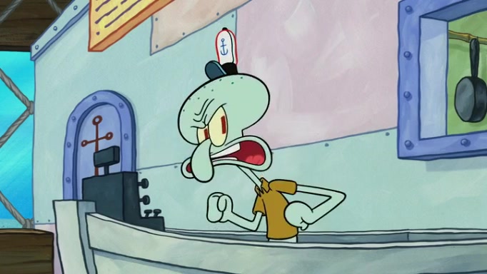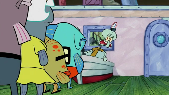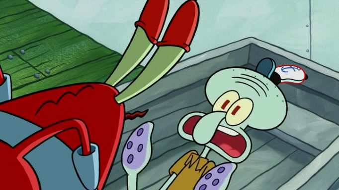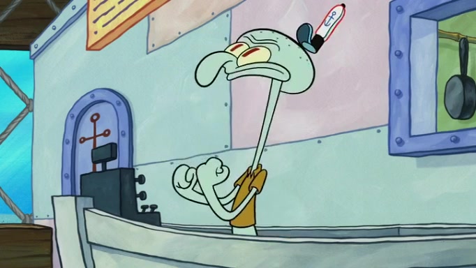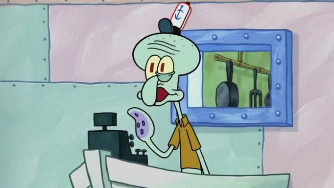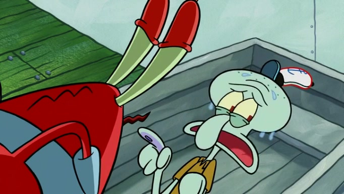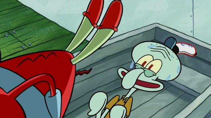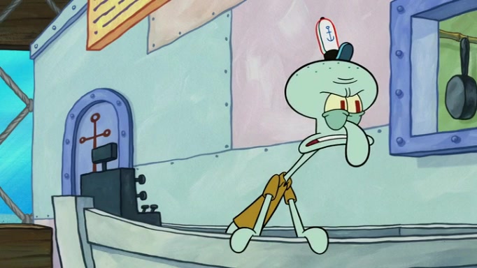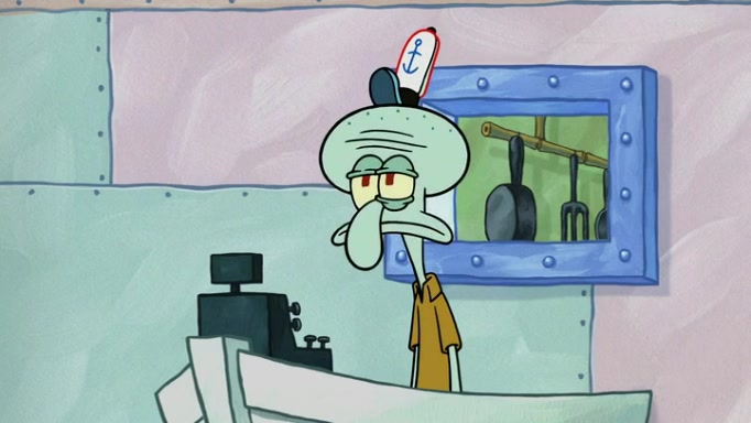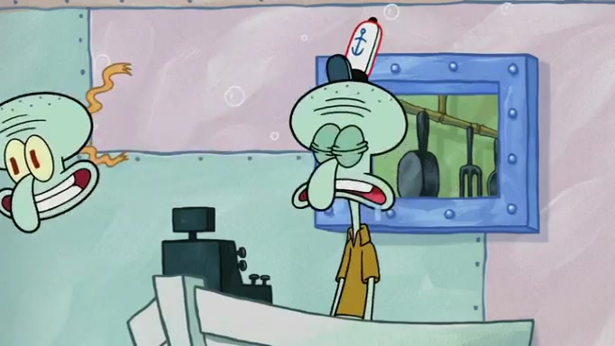 The episode ends with a focus of a laughing Squidward's eyes, as his distraught real self is demanding to be let out of his subconscious.