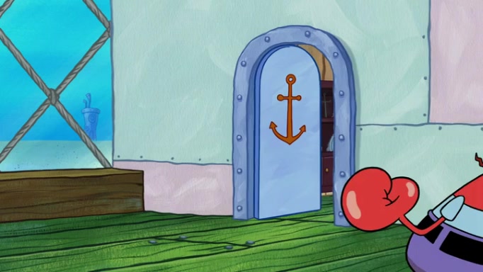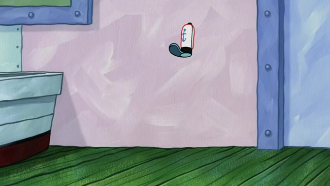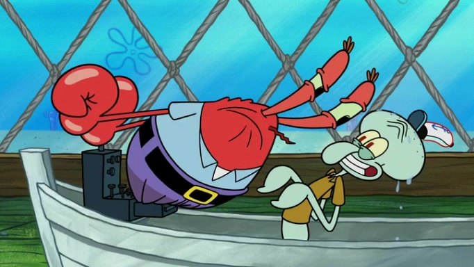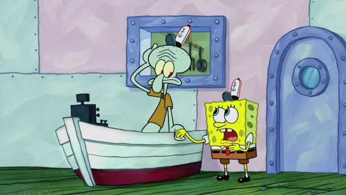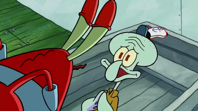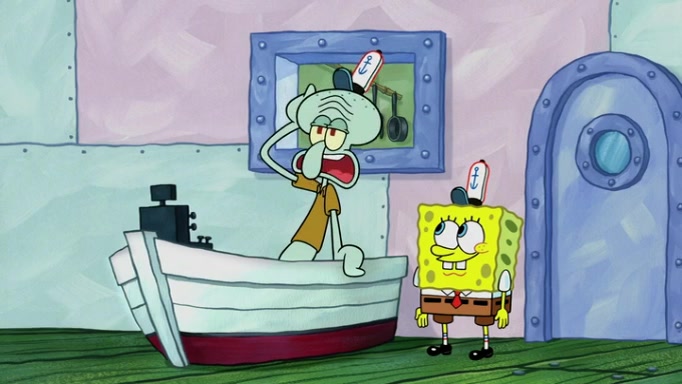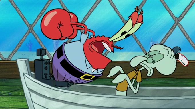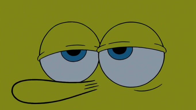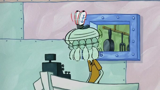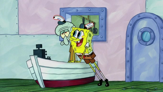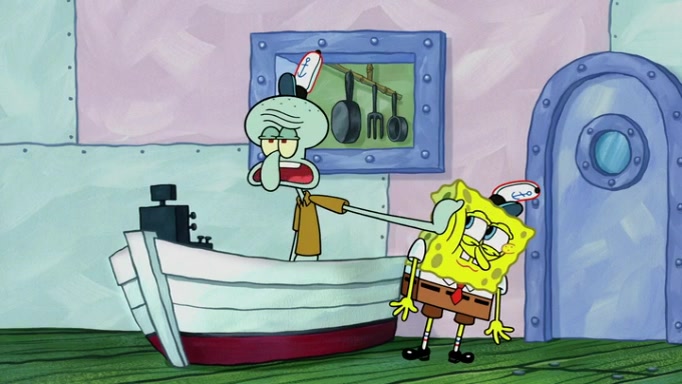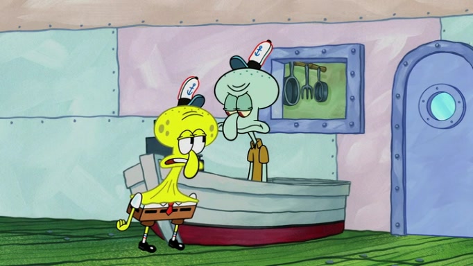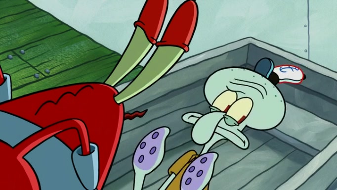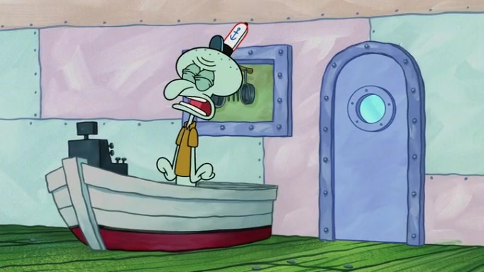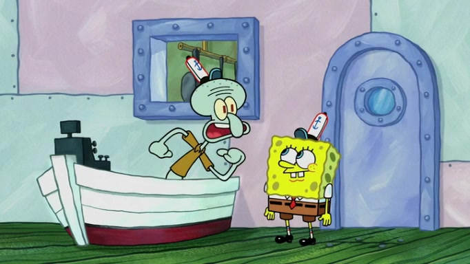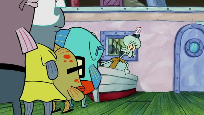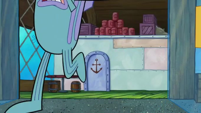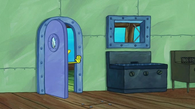 The episode ends with a focus of a laughing Squidward's eyes, as his distraught real self is demanding to be let out of his subconscious.