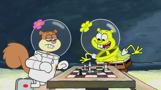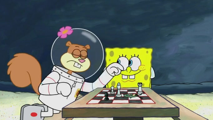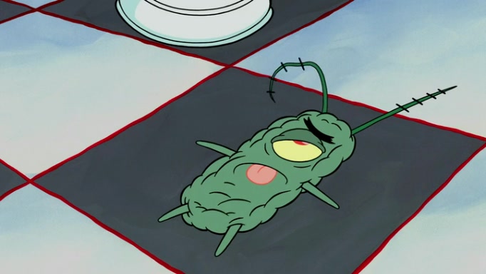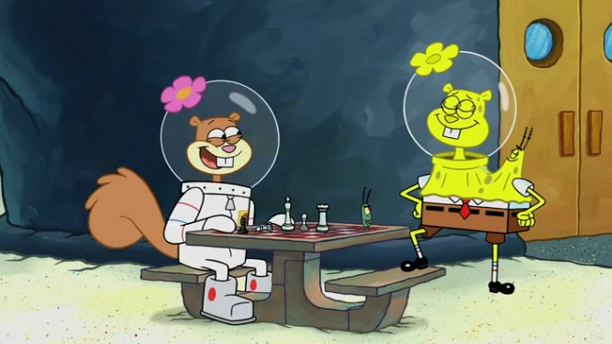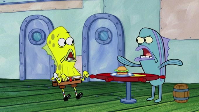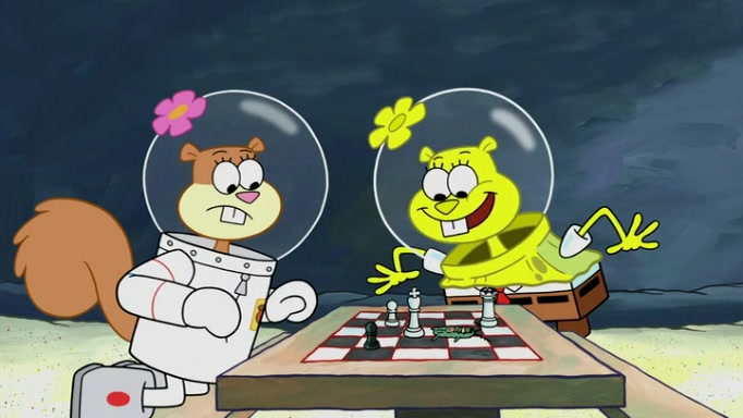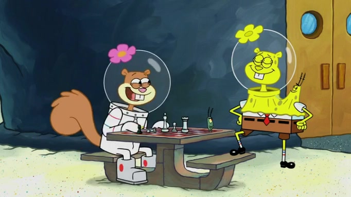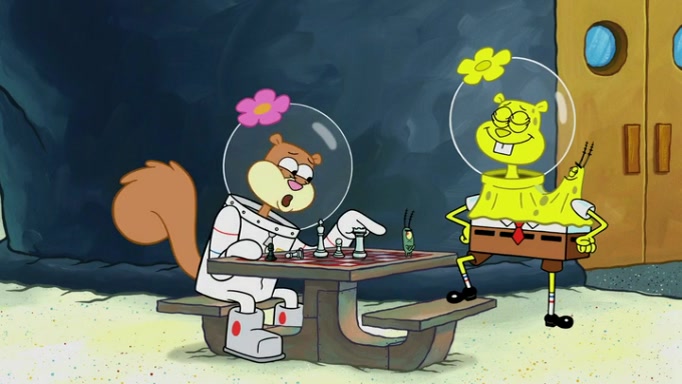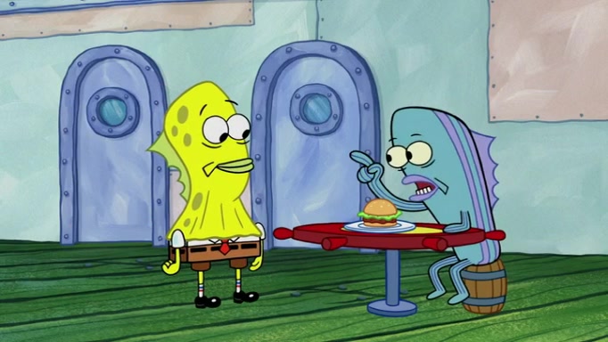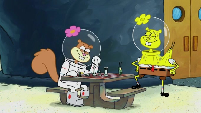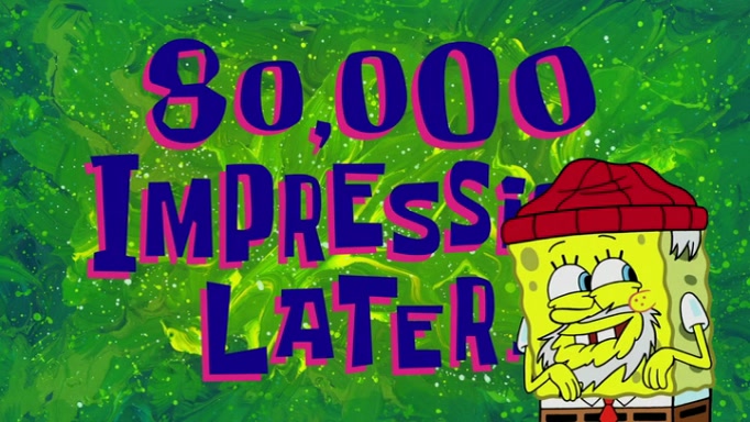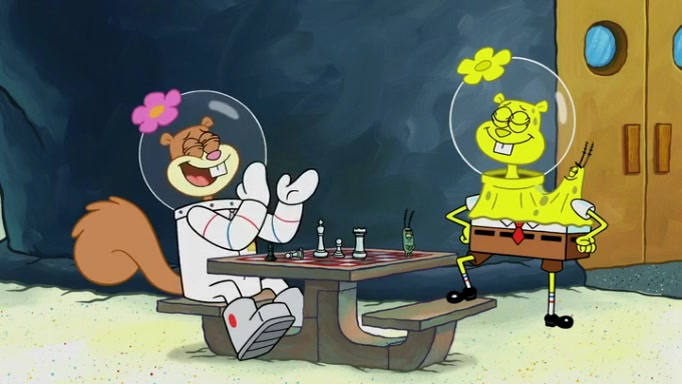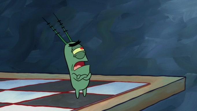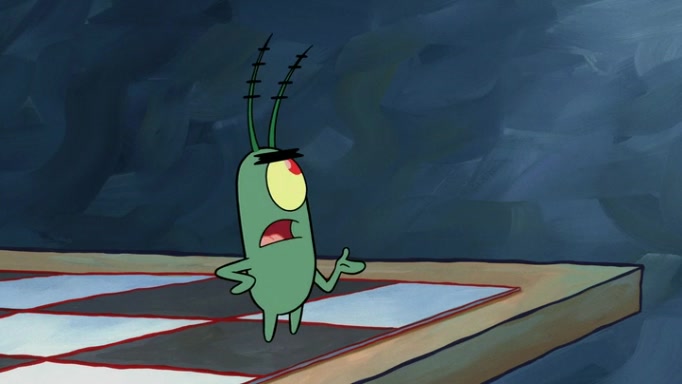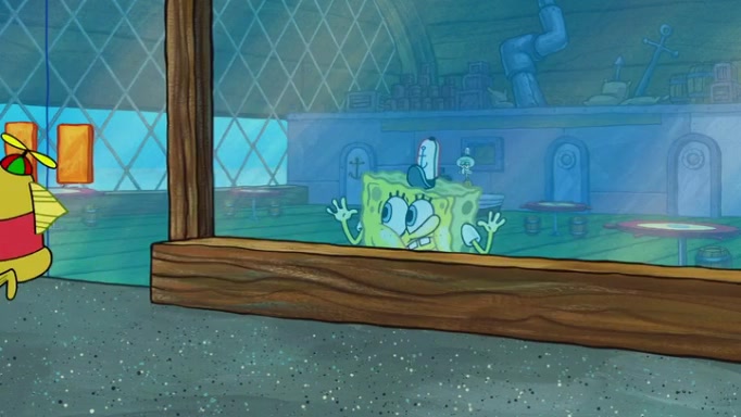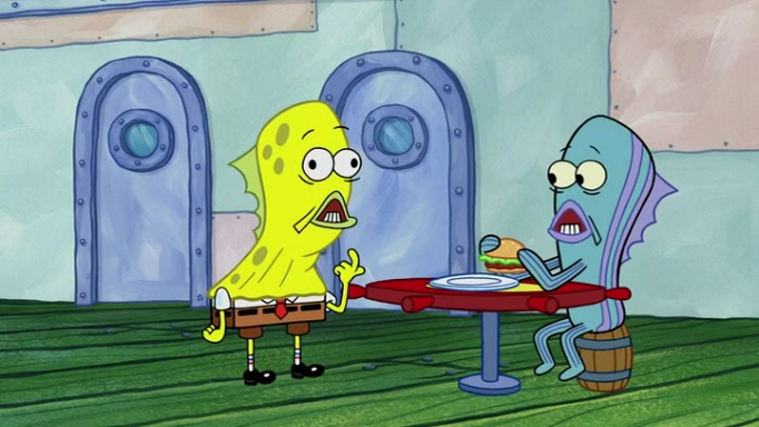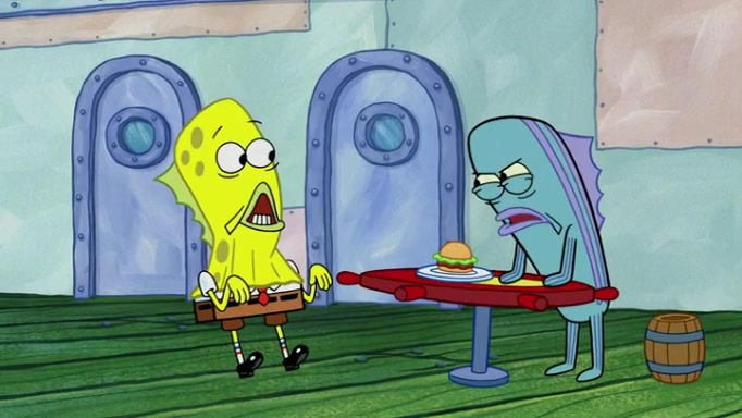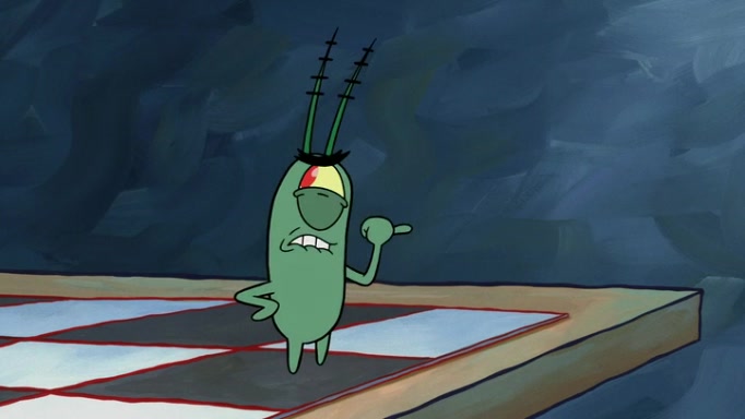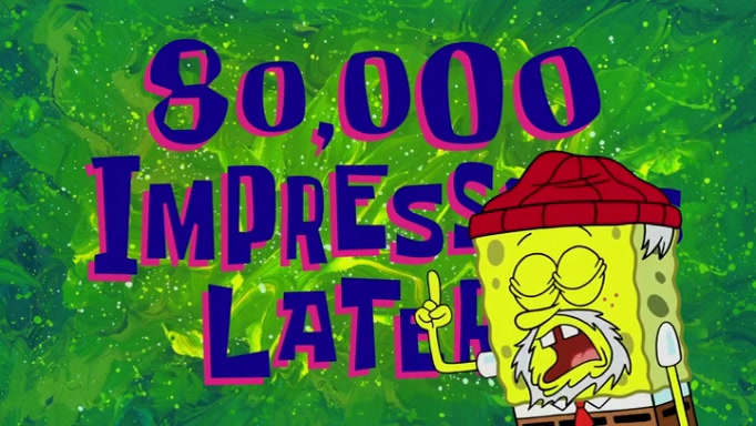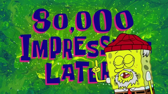 SpongeBob then imitates Sandy and Plankton, while they are playing a game of chess. Sandy admires the imitation, but Plankton says that he got his voice incorrect. He also imitates the French Narrator by reading the "80,000 Impressions Later..." time card in his voice as the narrator complains about it.