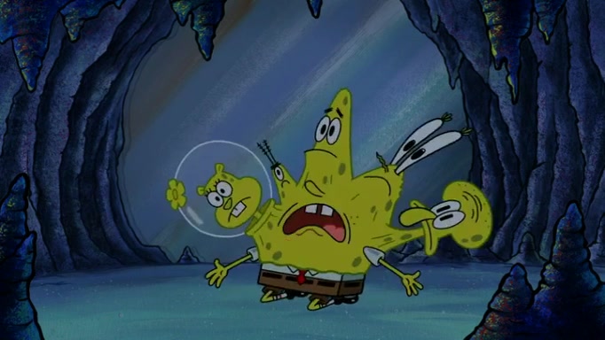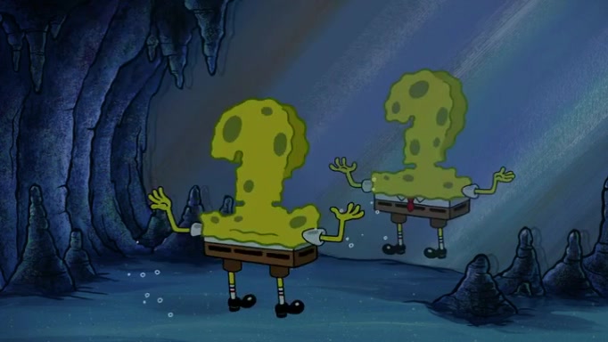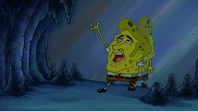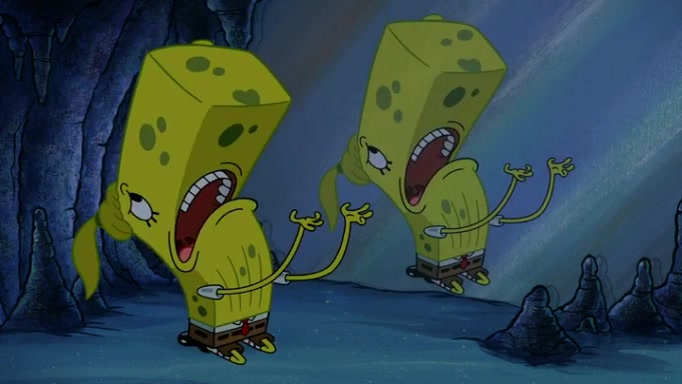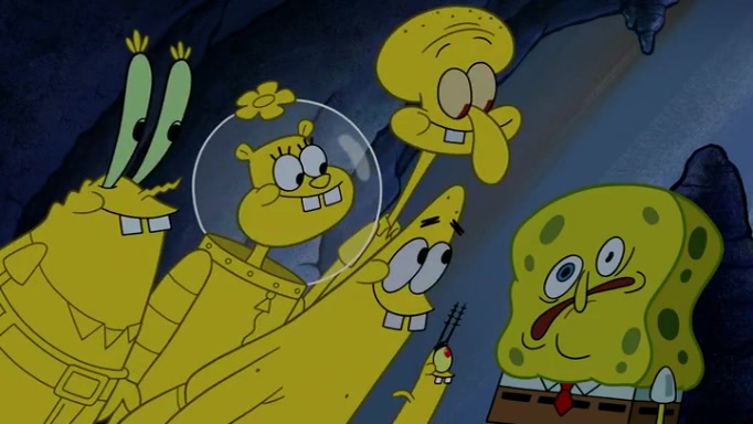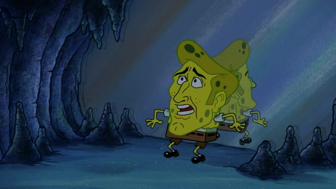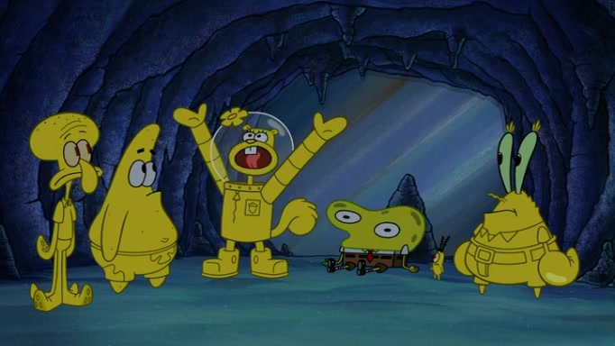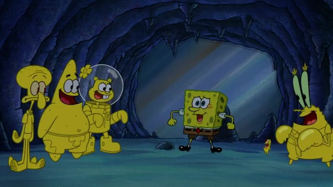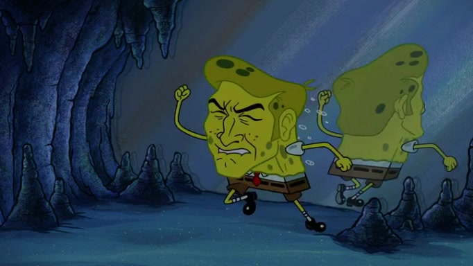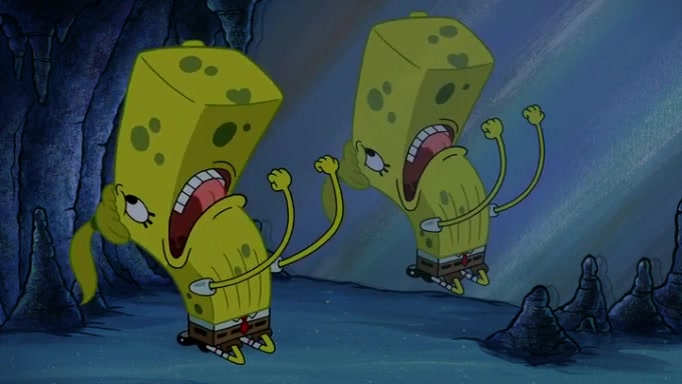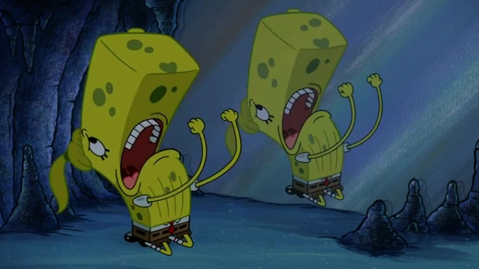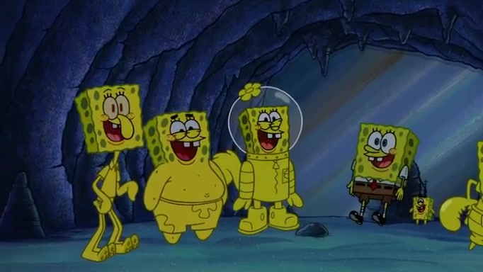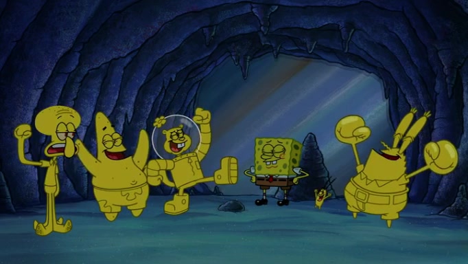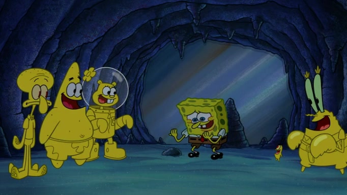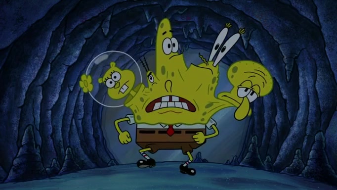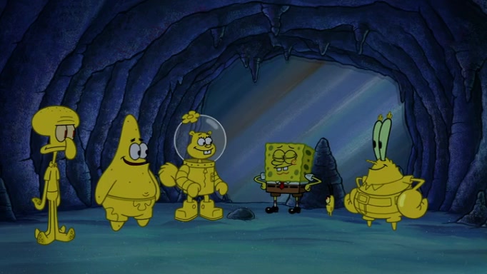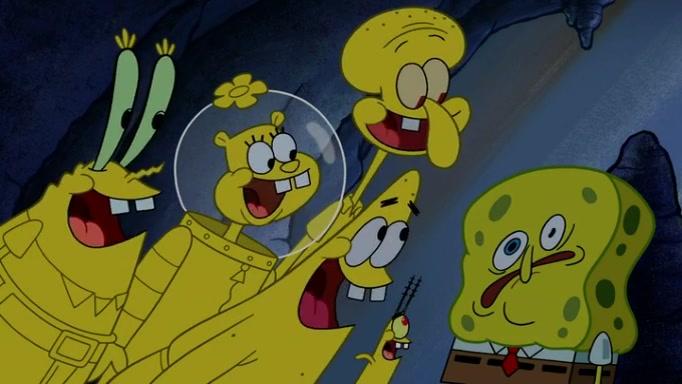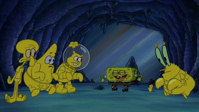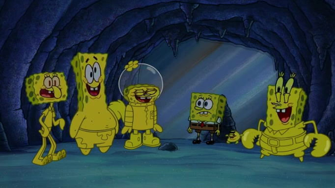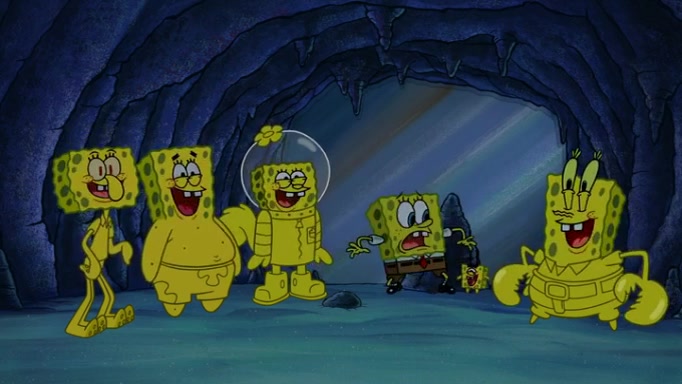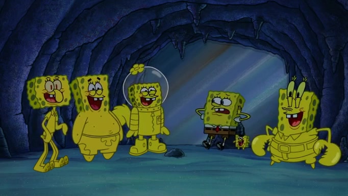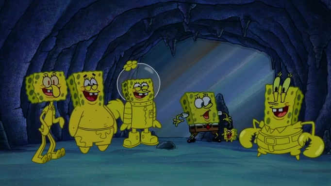 SpongeBob goes to live in a cave in regrets of not remembering himself. His friends find him and end up mimicking him in order to bring back SpongeBob. It ends up working, but the others get the Mocking Mimicry Madness as well and end up acting like SpongeBob. At first, SpongeBob is shocked, but gets adjusted to it as they all laugh crazily like him.