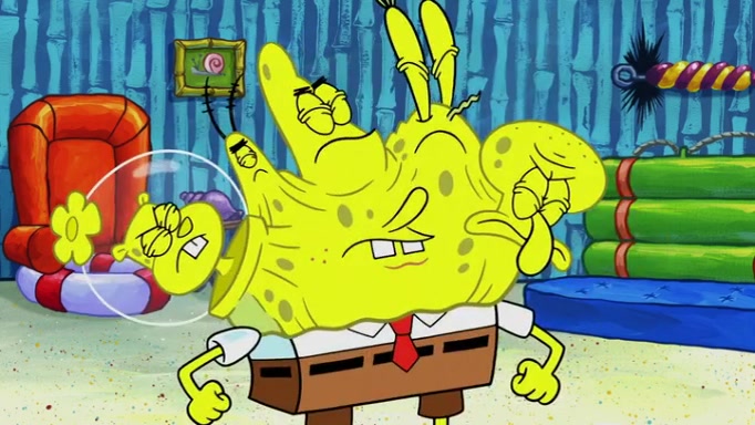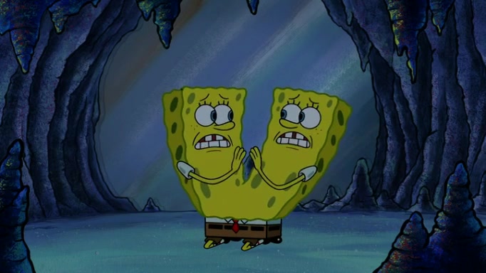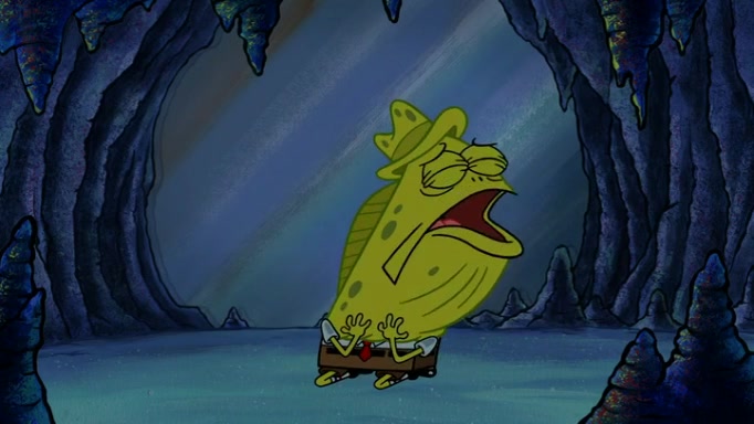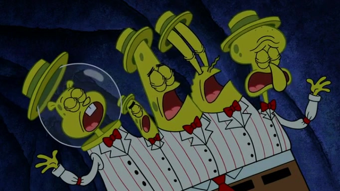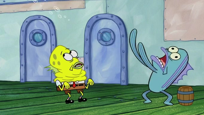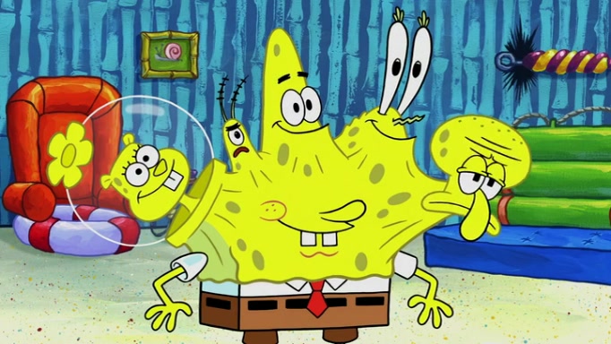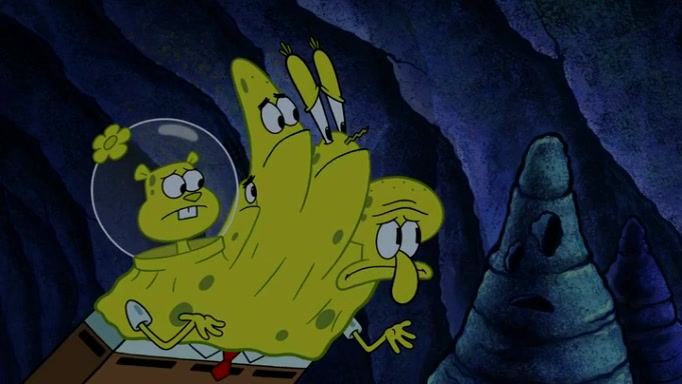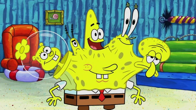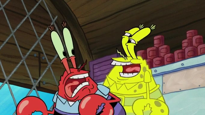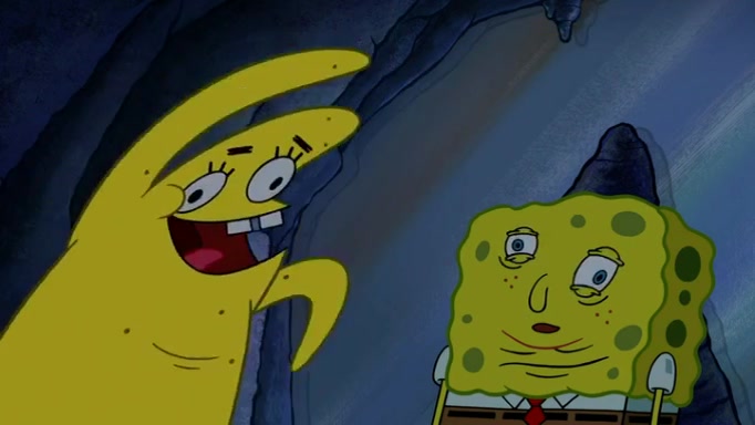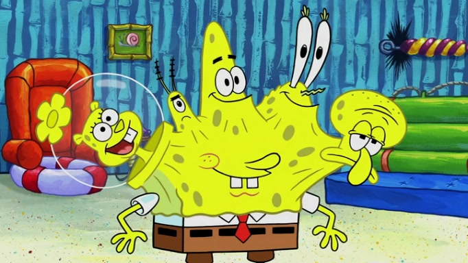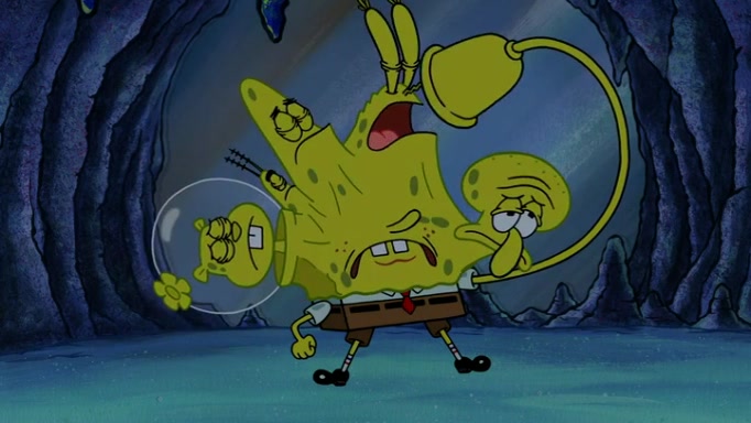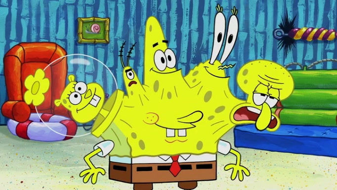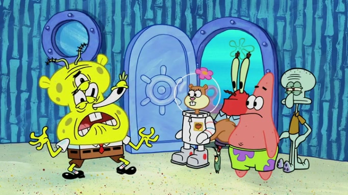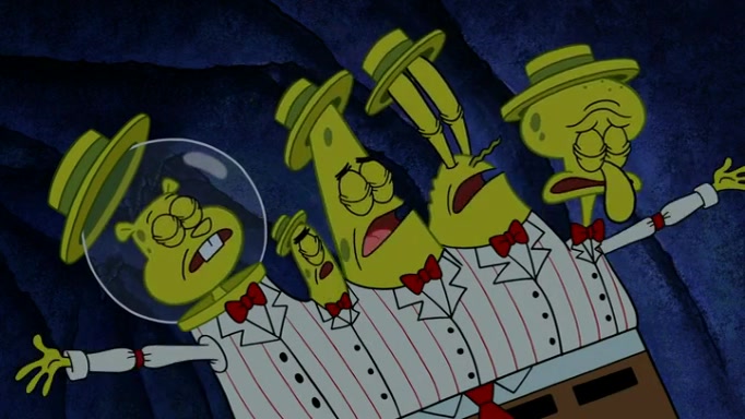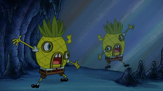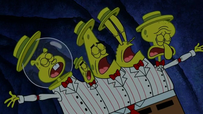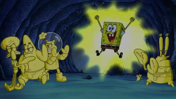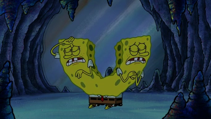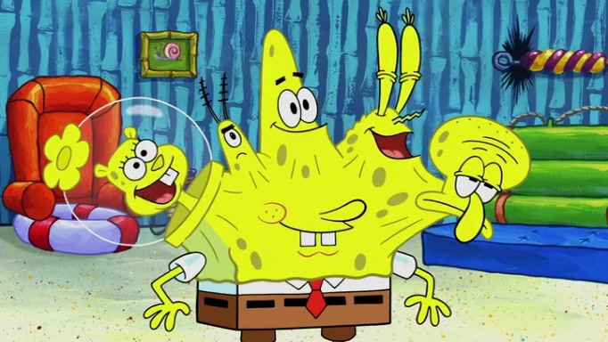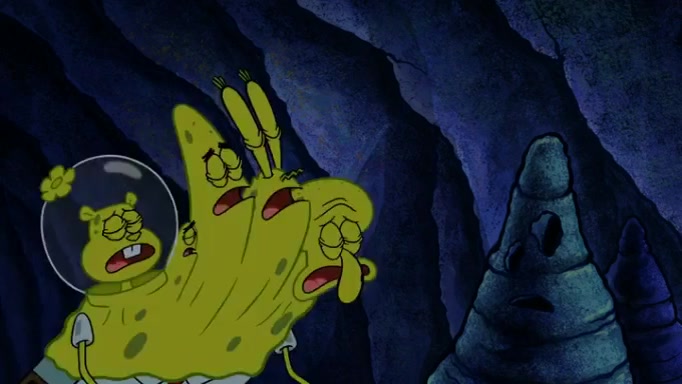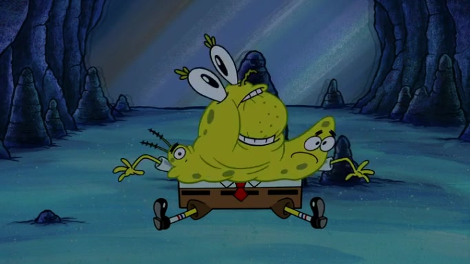 SpongeBob goes to live in a cave in regrets of not remembering himself. His friends find him and end up mimicking him in order to bring back SpongeBob. It ends up working, but the others get the Mocking Mimicry Madness as well and end up acting like SpongeBob. At first, SpongeBob is shocked, but gets adjusted to it as they all laugh crazily like him.