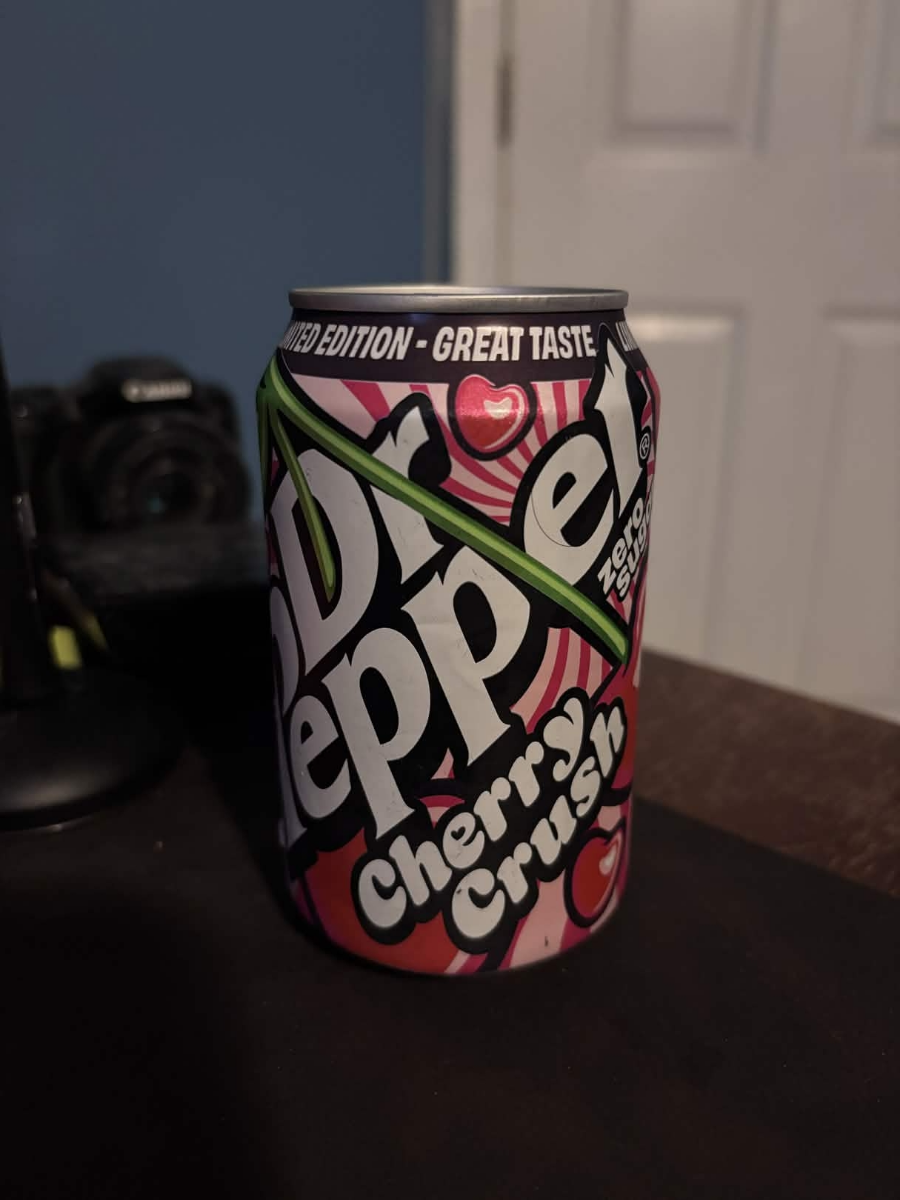 Fizzin' About. This is going to be interesting. It's quite different than domestic, actually. Being an avid fan of the Domestic Cherry Zero, Dr. Pepper Zero Cherry Crush is a different take on the flavor, it tastes more... Natural Cherry Flavored? I guess you could say? Doesn't really have much of a Dr. Pepper flavor, which was something that went well with the Domestic Cherry Zero, and both are not as good as my all-time forever favorite, Diet Cherry Vanilla. A can of that shit with a small old CRT TV hooked up to Boomerang, and some Pizza Rolls, you have me set. Would I Recommend? - If you want to see a different worldview on Dr. Pepper Zero Cherry, sure... otherwise, no... just buy the Domestic, it's easier to find, more plentiful and honestly... kinda better. Would I buy if it got a US Counterpart? - No, no not really. See you tomorrow.1 point