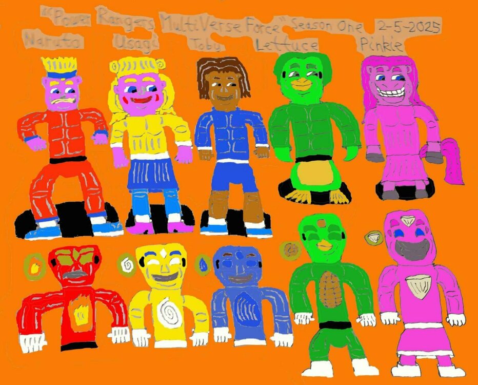 In case you're wondering why I'm only just NOW finally posting an art topic, is because someone FINALLY told me how to paste artwork on here (thanks Rebel The Wolfgirl!) Anyways, this will mostly be artwork I CAN'T sell (because I don't own most of the characters, so I can't have any intention of making any money off of those artworks), but I still make these artworks for the practice. So, with that explanation out of the way; here is first and fore-most, a character sheet of the main cast of the first season of "Power Rangers Multiverse Force", approved by Rebel The Wolfgirl! And yes, it IS my first time drawing Anime characters AND Power Ranger costumes; so bear with me! /