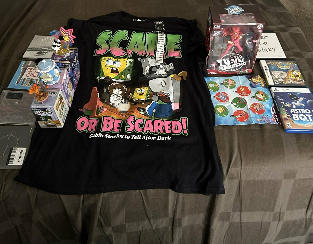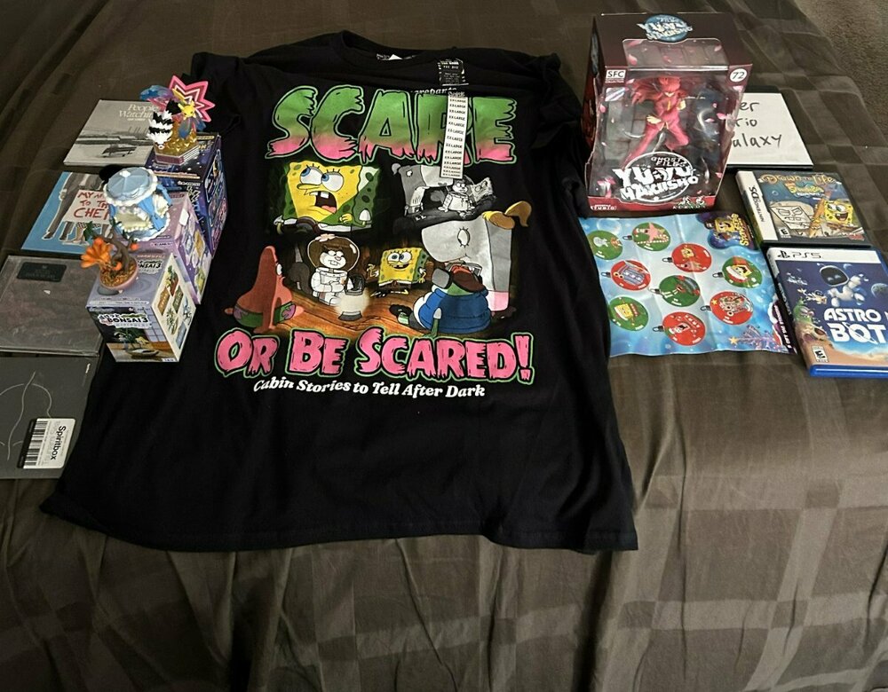-Playstation 5 (not pictured) -Astro Bot -Used copy of Super Mario Galaxy -Used copy of Drawn to Life SpongeBob -Yu Yu Hakusho Kurama figure -SpongeBob shirt -SpongeBob stickers -Three Pokemon blind box figures -Spiritbox album -Sleep Token album -Winona Fighter album -Sam Fender album -