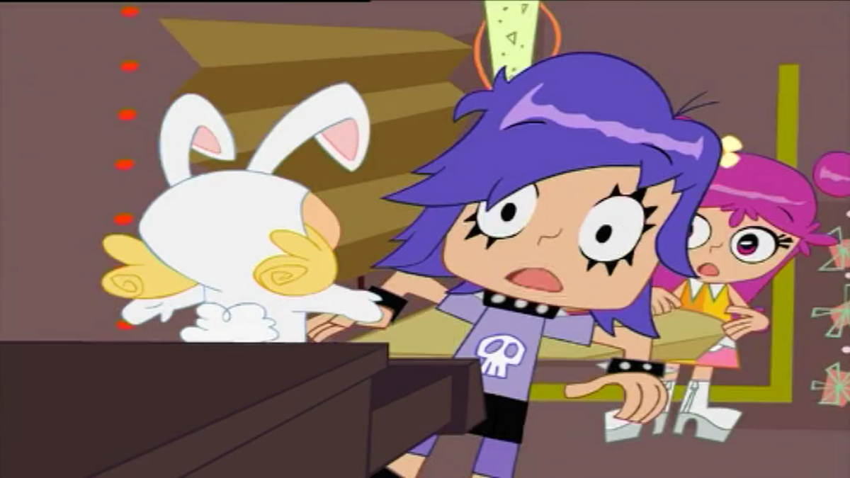 Last time on "DMAN re-attempts to talk about every single CN original in existence", dman talked about the origin point for many loved classics on the network. Today's show is not one of them. I mean it could still be good, but it's not from the What a Cartoon! Show so it's not a classic in that sense. Honestly, I'm struggling to introduce this one, so let's just see what dman has to say already. #23: Hi Hi Puffy AmiYumi "Dis-Harmony" [November 19, 2004] So, remember when CN gave the band who sang the Teen Titans theme their own show? Well, if I'm being honest, I can't say I do. There's not much for me to remember from this one. The only bits I do recall are a live-action scene where a janitor plays the drums and the slightly different CN logo at the end. In other words, this show came out right around the time when I was becoming aware of what I watched on television, but not yet fully aware. Who knows what this show holds? Will the music make me lose control? Let's find out! The episode begins with the titular band finishing up another show, which unfortunately doesn't go too well since the audience is filled with unimpressed yokels. In the backroom, Ami and Yumi lament about their manager Kaz, mentioning that he doesn't know how to book gigs in places where people actually appreciate them. Right on cue, Kaz bursts in and introduces the girls to the winner of their fan contest, Harmony. It turns out she's a full-on obsessive fan, to the point where she knows about every little detail of Ami and Yumi's lives, and has even made puppets in their likeness. Needless to say, the girls are both impressed and creeped out. After they give Harmony small tokens of appreciation, Kaz forces the fan out of the room and the three hit the road. However, their run-ins with Harmony are far from over, as she immediately appears in their dresser wearing bunny pajamas and...sniffing all of their socks. Eugggh. Things only get even more out of hand when Harmony is caught licking Yumi in a photo booth and massaging Ami's feet during a mud bath. Cue a montage of the girls trying to escape their #1 fan, but failing every time. Even when traveling to the moon they aren't safe! The girls ultimately assign the problem of dealing with their stalker to Kaz, since he got them into this mess. But upon hearing Kaz singing the show's theme song in the trailer, Harmony becomes obsessed with him instead, and he runs off in terror. Though initially relieved, Ami and Yumi comically regret their decision instantly and run outside of the trailer to get their #1 fan back. The end. Well...that certainly was an episode of Hi Hi Puffy AmiYumi! I won't mince words here; this one didn't do it for me. I don't hate it, but there's nothing here that gives me much of a reason to return to it. It gets some points for the occasional funny bits (see the image above), but any good will that brings is canceled out by how lackluster the animation is. The backgrounds are often blank, the characters are rarely expressive, no character design stands out if you exclude the main cast, I could go on. I can see why some of those elements would make other people fans of this show, but it just wasn't my bag. Overall, I consider this one mediocre. I'm not one to dismiss all celebrity cartoons as media that only exists to build up the egos of their protagonists (just look at my Class of 3000 post), but this one feels just like that. Pass. THE BOTTOM LINE: Bye Bye, Puffy AmiYumi. You will be missed, but it won't be by me. RATING: 5/10 (meh) We're approaching the homestretch here, folks! Let's see what the Wheel says is next on the docket... Stay tuned for dman's next talk-about. 3 shows remain...